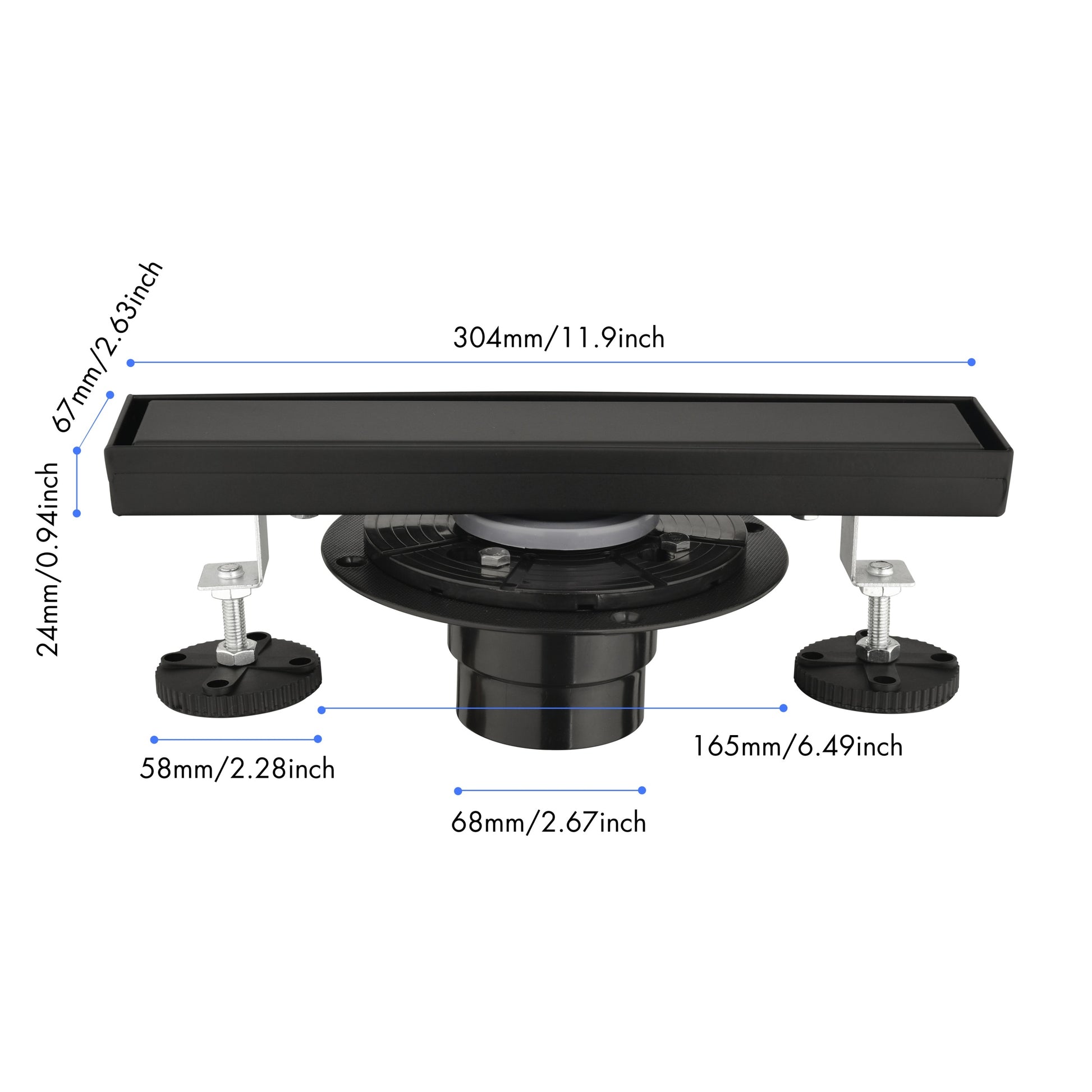 12 Inches Linear Shower Drain With Removable Cover, 304 Stainless Shower Drain Included Hair Strainer And Leveling Feet, Flange Matte Black Stainless Steel