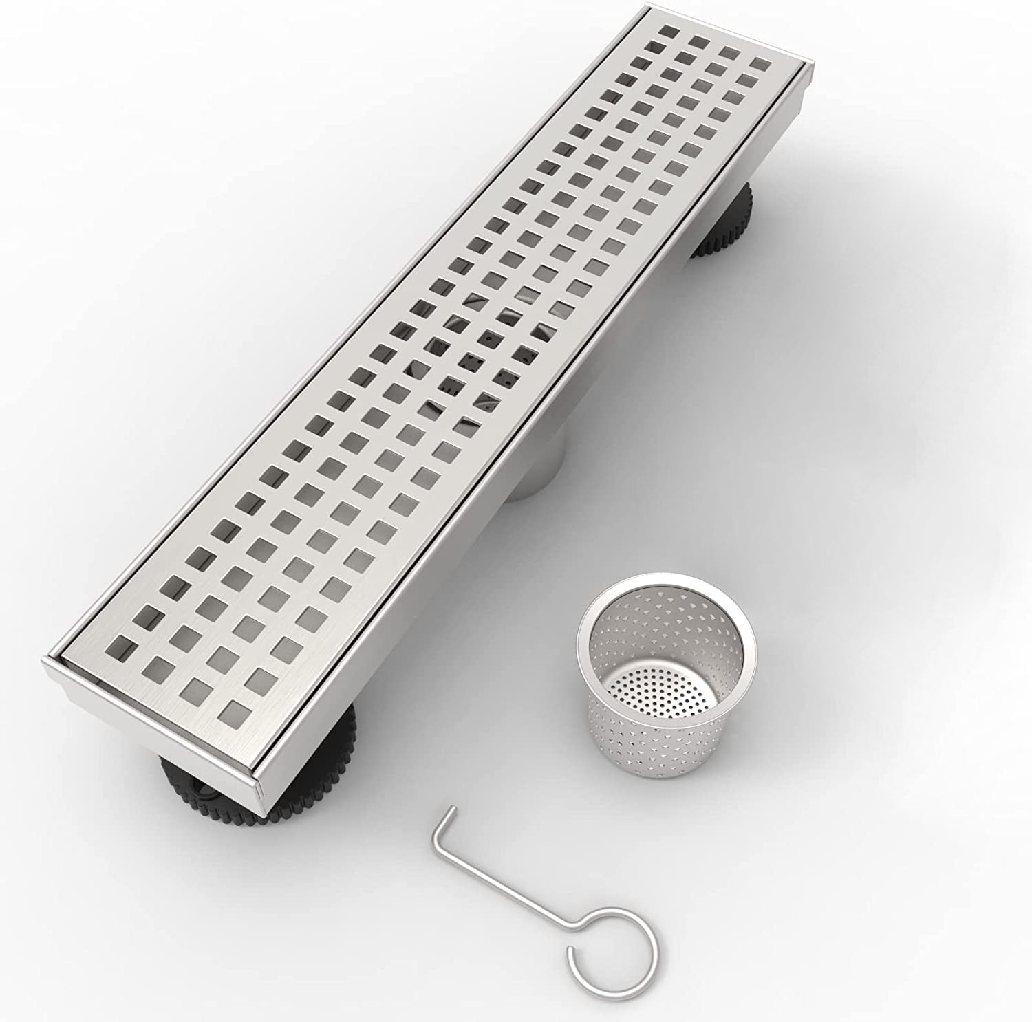 12 Inches Linear Shower Drain With Removable Quadrato Pattern Grate, 304 Stainless Shower Drain Included Hair Strainer And Leveling Feet Brushed Nickel Stainless Steel