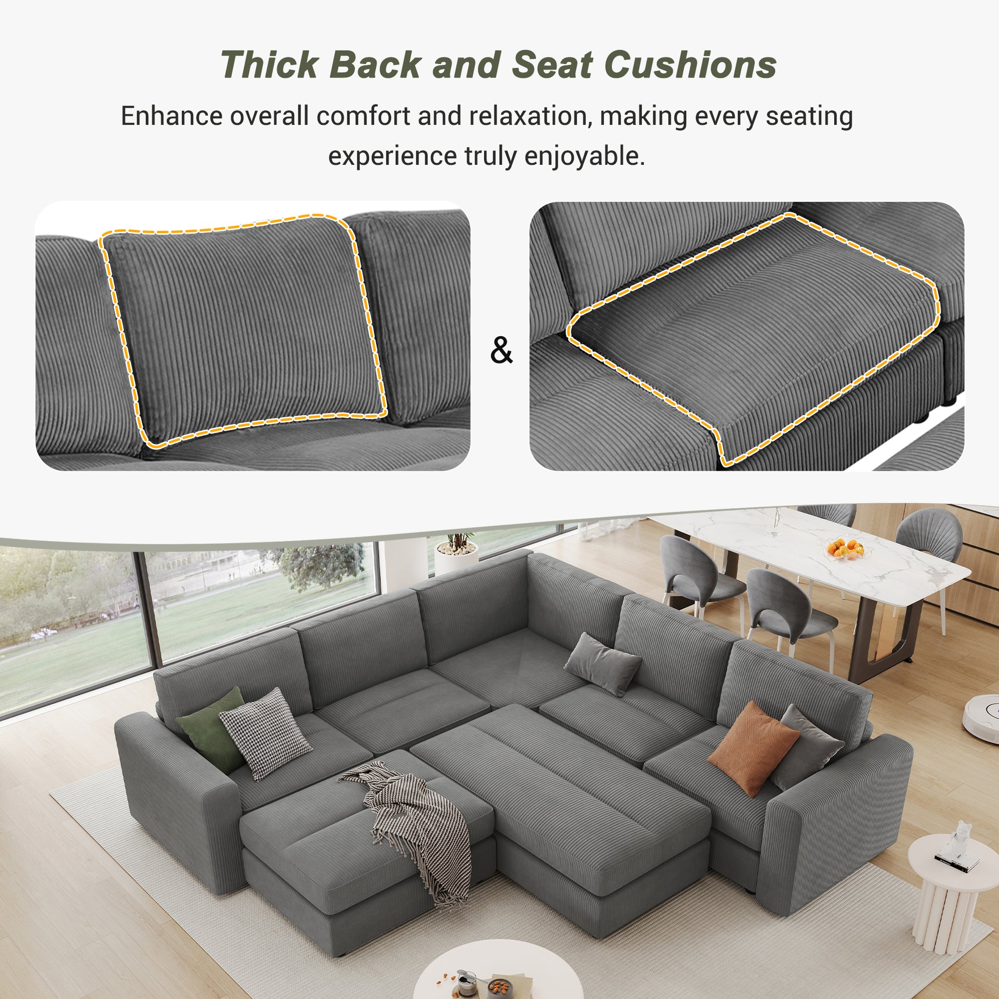 121.3" Sectional Couch Sofa Bed Modular Sofa With Two Movable Ottomans For Living Room Old Sku:N719S001640E , Gray Gray Foam Corduroy 7 Seat
