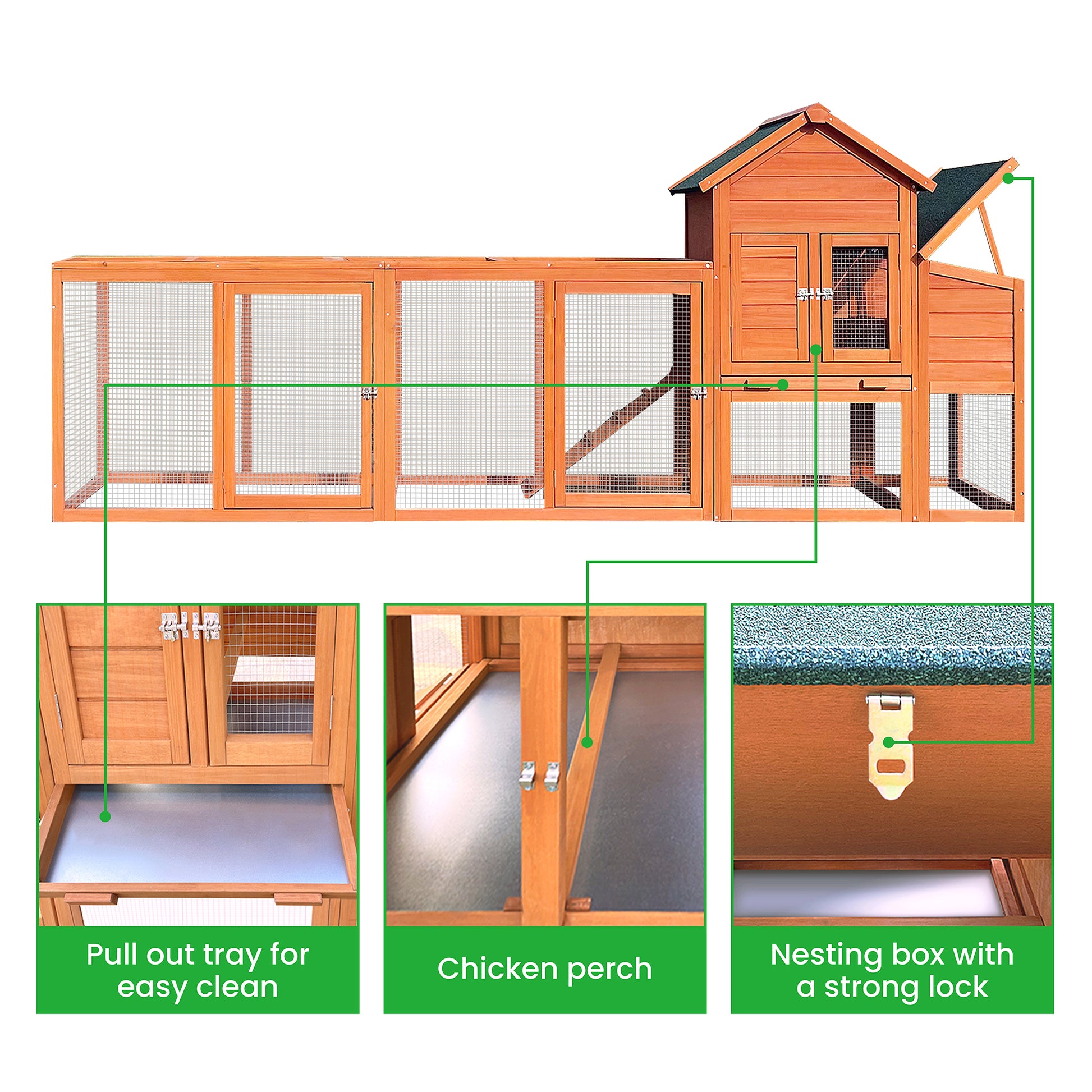122 Large Wooden Chicken Coop, Hen House With Nest Box ,Wire Fence Poultry Cage Natural Wood