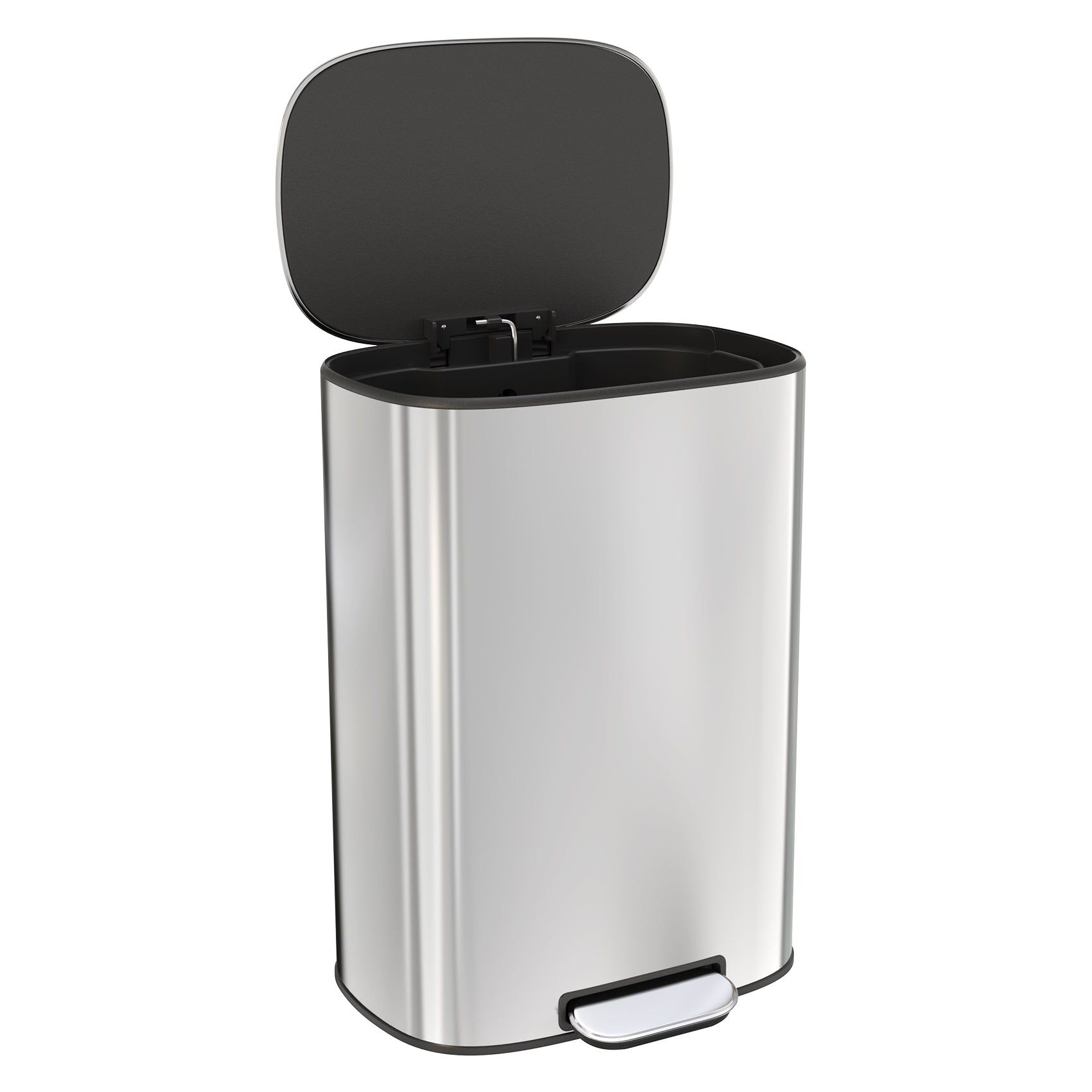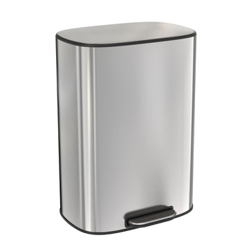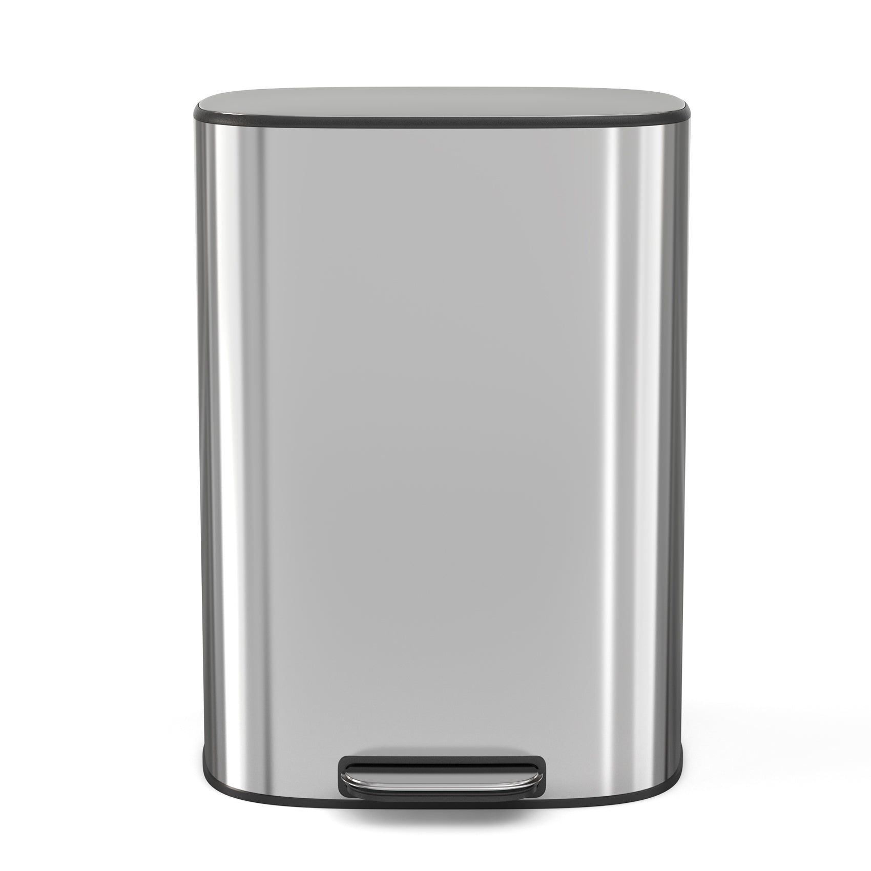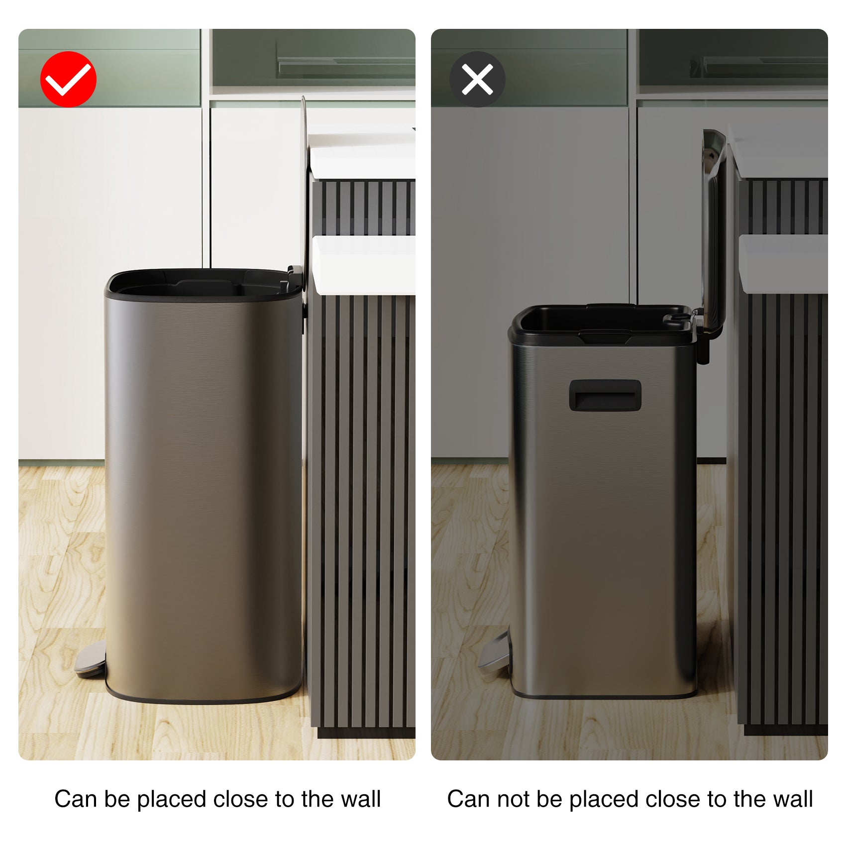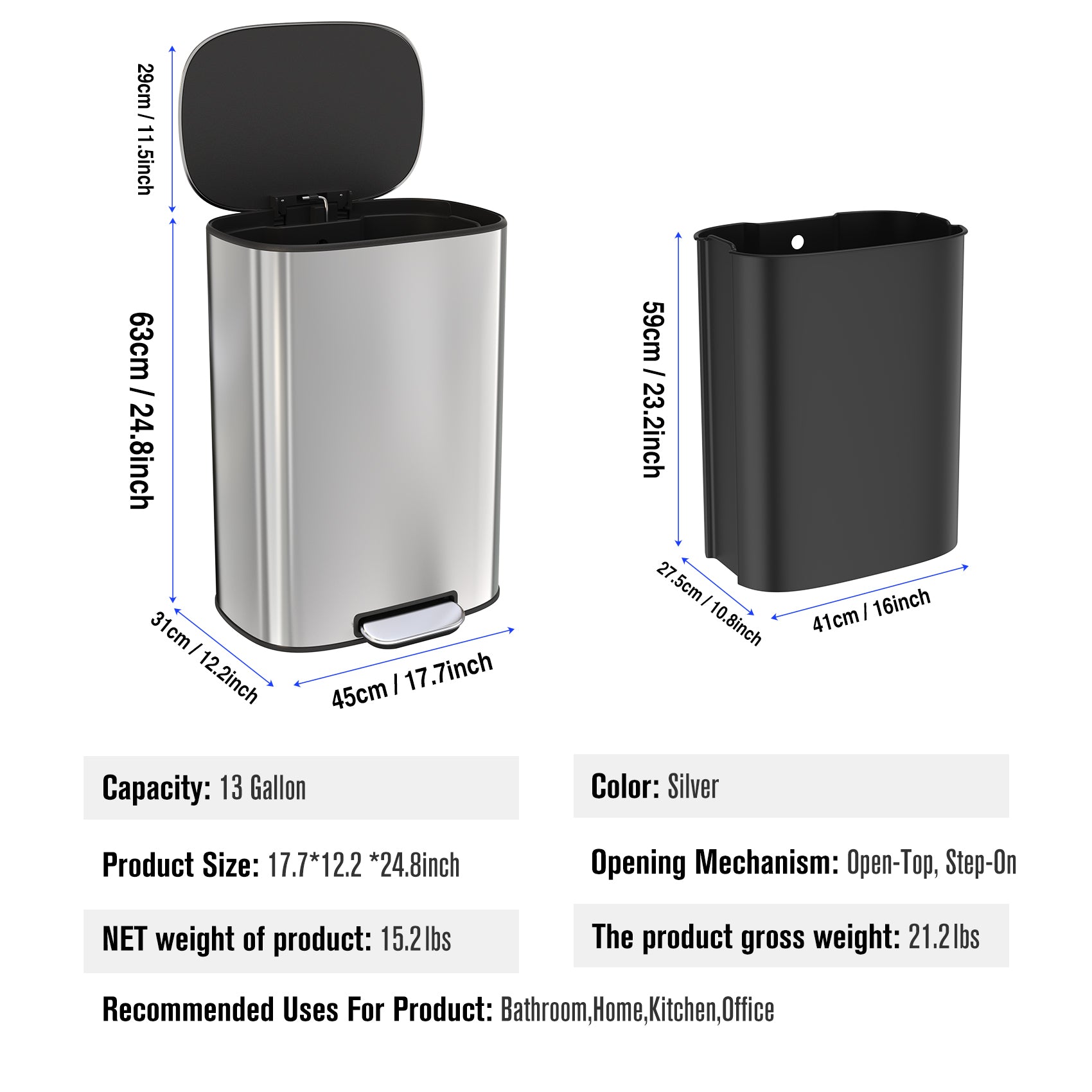 [LARGE Capacity Trash Can] - 13.2 gallon/50 liter. The huge capacity definitely meets your daily use, this can fits most brands of 13 gallon trash bags. It can be a good helper for your kitchen and make your room clean and tidy. The sophisticated rectangular appearance also makes it suitable for a variety of occasions. It makes a shining impression from the outside. [soft Close Mute Lid] - Lid features a stay-open mode to easily remove and replace garbage bags and dispose waste. Soft-close lid reduces noise from opening/closing and extends product life span. The lid closes with hardly any sound, if the person next to you is taking a nap, there is no need to worry about disturbing them with this bin. [step Trash Can] - Rectangular stainless steel trash can with manual foot lever. Fingerprint-proof, smudge resistant, and durable stainless steel exterior. Heavy-duty plastic interior bucket can be easily removed for convenient waste disposal. Removable plastic liner and stay open lid lock make bag changes and cleaning easy. [thickened Stainless Steel Garbage Can] - High quality all stainless-steel thickened trash can body by 0.45mm stainless steel material production. Compared to most 0.3mm materials trash can on the market, our stainless steel trash can are less prone to deformation and are stronger in use! High-quality 410 stainless steel and Abs construted, our trashcan is build to last!