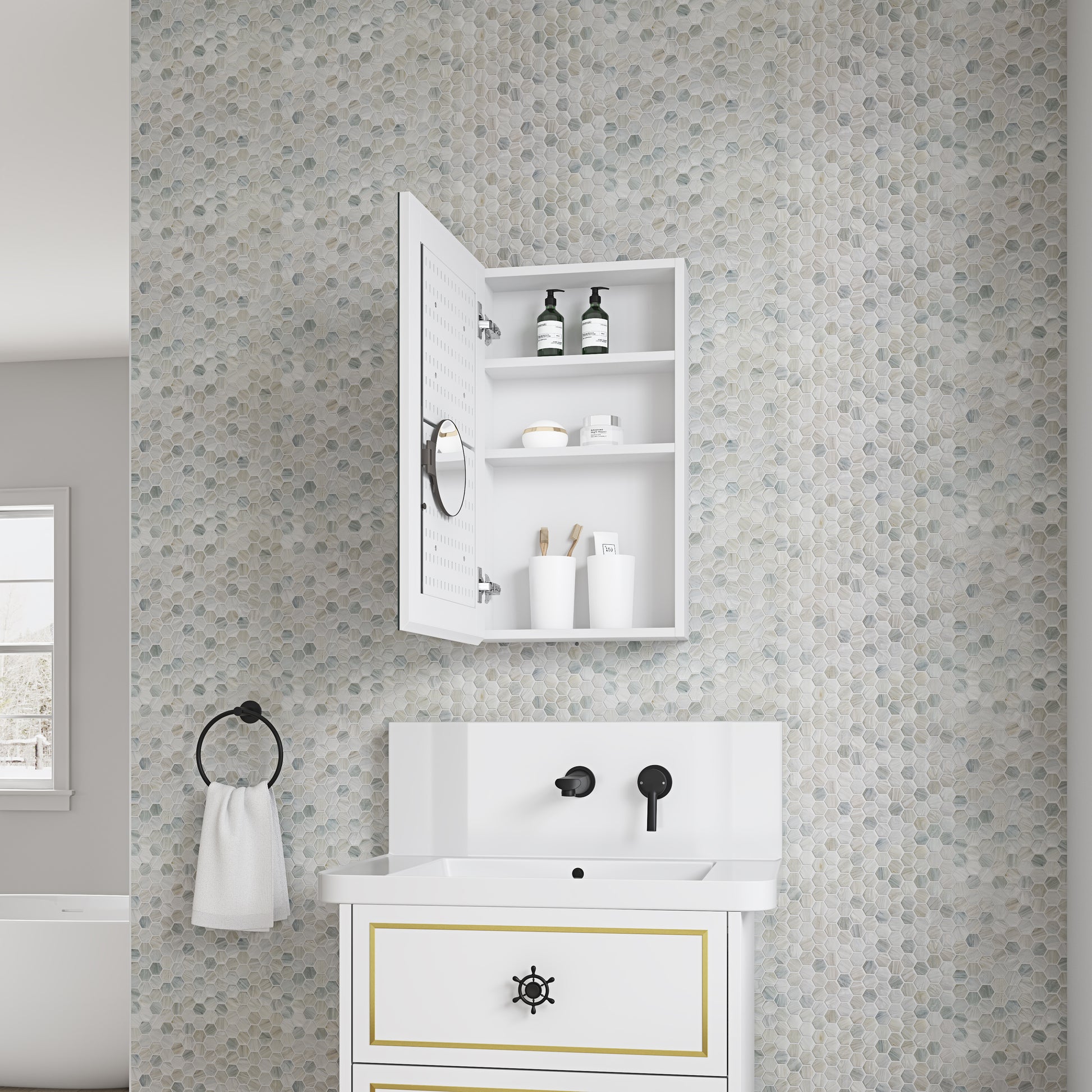 15'' W X 26'' H Bathroom Mirror Medicine Cabinet Wooden Door Medicine Cabinets For Bathroom, Wall Mounted Recessed Or Surface, Bathroom Mirror With Storage, Left Opening Door White Engineered Wood