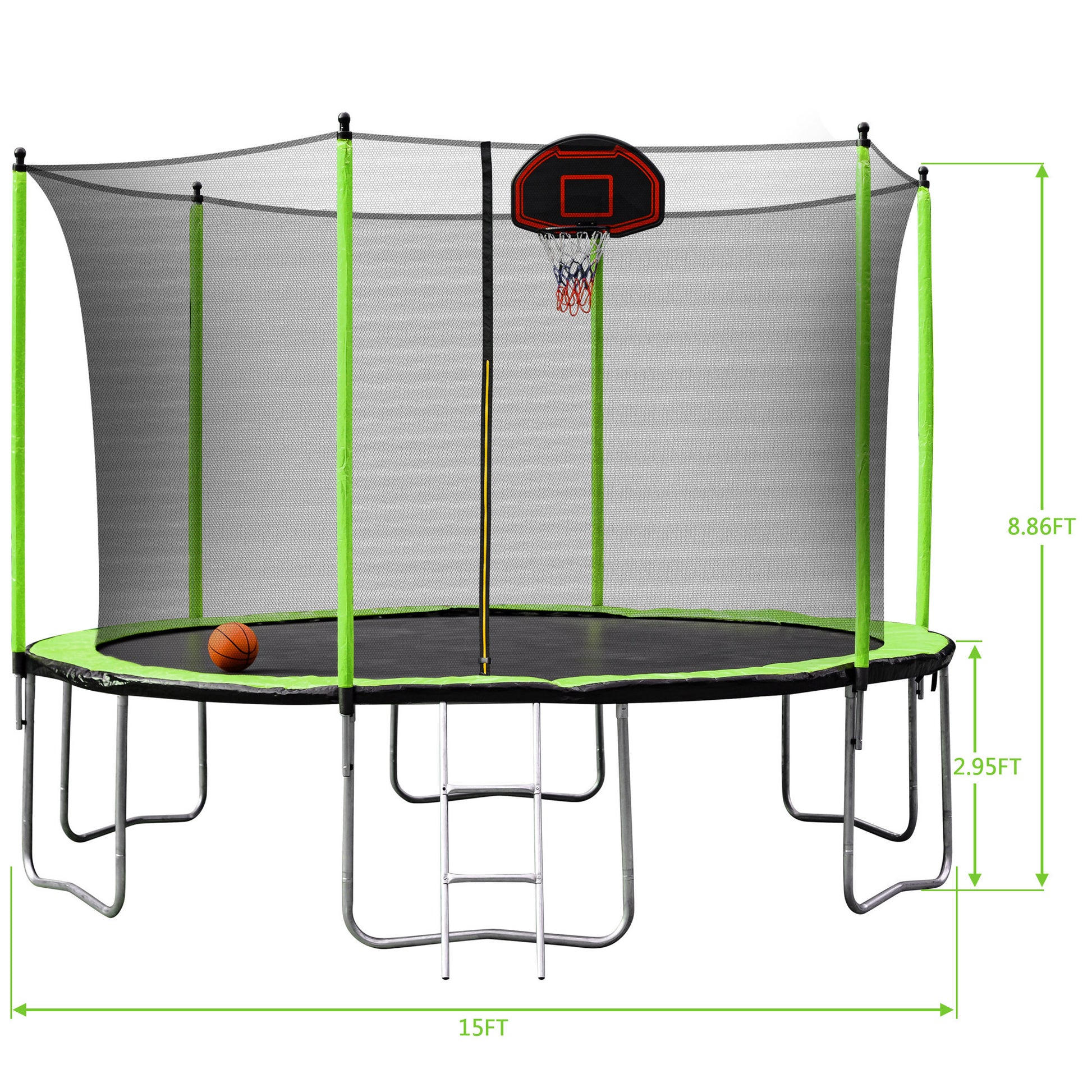 15Ft Trampoline With Basketball Hoop Inflator And Ladder Inner Safety Enclosure Green Green Steel