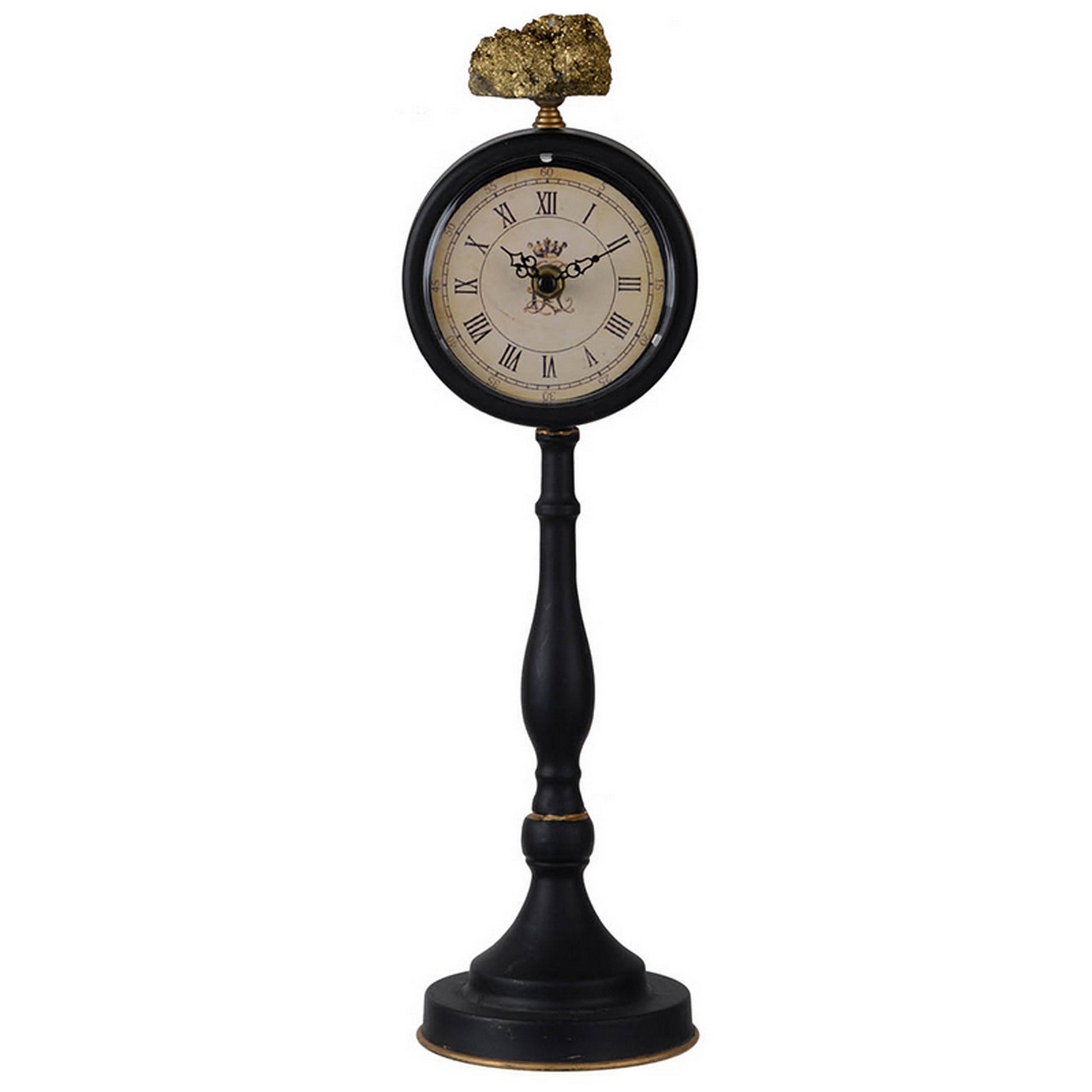 16 Inch Decorative Table Clock, Pedestal Stand, Black Metal, Stone Accent Black Gold Metal