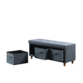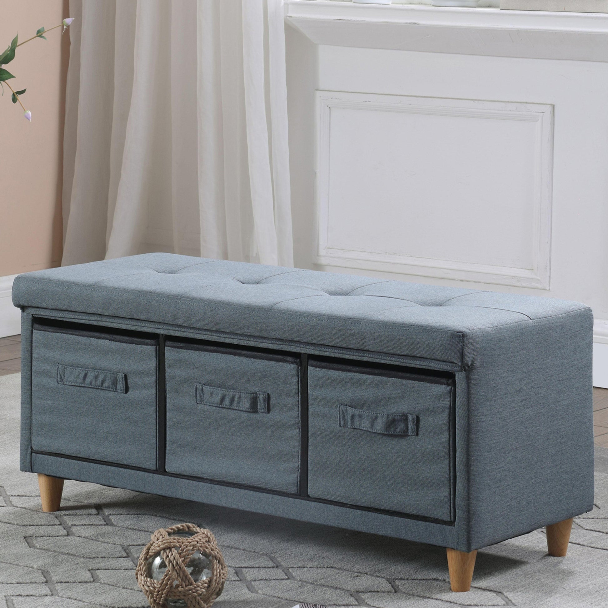 17.5" Magnolia Blue Gray Tufted Bench W Storage Basket Drawers Blue Gray Polyester