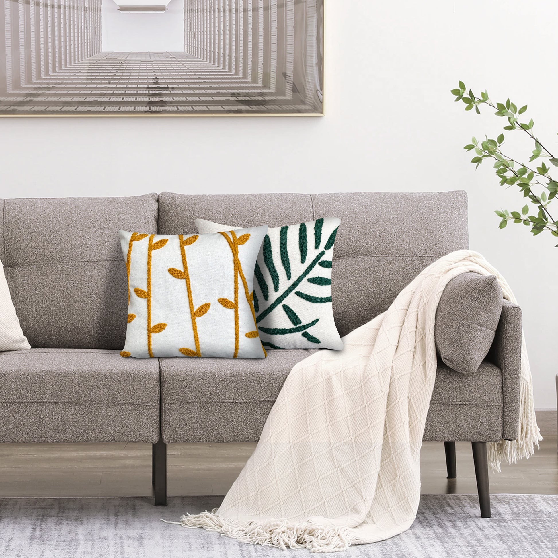 17 X 17 Inch 2 Piece Square Cotton Accent Throw Pillow Set, Leaf Embroidery, White, Green, Yellow White Cotton