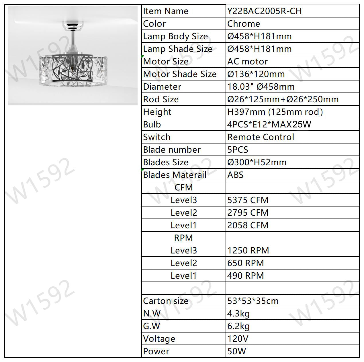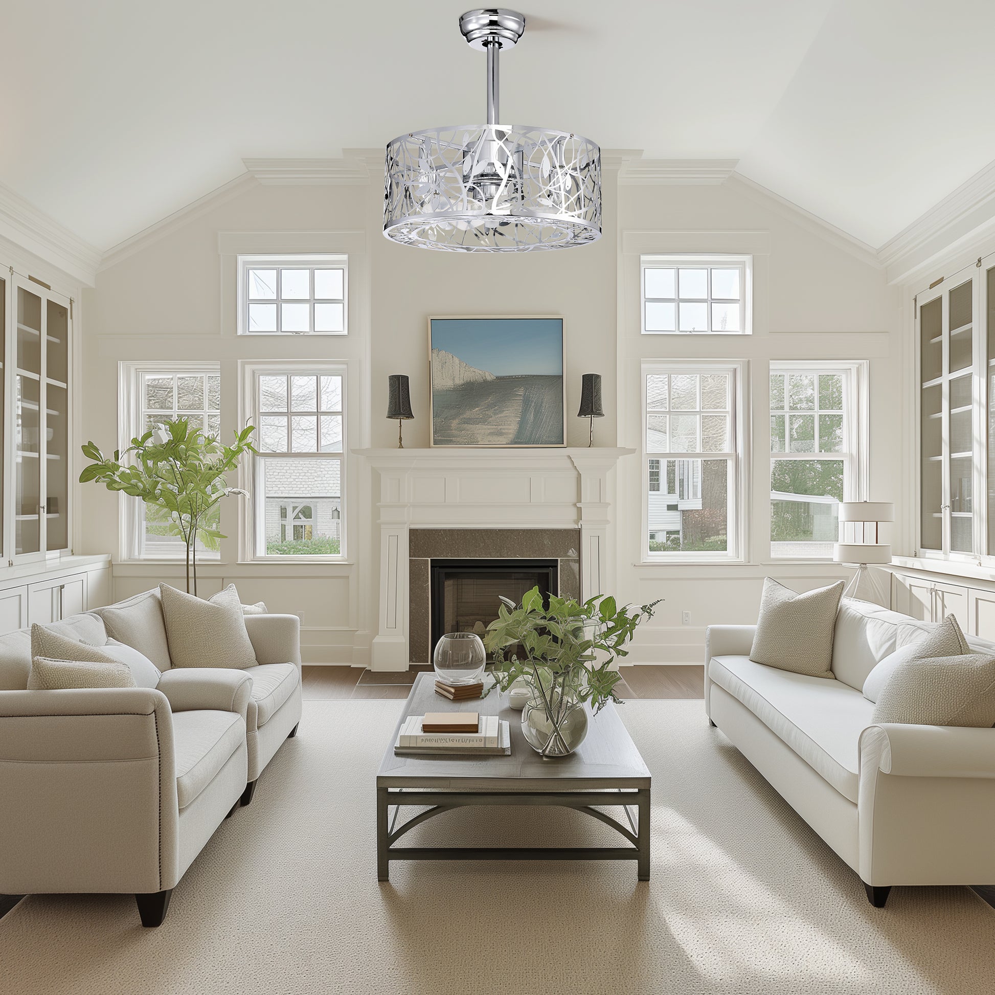 18'' Decor Forward Reverse 5 Blades Ceiling Fan Lamps,Cage Closed Industrial Style Vintage Fan Ceiling Fan With 3 Speeds Adjustable For Living Room, Bedroom, Kitchen Chrome American Design Abs Metal