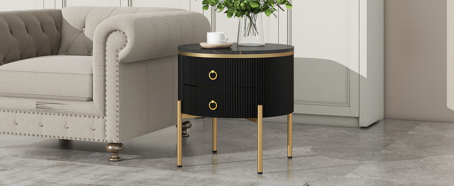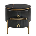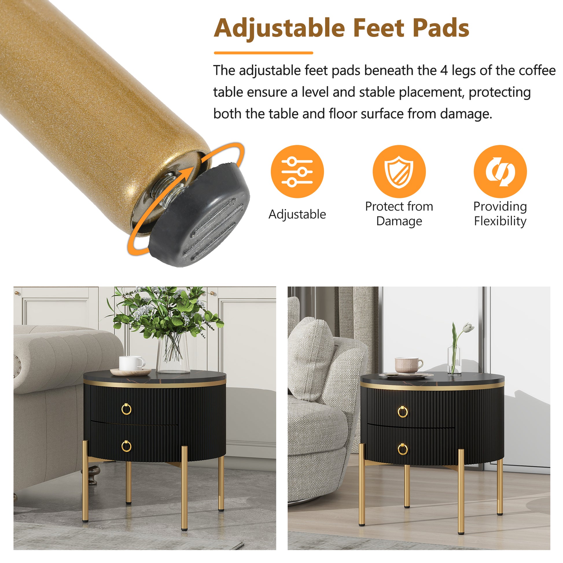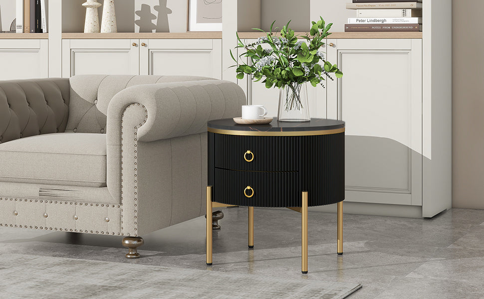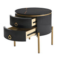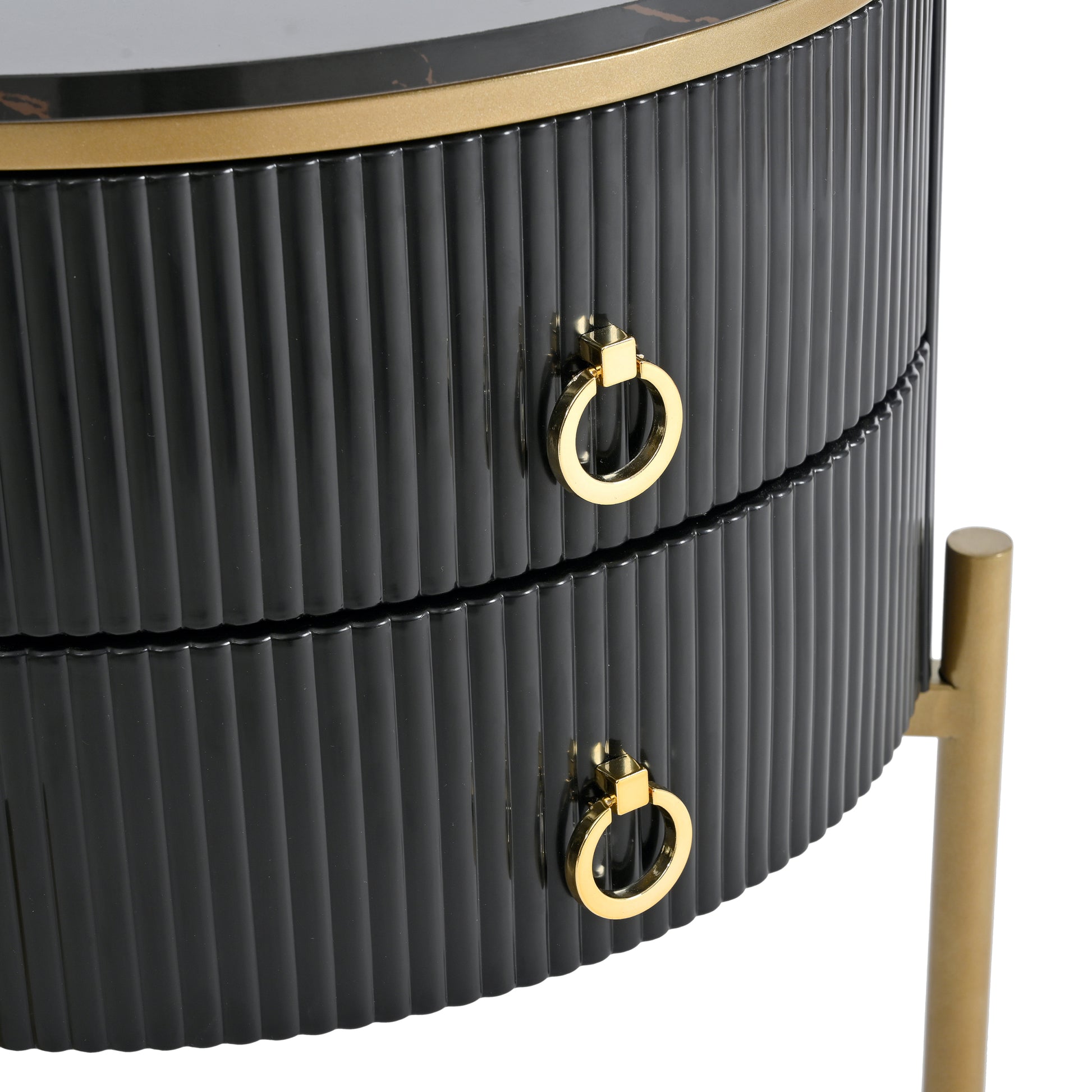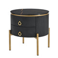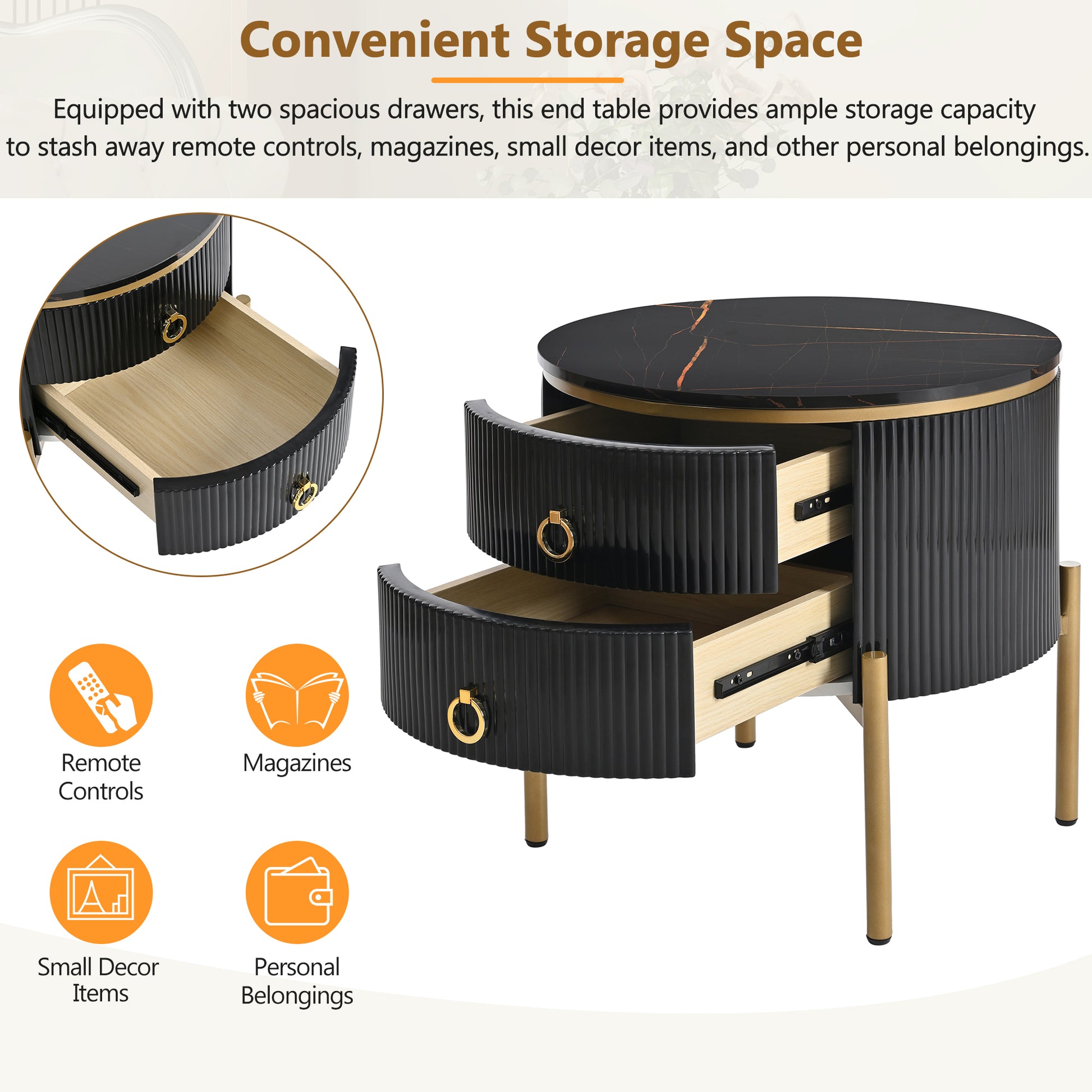 19.6'' Easy Assembly Round End Table With Storage Drawers, Fluted Nightstand With High Gloss Faux Marble Tabletop, Modern Coffee Table With Metal Legs And Handles For Living Room, Black Black Gold Primary Living Space Drawers Round Mdf Iron