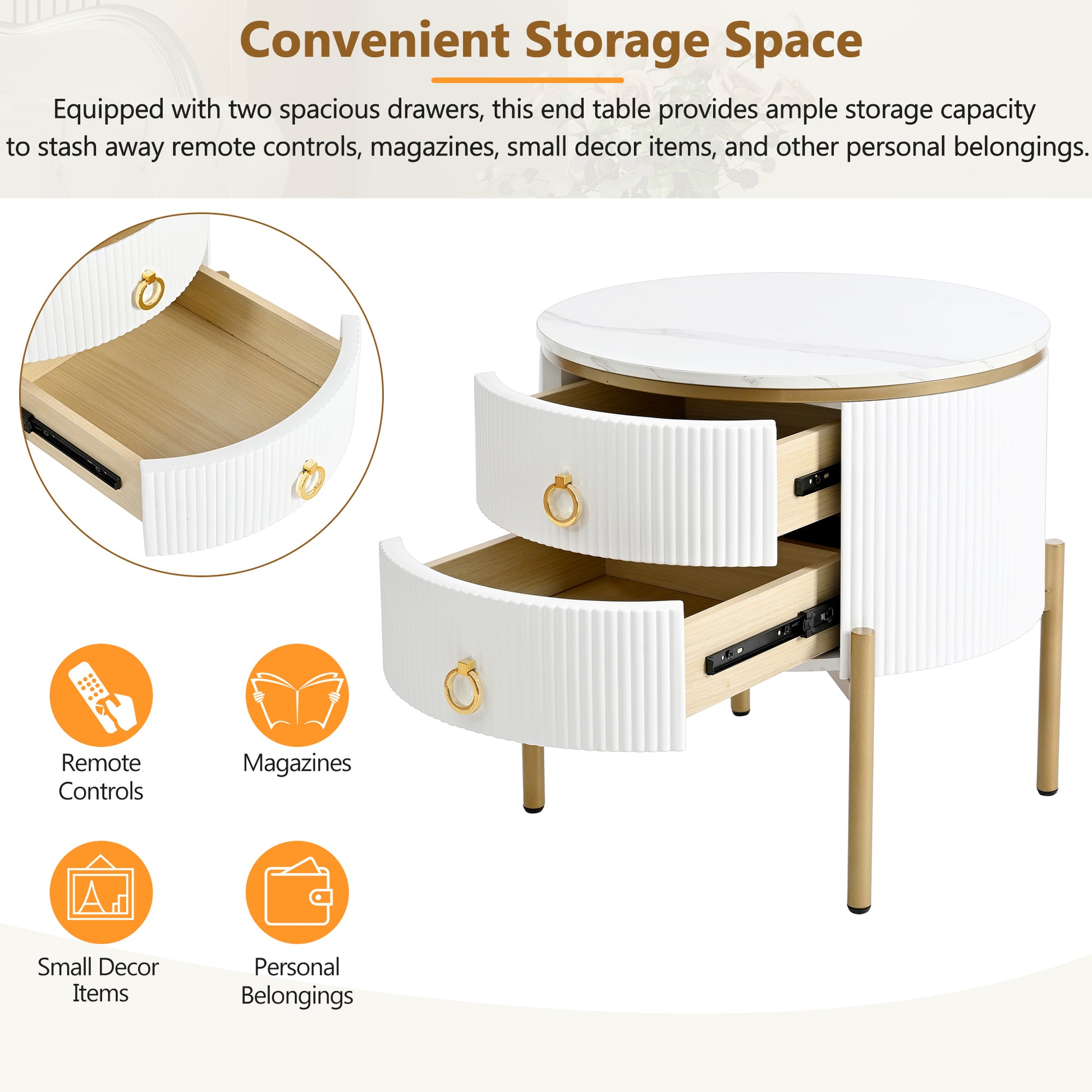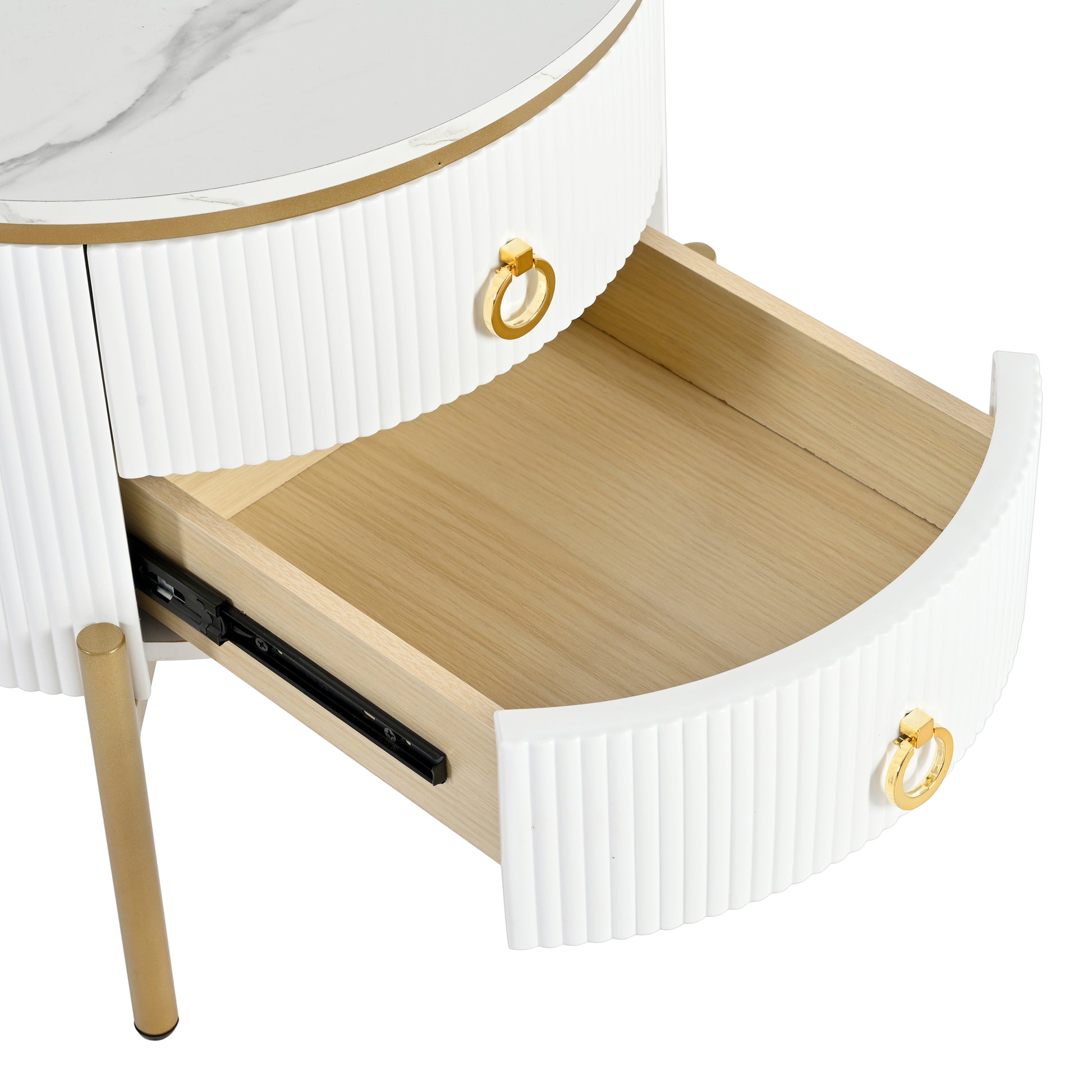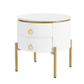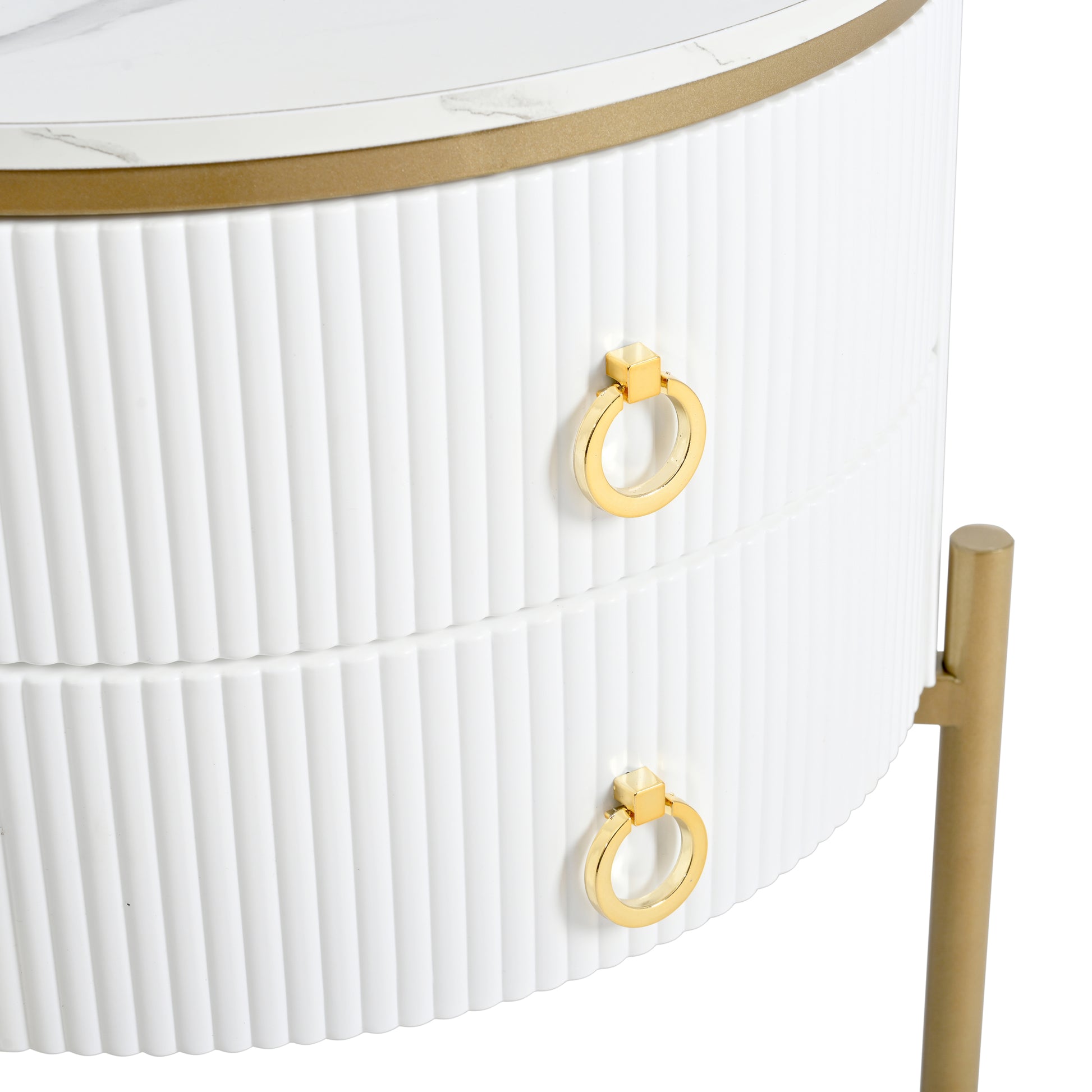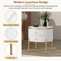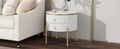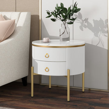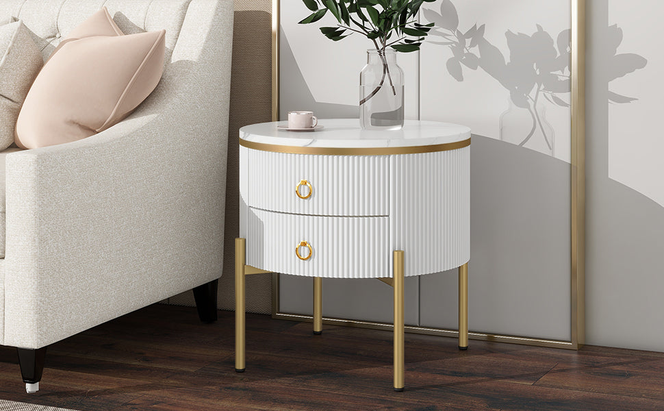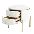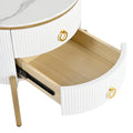 19.6'' Easy Assembly Round End Table With Storage Drawers, Fluted Nightstand With High Gloss Faux Marble Tabletop, Modern Coffee Table With Metal Legs And Handles For Living Room, White White Gold Primary Living Space Drawers Round Mdf Iron