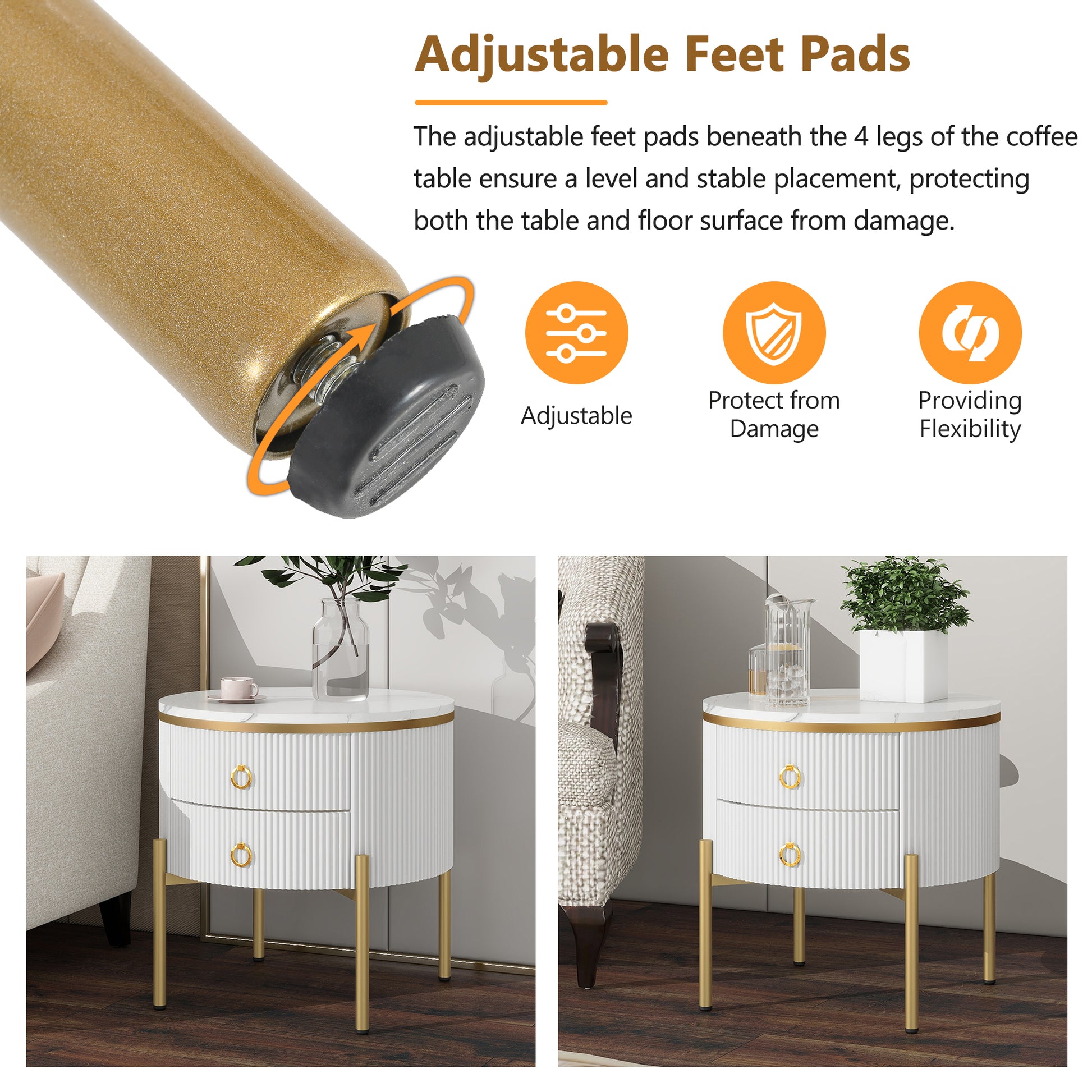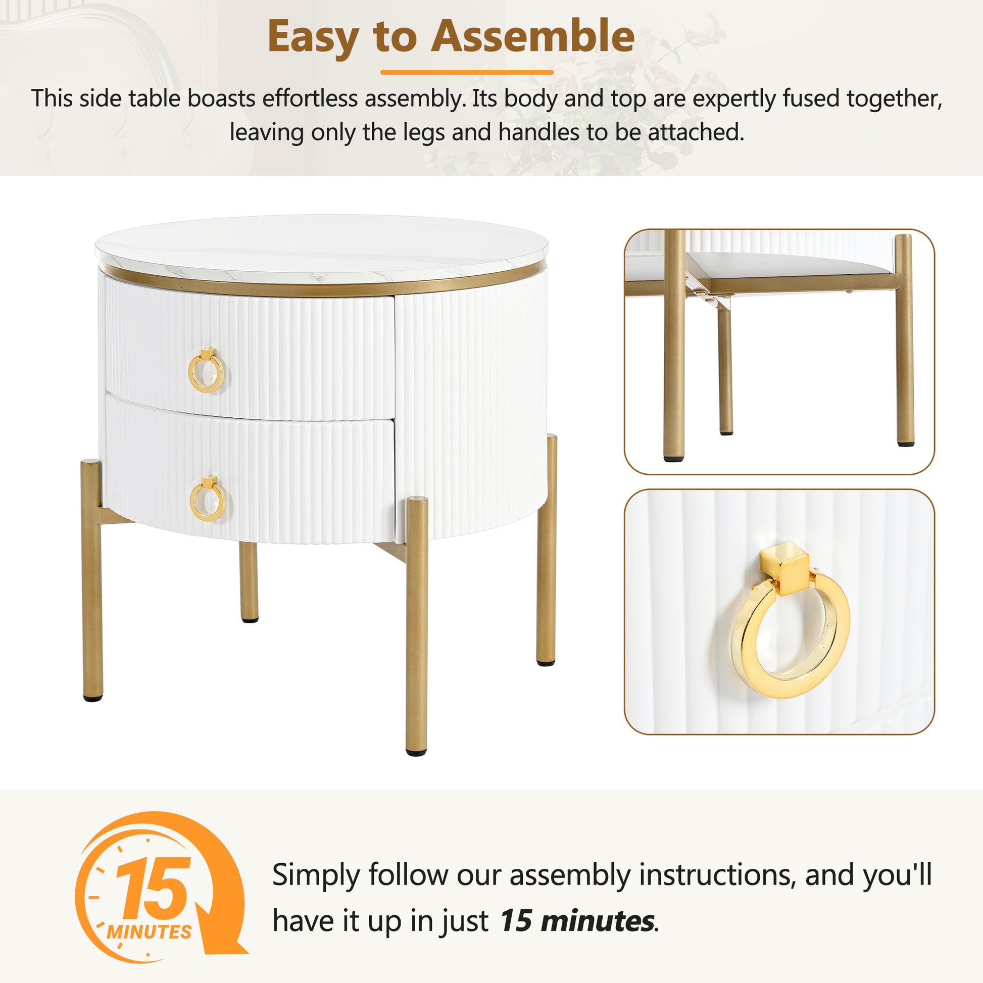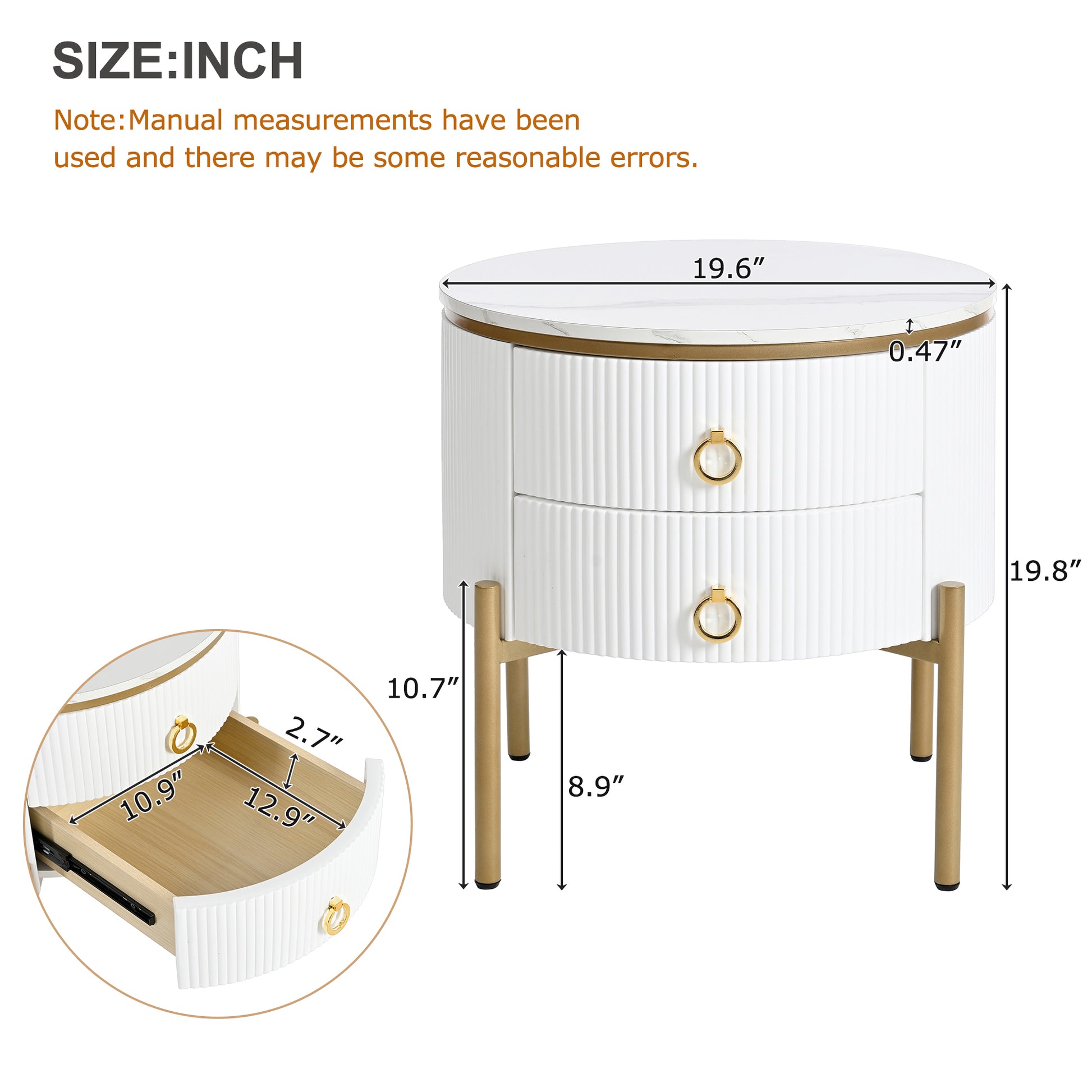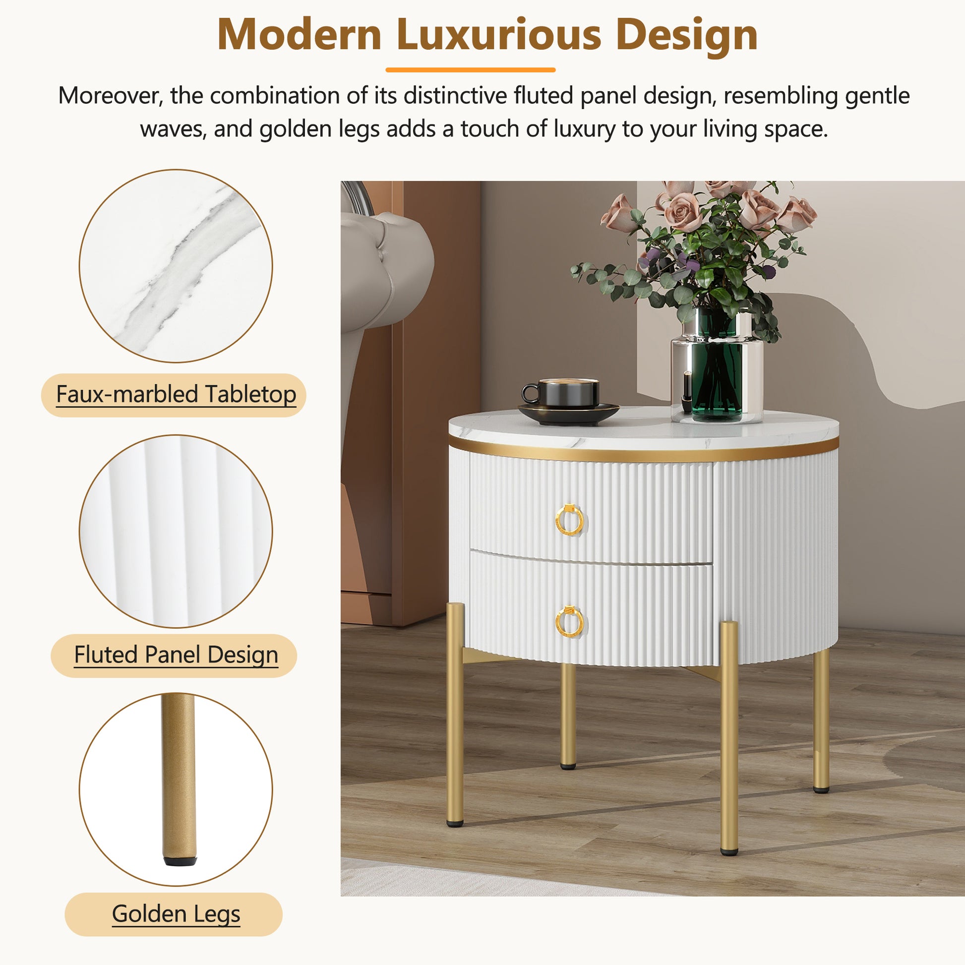 19.6'' Easy Assembly Round End Table With Storage Drawers, Fluted Nightstand With High Gloss Faux Marble Tabletop, Modern Coffee Table With Metal Legs And Handles For Living Room, White White Gold Primary Living Space Drawers Round Mdf Iron