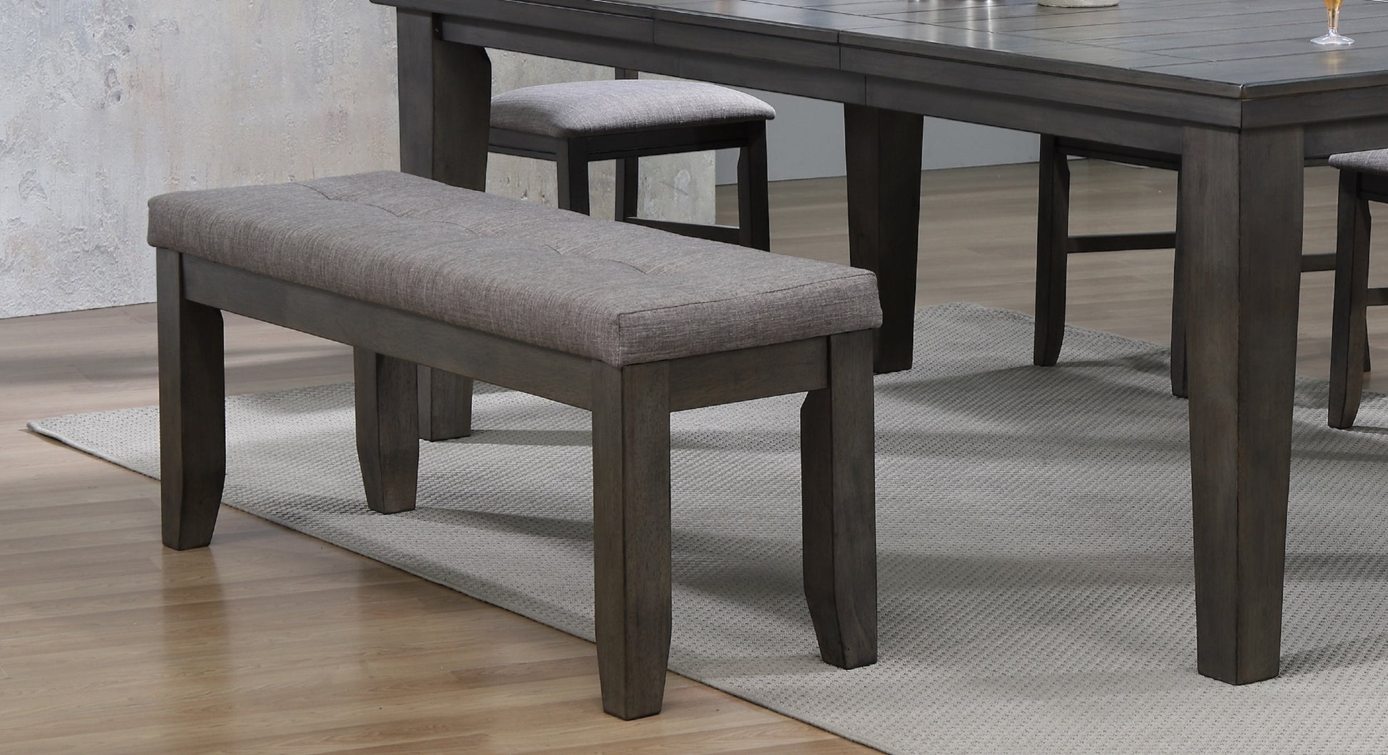Product Description: This bench adds great seating to complement the rectangular dining table. The tufted upholstery seat with the look of linen fabric adds chic sophistication to this contemporary-style bench with solid wood and veneer made.