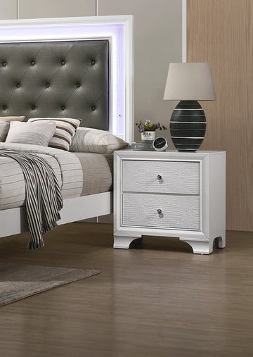 1Pc Modern Glam Style Crisp White Finish Two Drawer Nightstand Embossed Crocodile Pattern White Solid Wood