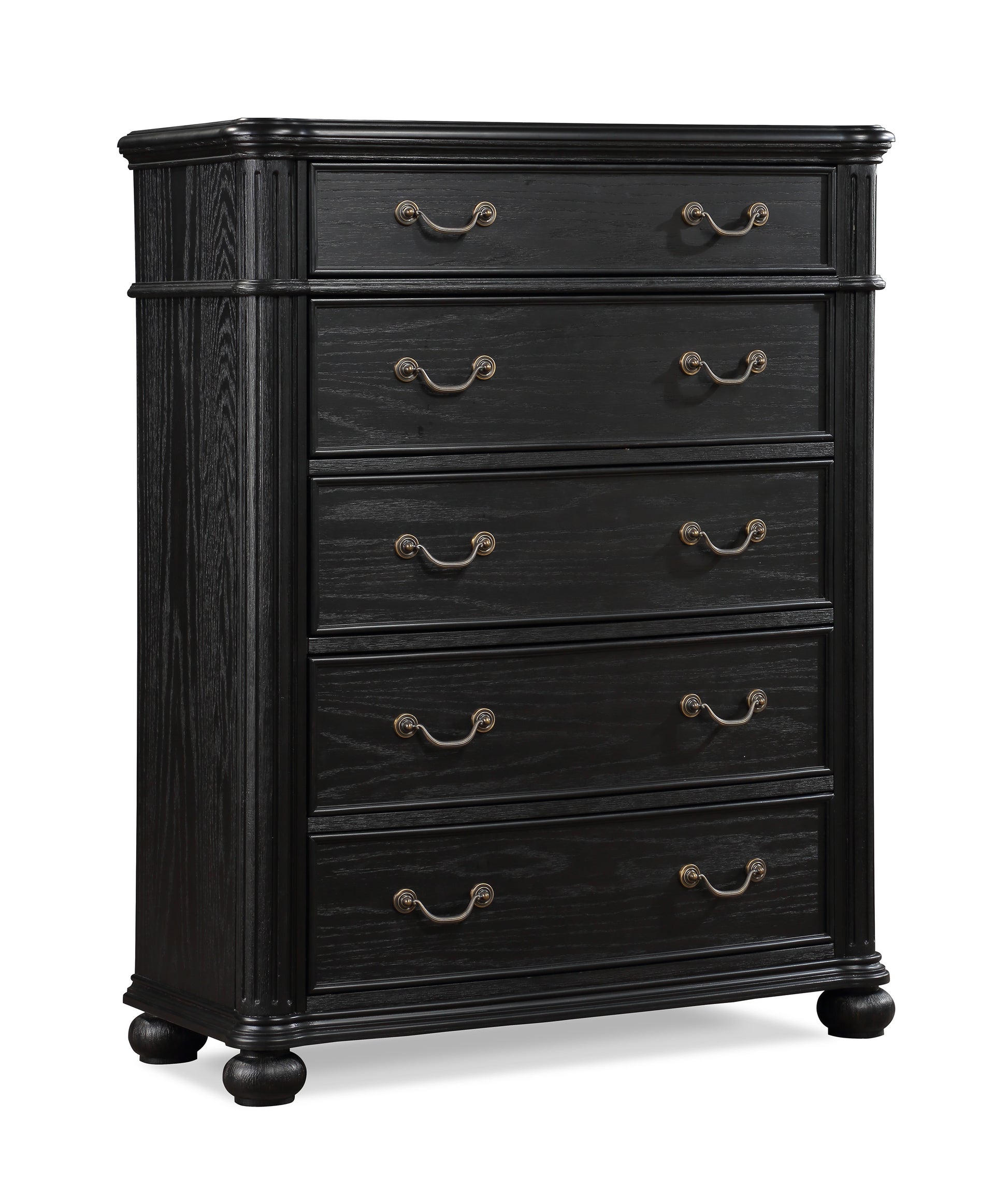 This Chest will surely make a statement in your bedroom. It features five drawers with drop handle pulls and bun feet.
