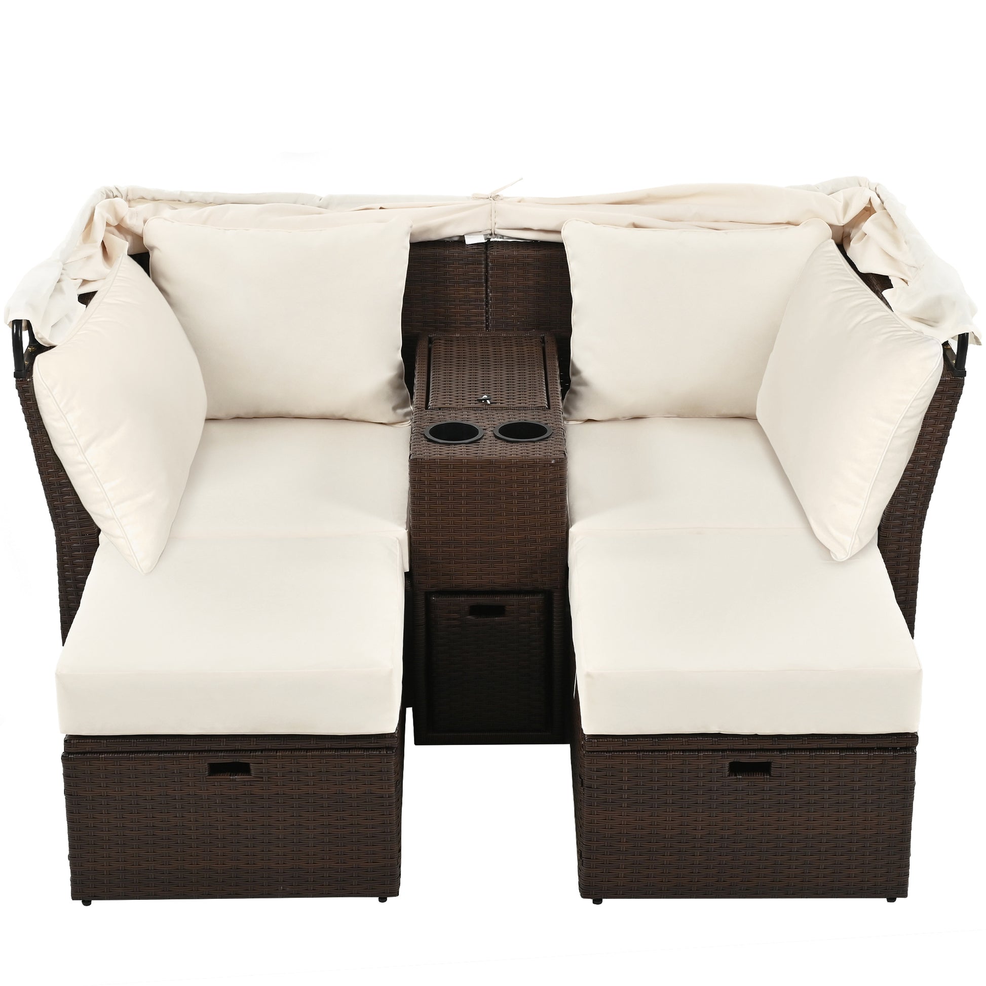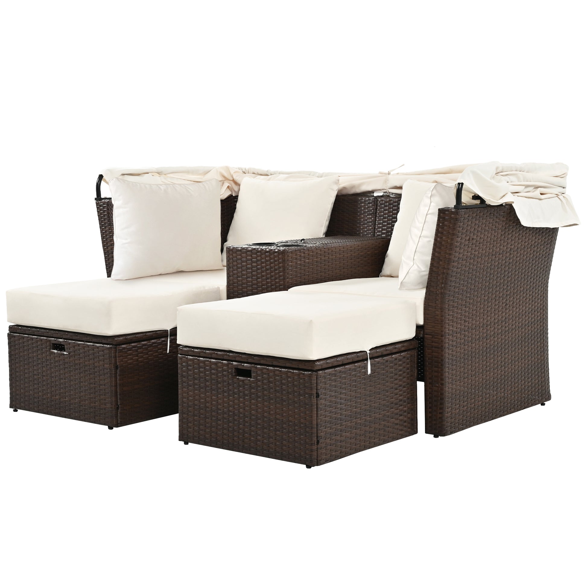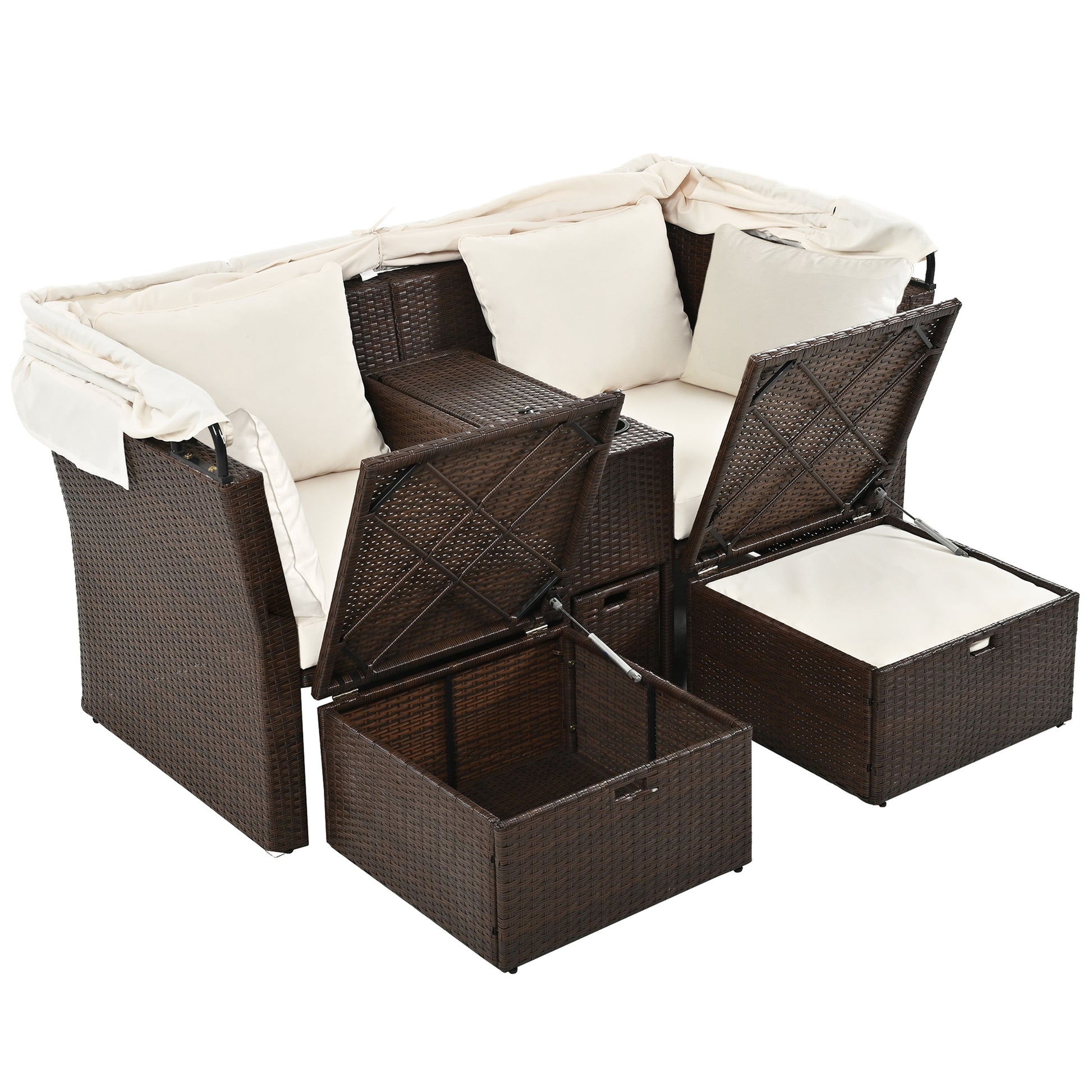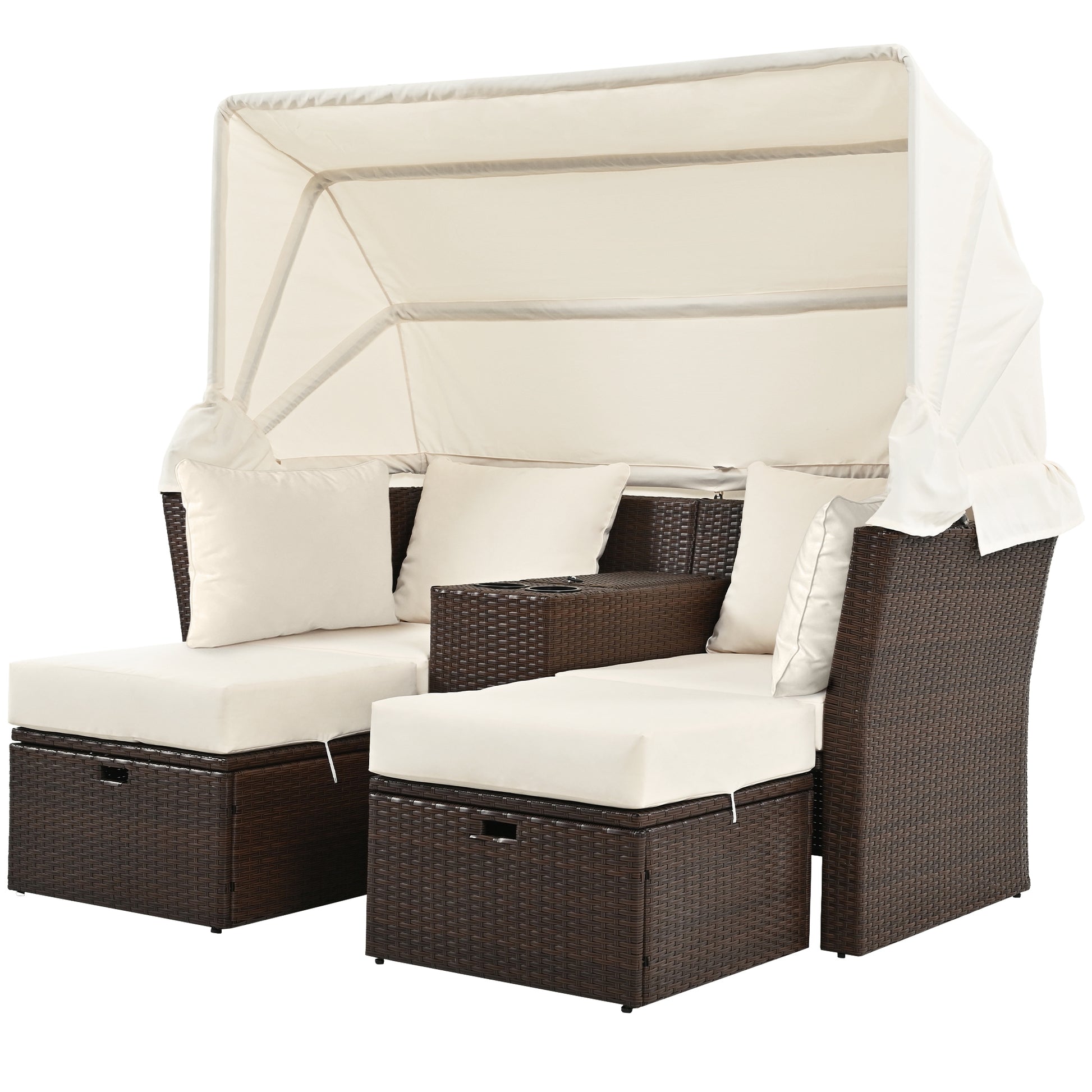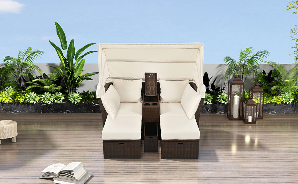 2 Seater Outdoor Patio Daybed Outdoor Double Daybed Outdoor Loveseat Sofa Set With Foldable Awning And Cushions For Garden, Balcony, Poolside, Beige Yes Beige Water Resistant Frame Water Resistant Cushion Garden & Outdoor Sectional Seating Groups Foam