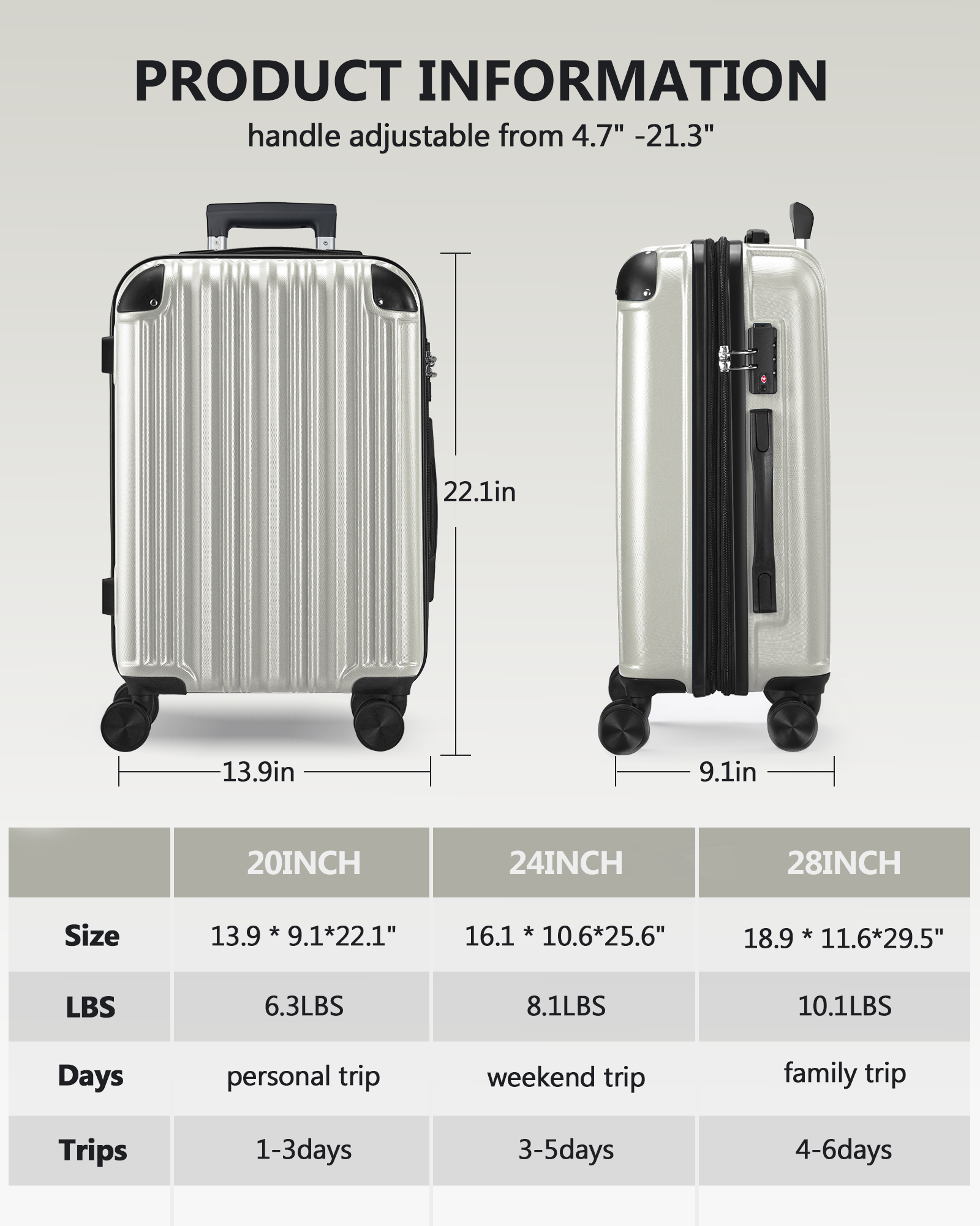 20 Inch Carry On Luggage With Tsa Lock& Double Spinner Wheels, Expandable For Large Storage Off White Abs