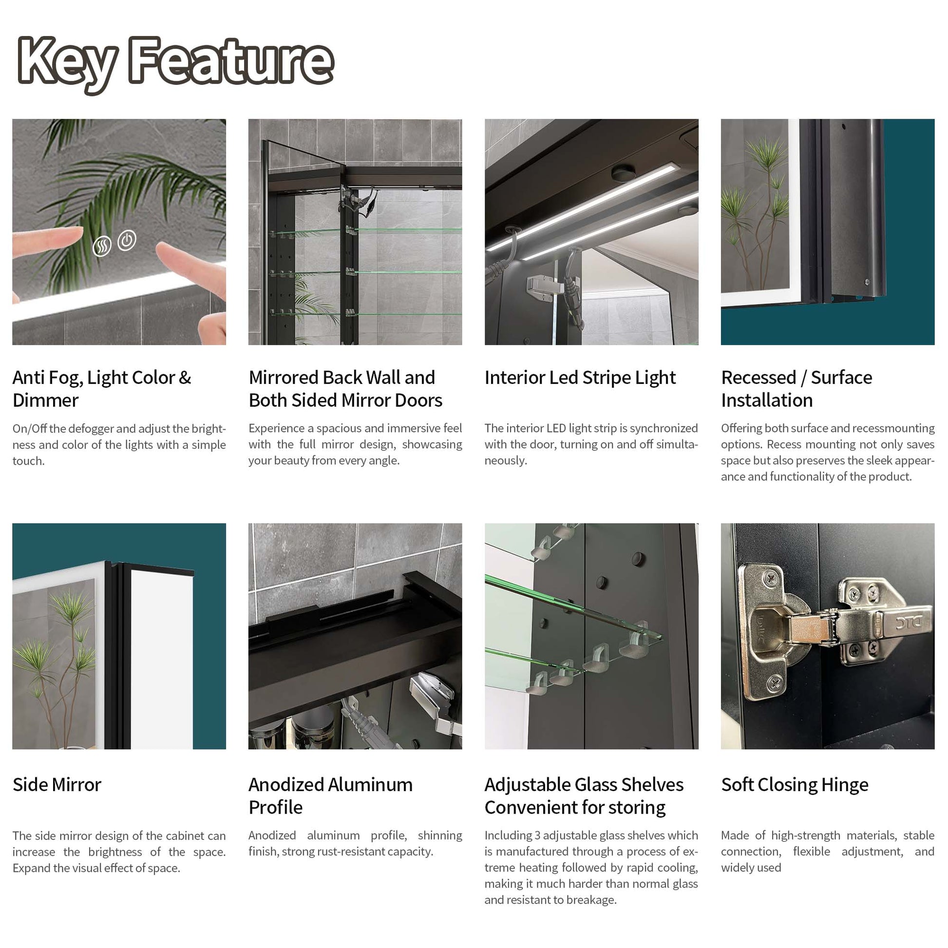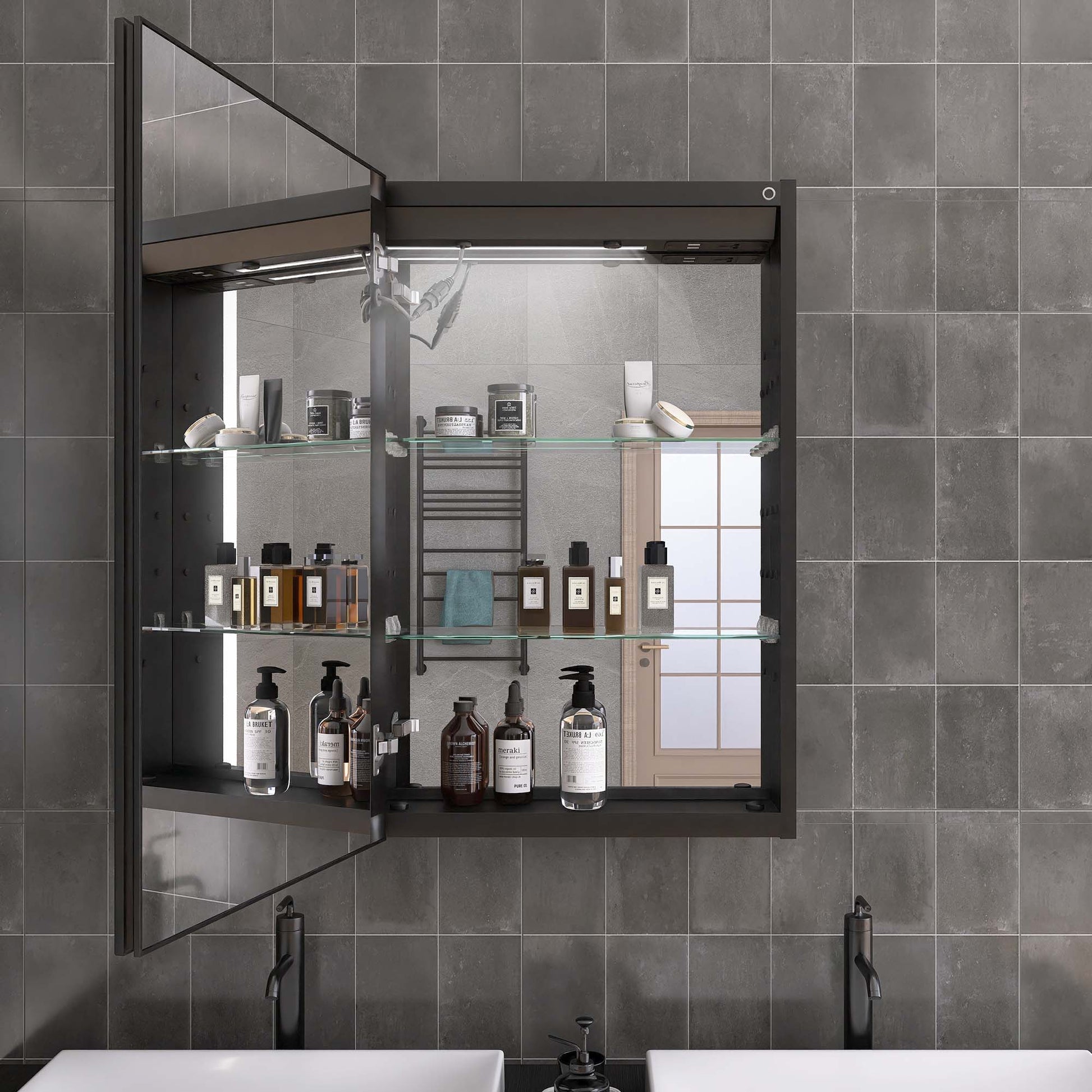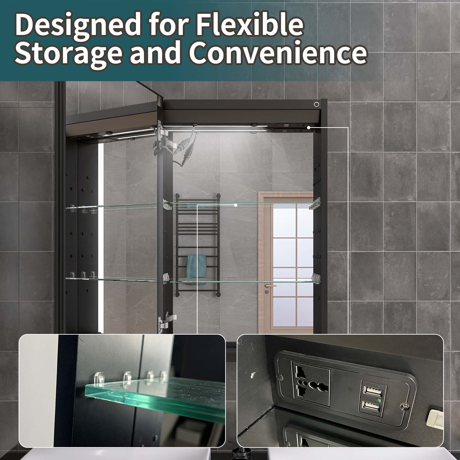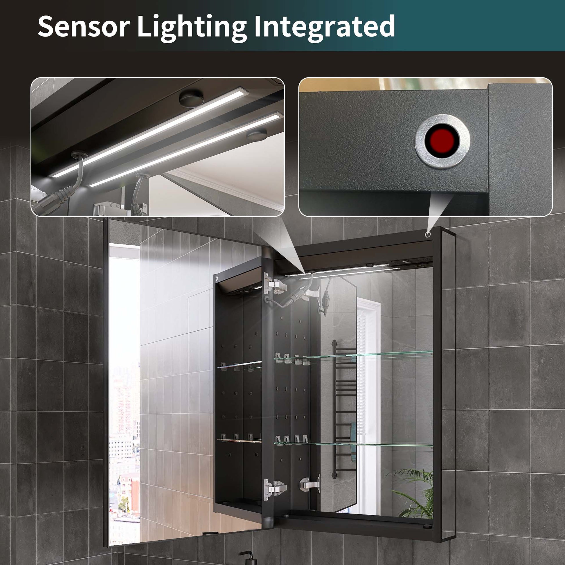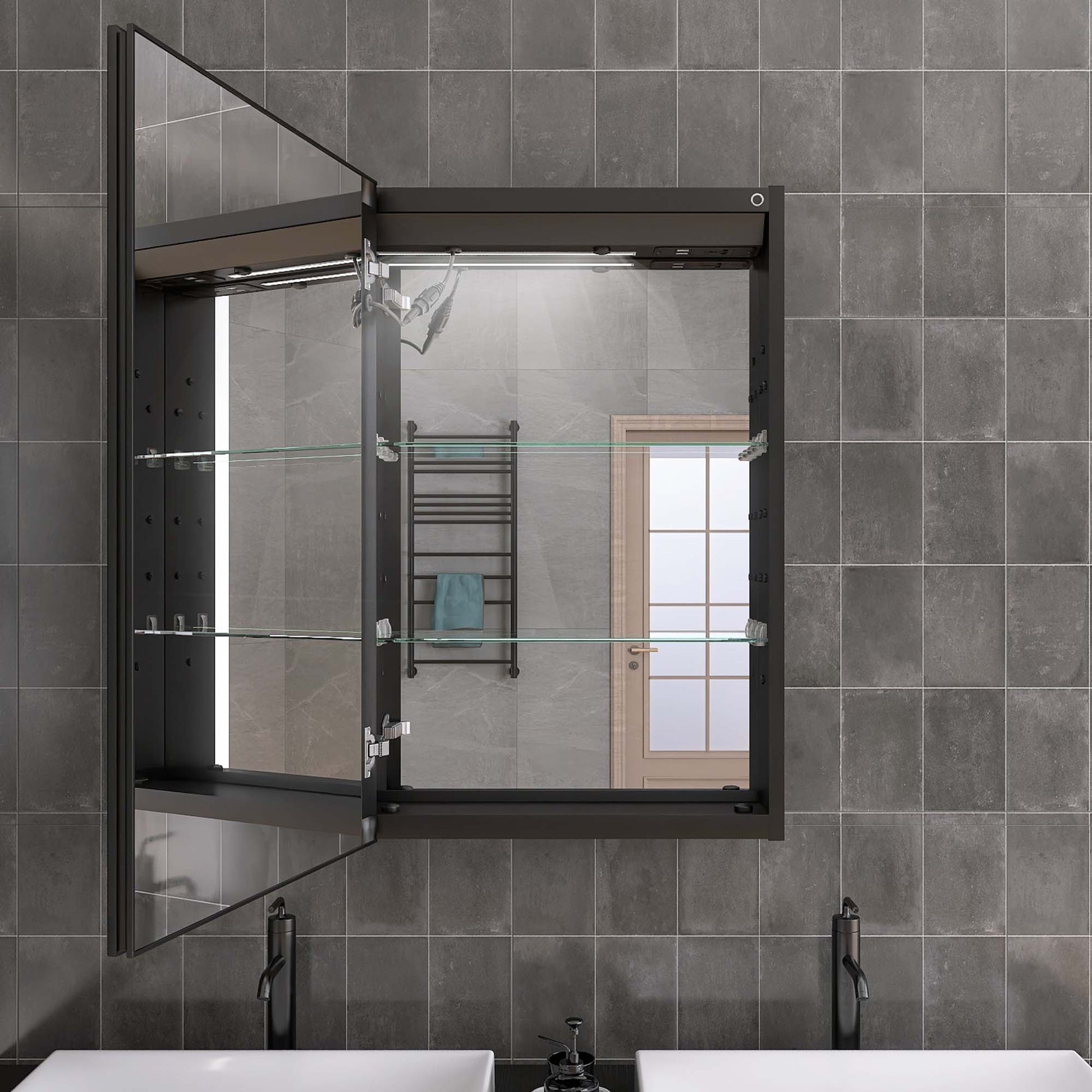 20" X 30" Lighted Medicine Cabinet With Mirror Aluminum Mirrored Cabinets For Bathroom Recessed Or Wall Mount, With Electrical Outlet Usb Anti Fog 3 Colors Light Built In Sensor Lamp Matte Black Modern Glass Aluminium Alloy