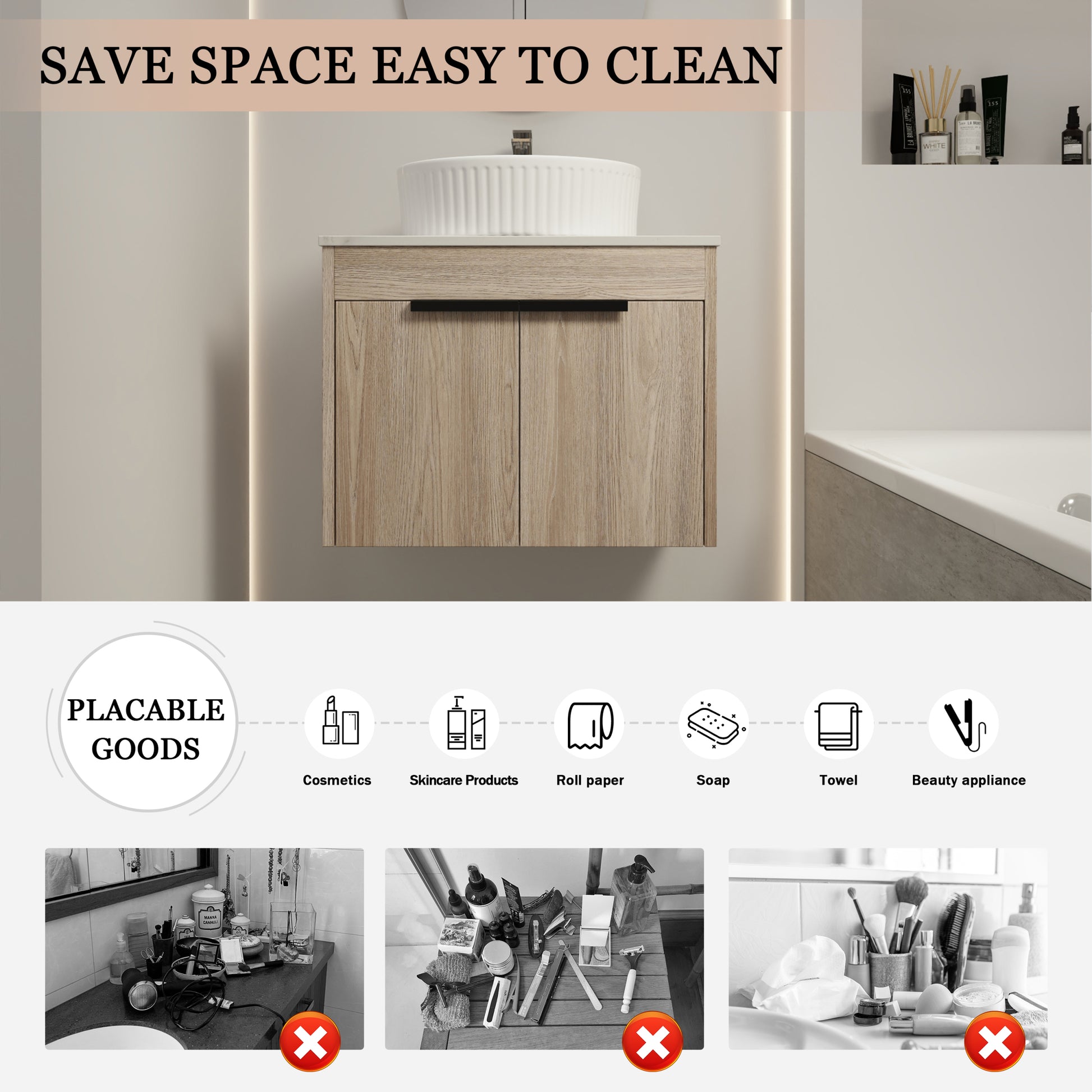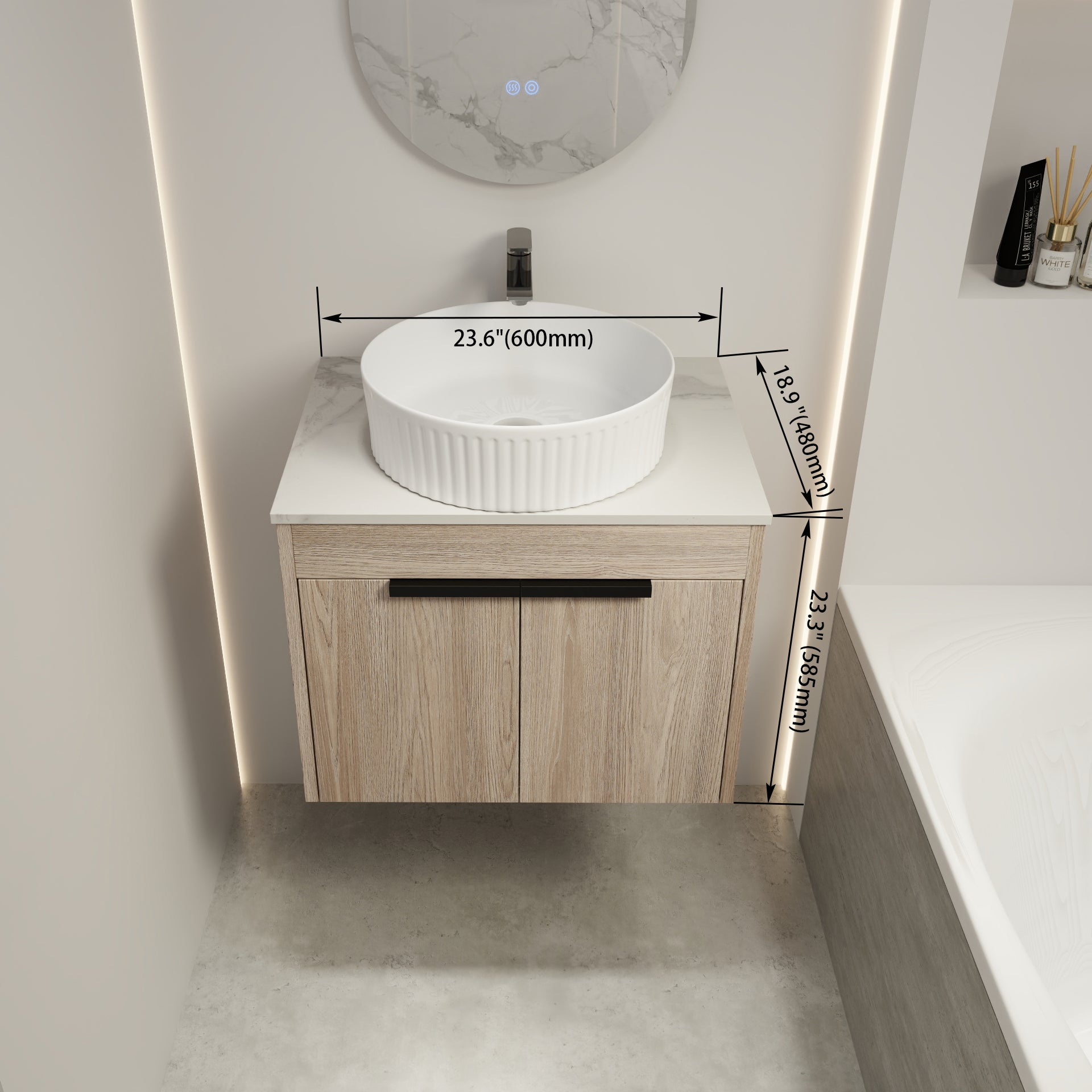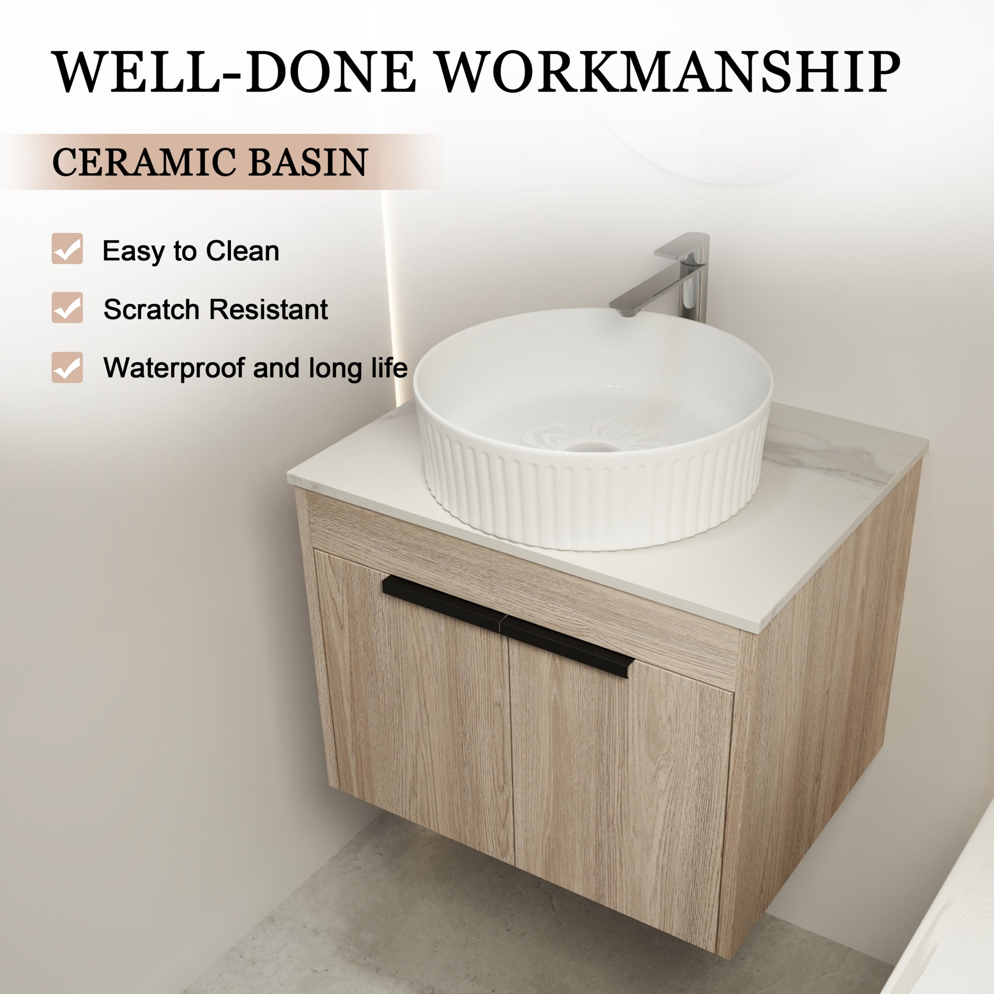 | Package includes | - 1x Vanity Cabinet; - 1x Ceramic Art Basin; - 1x White Flat Stone Slab;- 2x Metal Handle |