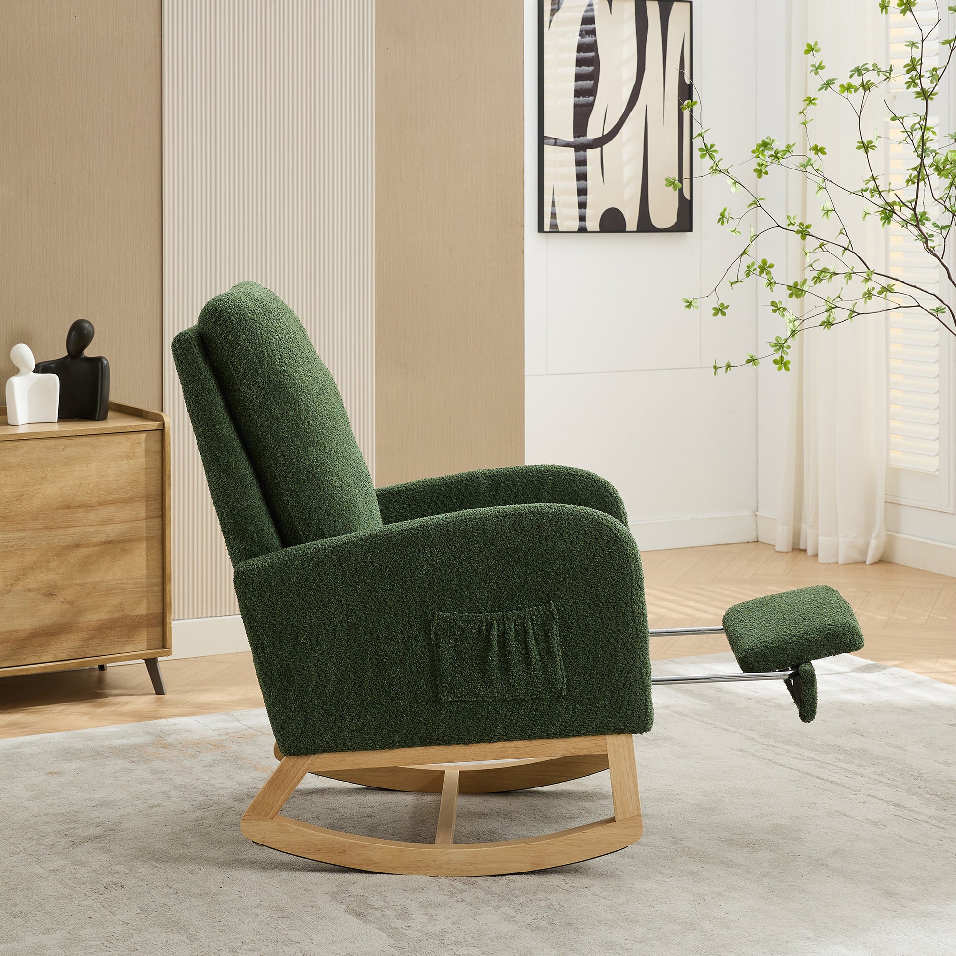 25.4"W Rocking Chair For Nursery, High Back Glider Chair With Retractable Footrest, Side Pocket, Rocking Accent Armchair With Rubber Wood Legs For Living Room Bedroom.Green Green Boucle