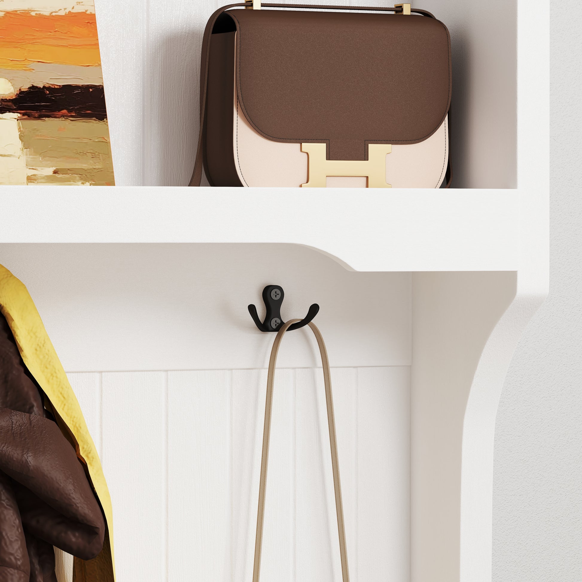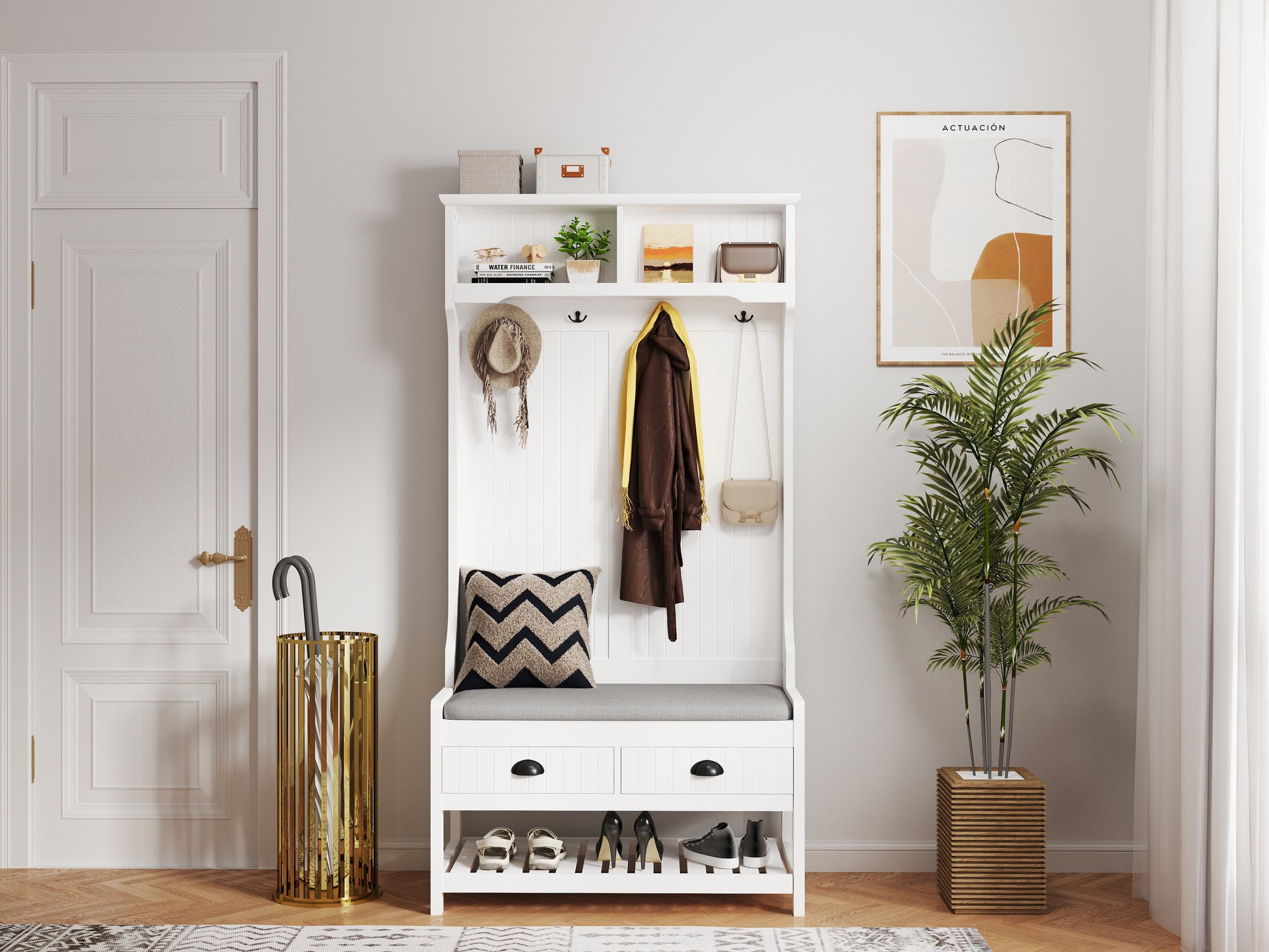 3 In 1 Hallway Hall Tree With 2 Storage Drawer And 4 Coat Rack, Wooden Entryway Shoe Rack Bench With Padded Seat Cushion, Mudroom Bench With Top Storage Shelf Cushioned White Primary Living Space