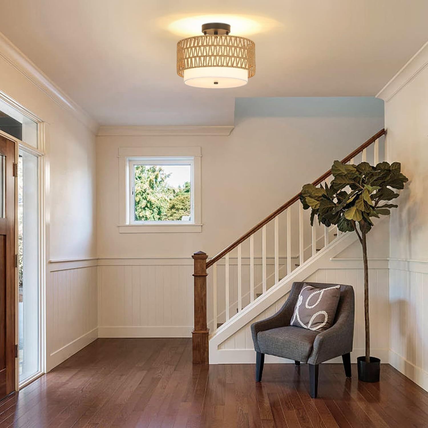 3 Light Semi Flush Mount Ceiling Light Fixture, Boho Rattan Light Fixtures Ceiling, Farmhouse Drum Light With Fabric Shade, Woven Rattan Ceiling Lights For Bedroom Dining Room Foyer Kitchen Hallway Brown Rattan Metal