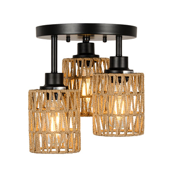 3 Lights Boho Flush Mount Light Brown Rattan