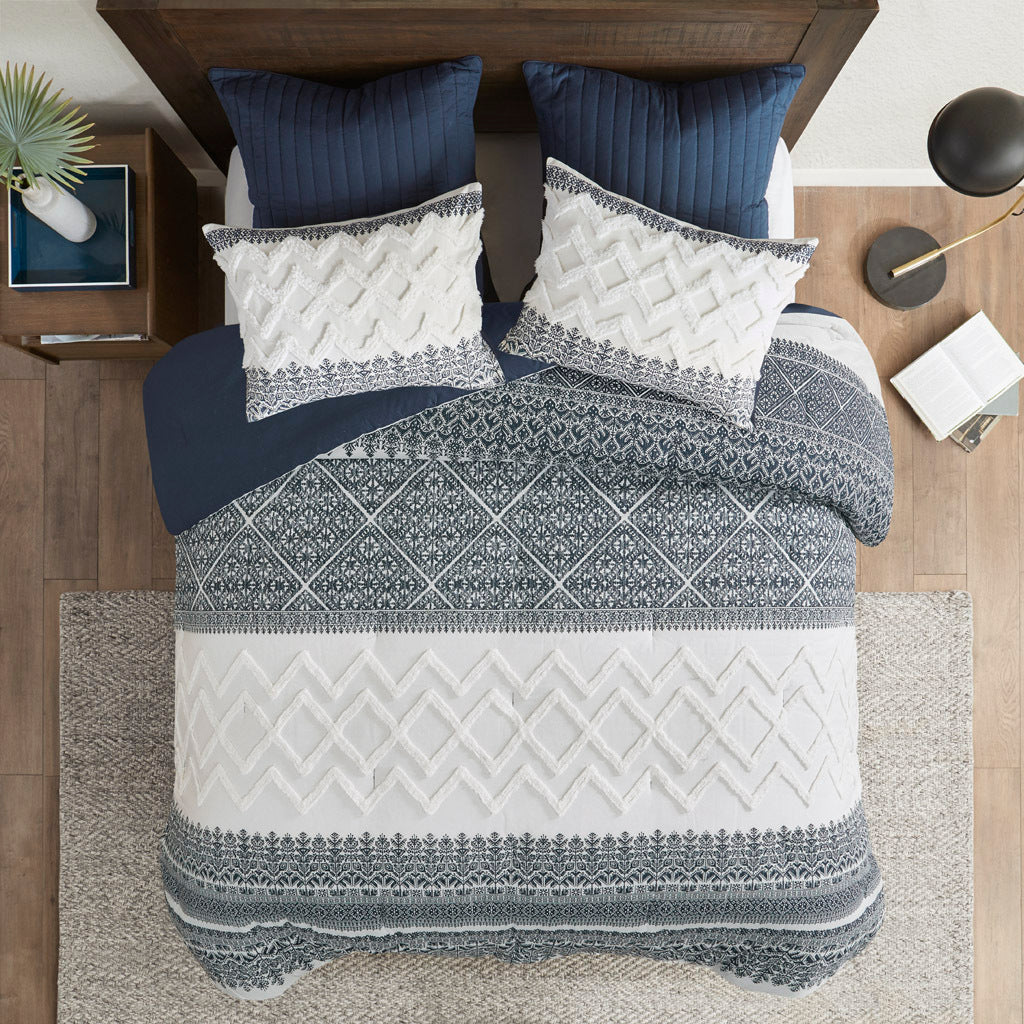 3 Piece Cotton Comforter Set With Chenille Tufting Navy Cotton