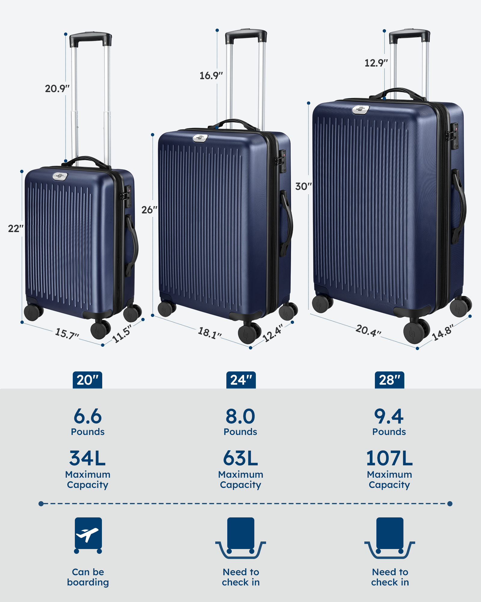 3 Pieces Set Luggage Hard Sided Expandable Luggage With Tsa Lock Travel Essentials Suitcase With Spinner Wheels Dark Blue Abs