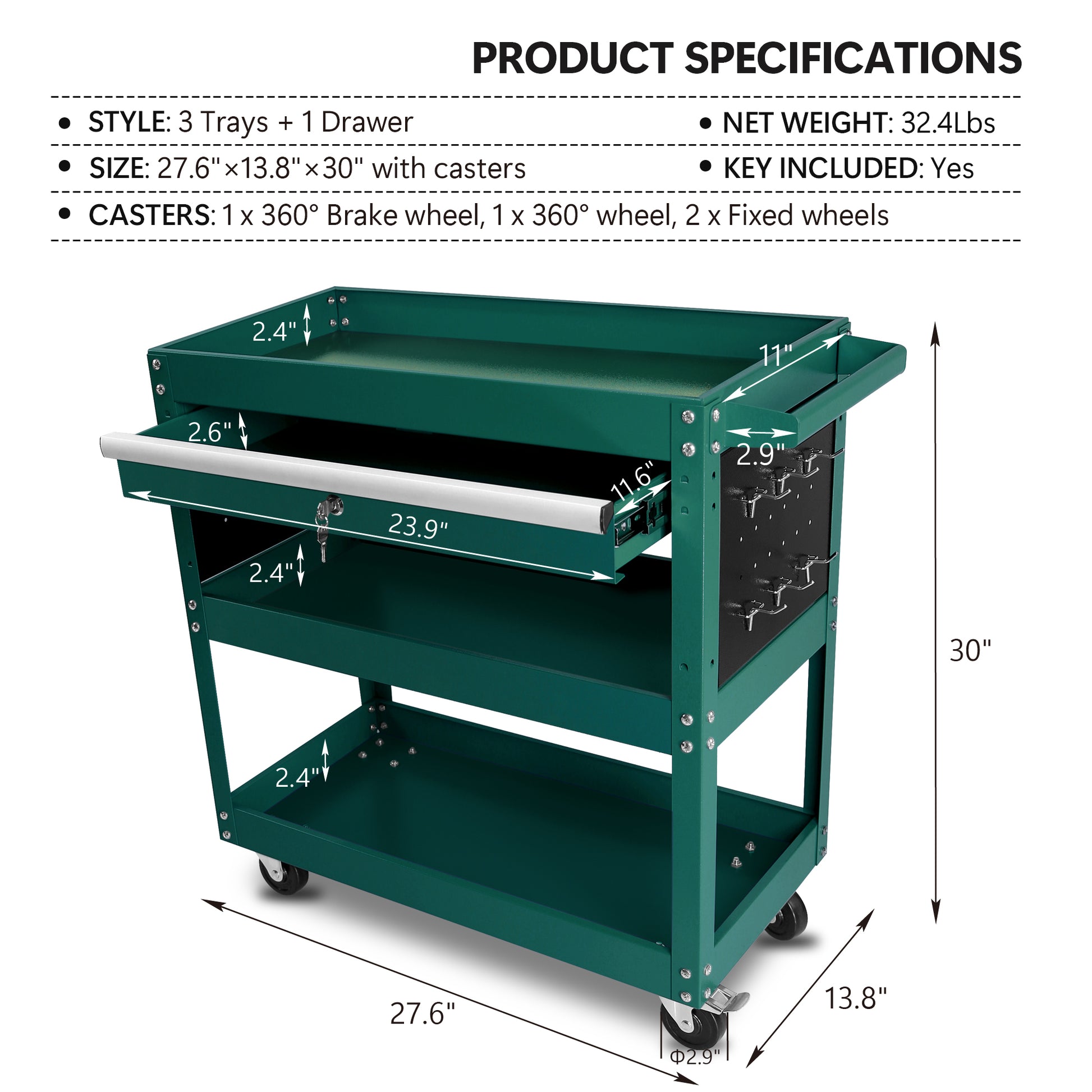 3 Tier Rolling Tool Cart, Heavy Duty Utility Cart Tool Organizer With Storage Drawer, Industrial Commercial Service Tool Cart For Mechanics, Garage, Warehouse & Repair Shop Green Steel