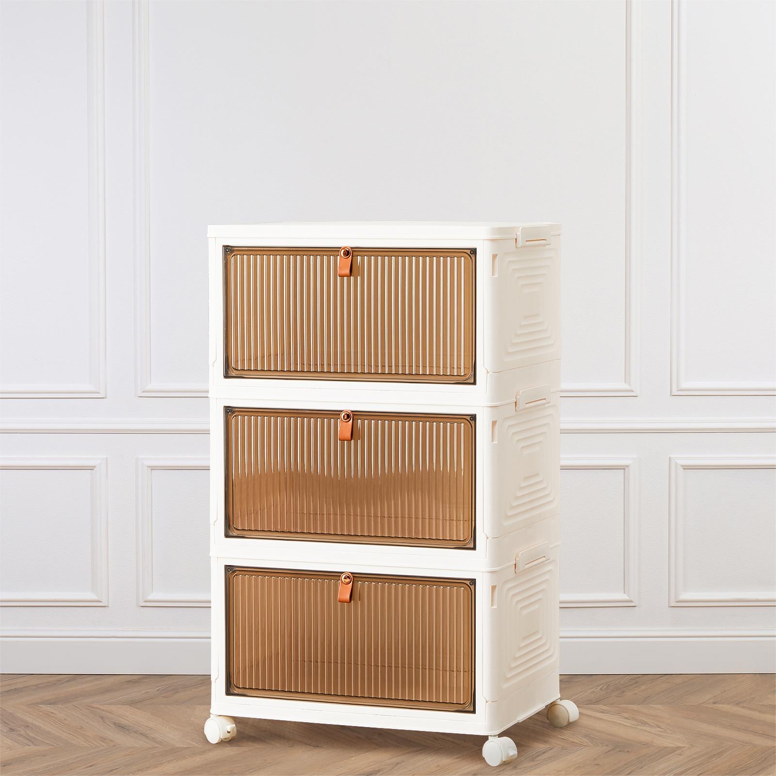 3 Tier Stackable Plastic Storage Bins With Lid 23Qt Foldable Organizers And Storage With Magnetic Doors & Lockable Wheels White Plastic