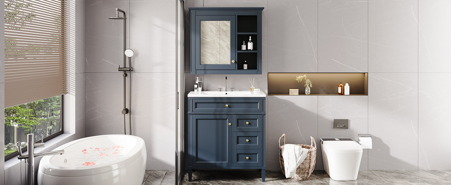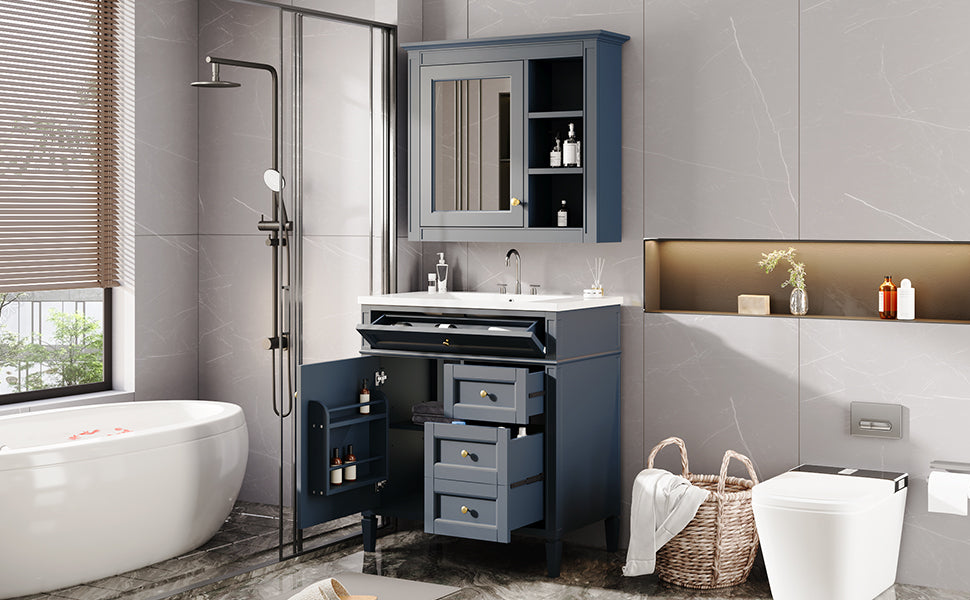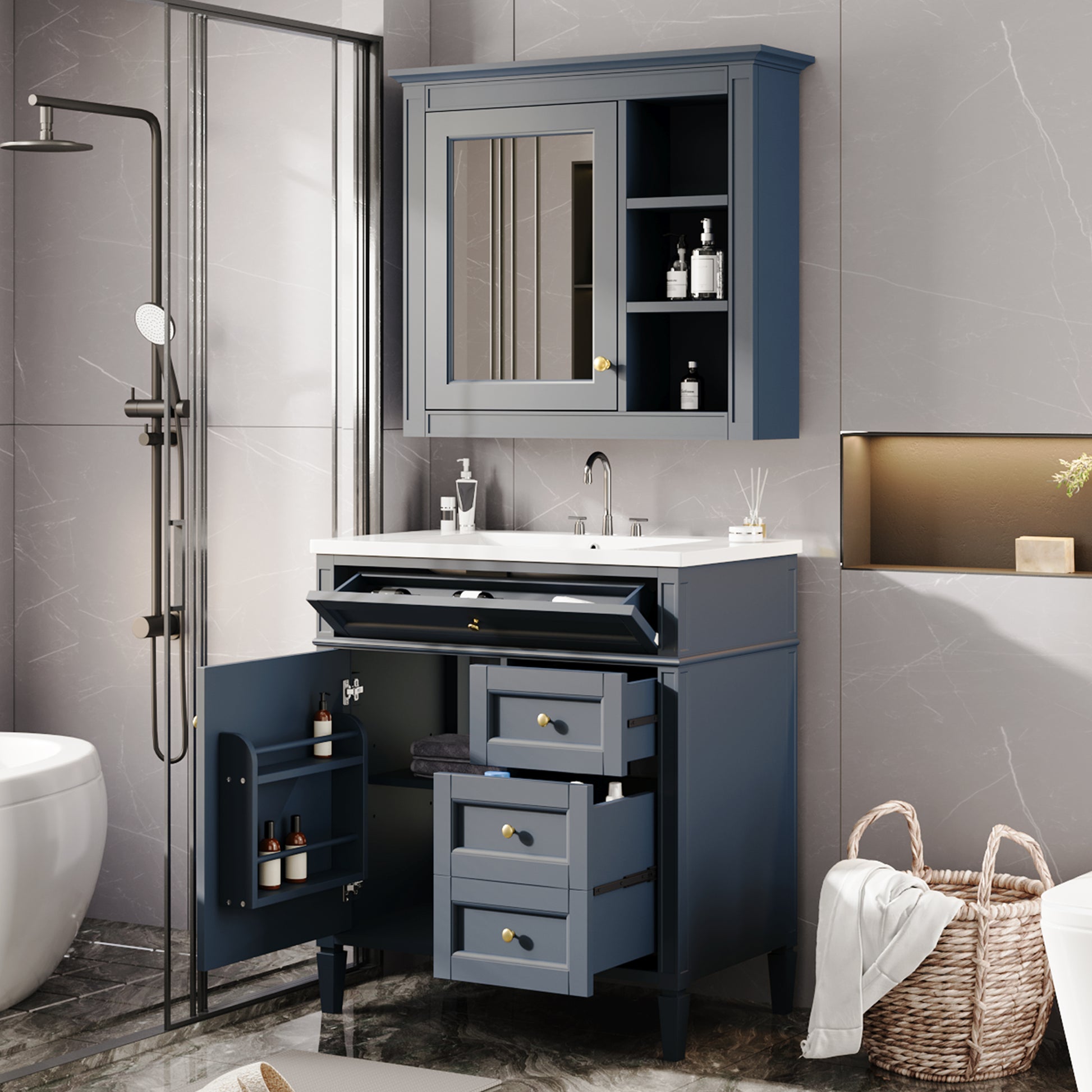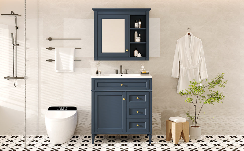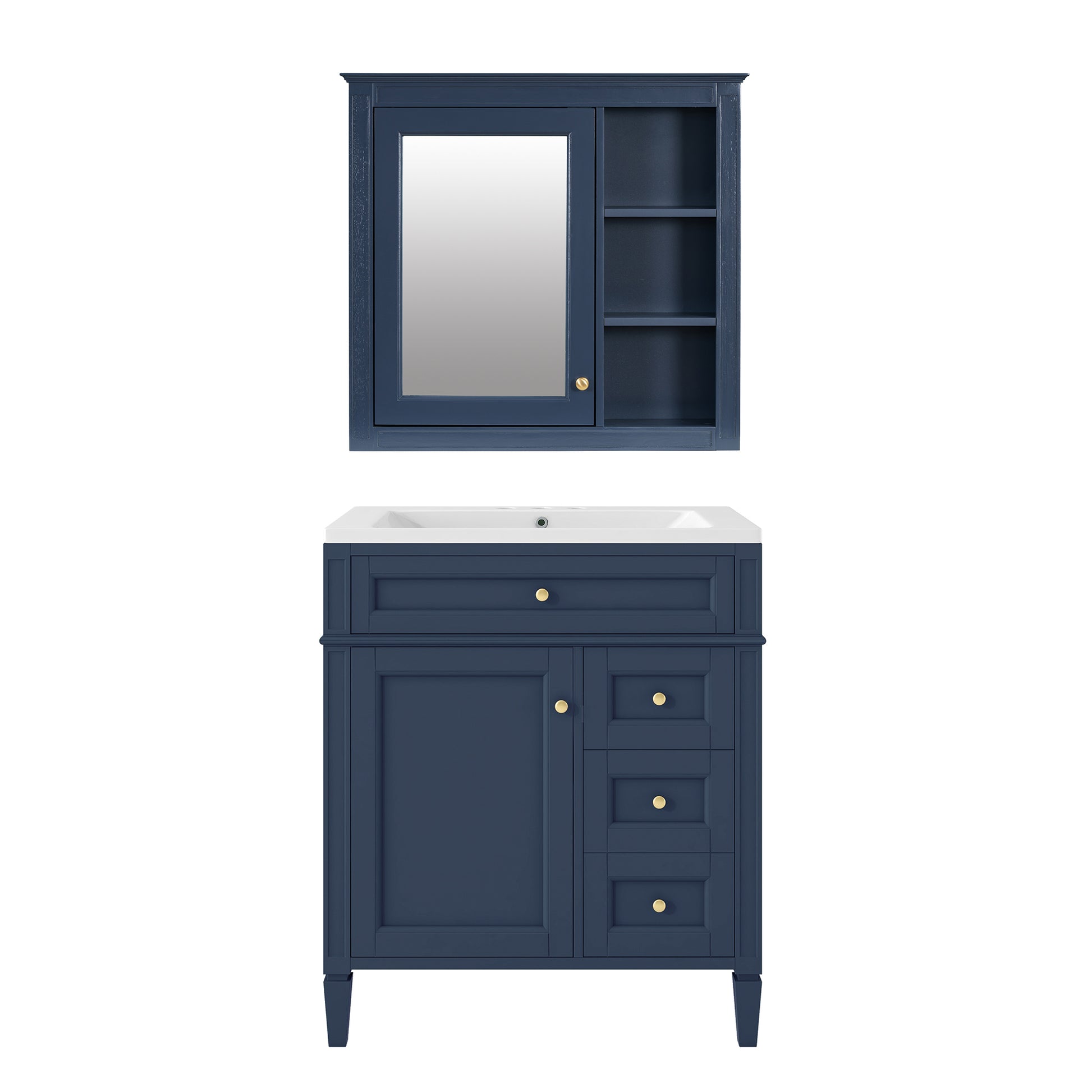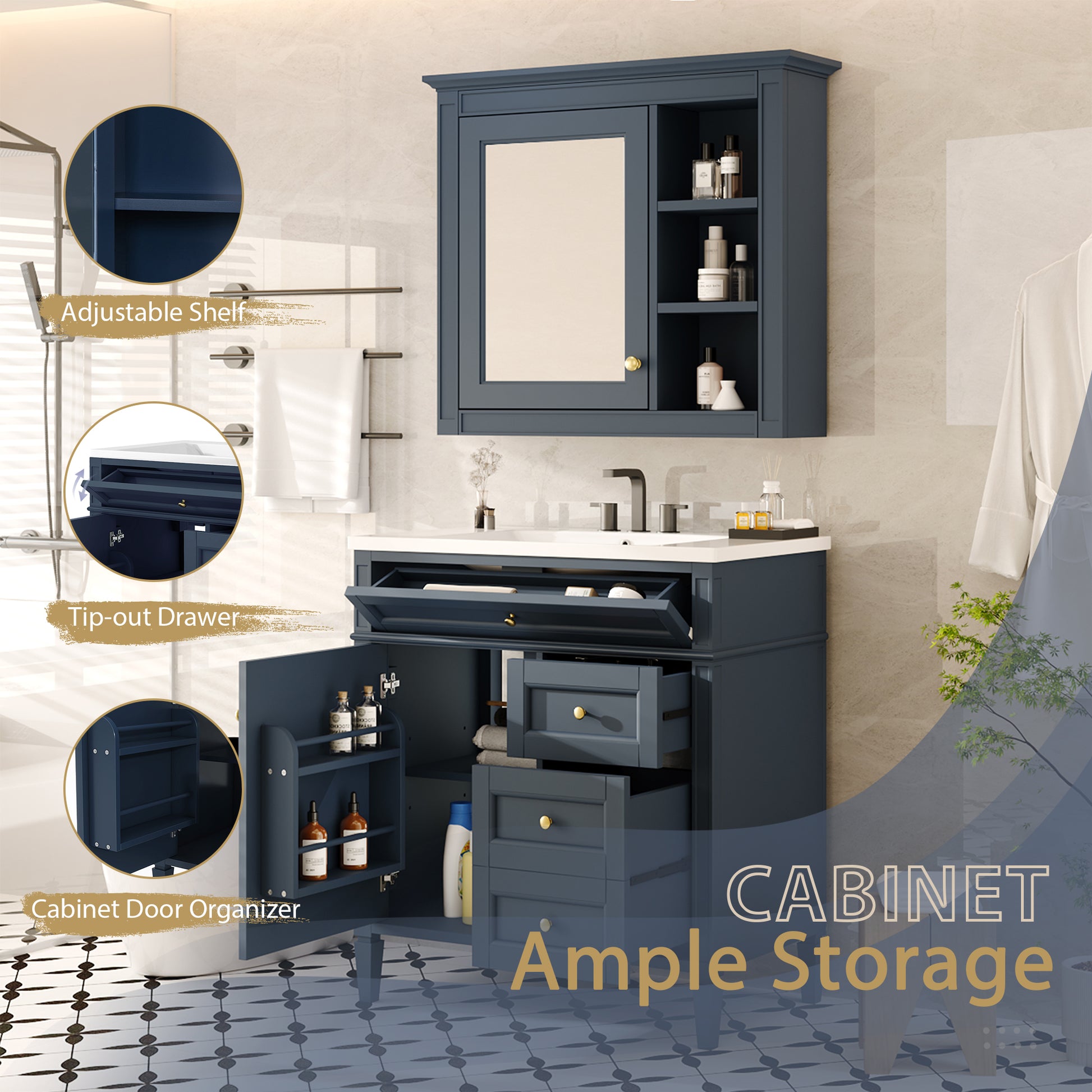 30'' Bathroom Vanity With Top Sink, Modern Bathroom Storage Cabinet With 2 Drawers And A Tip Out Drawer, Freestanding Vanity Set With Mirror Cabinet, Single Sink Bathroom Vanity 3 Blue 2 Mirror Included Bathroom Wall Mounted Modern Solid Wood Painted