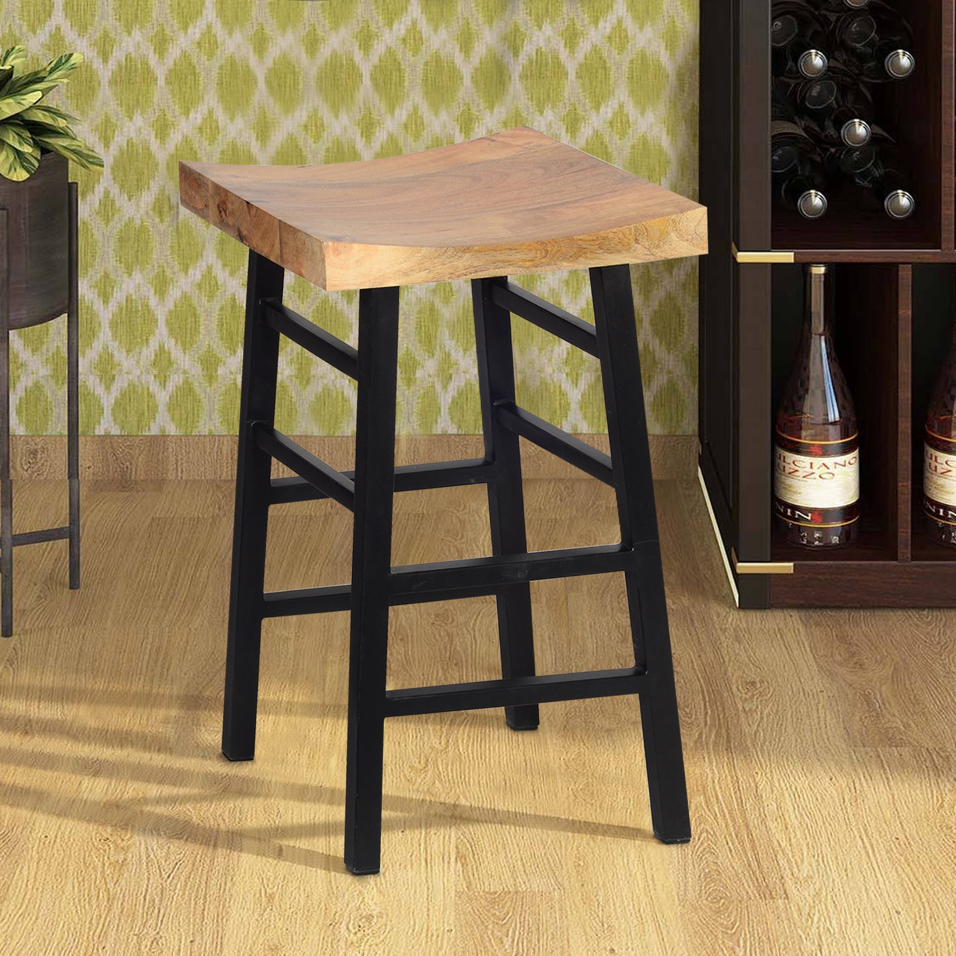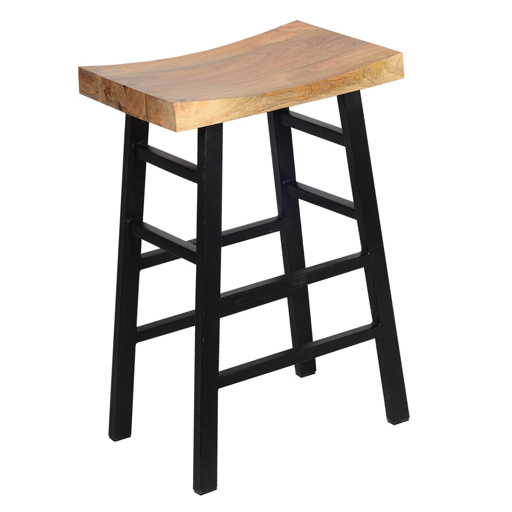 30 Inch Barstool With Saddle Style Wood Seat, Ladder Base, Brown And Black Black Metal & Wood
