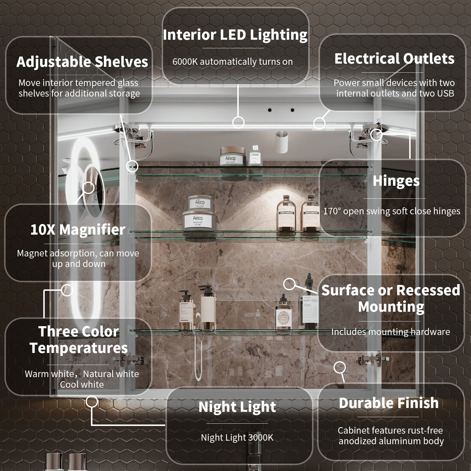 30 X 36 Lighted Medicine Cabinet With Mirror, Front & Backlit Led Medicine Cabinet, Clock Temp Display, Defog,10X Magnifier, 3 Colors Temper Dimmable, Surface Or Recessed Mount, Door Wide Open