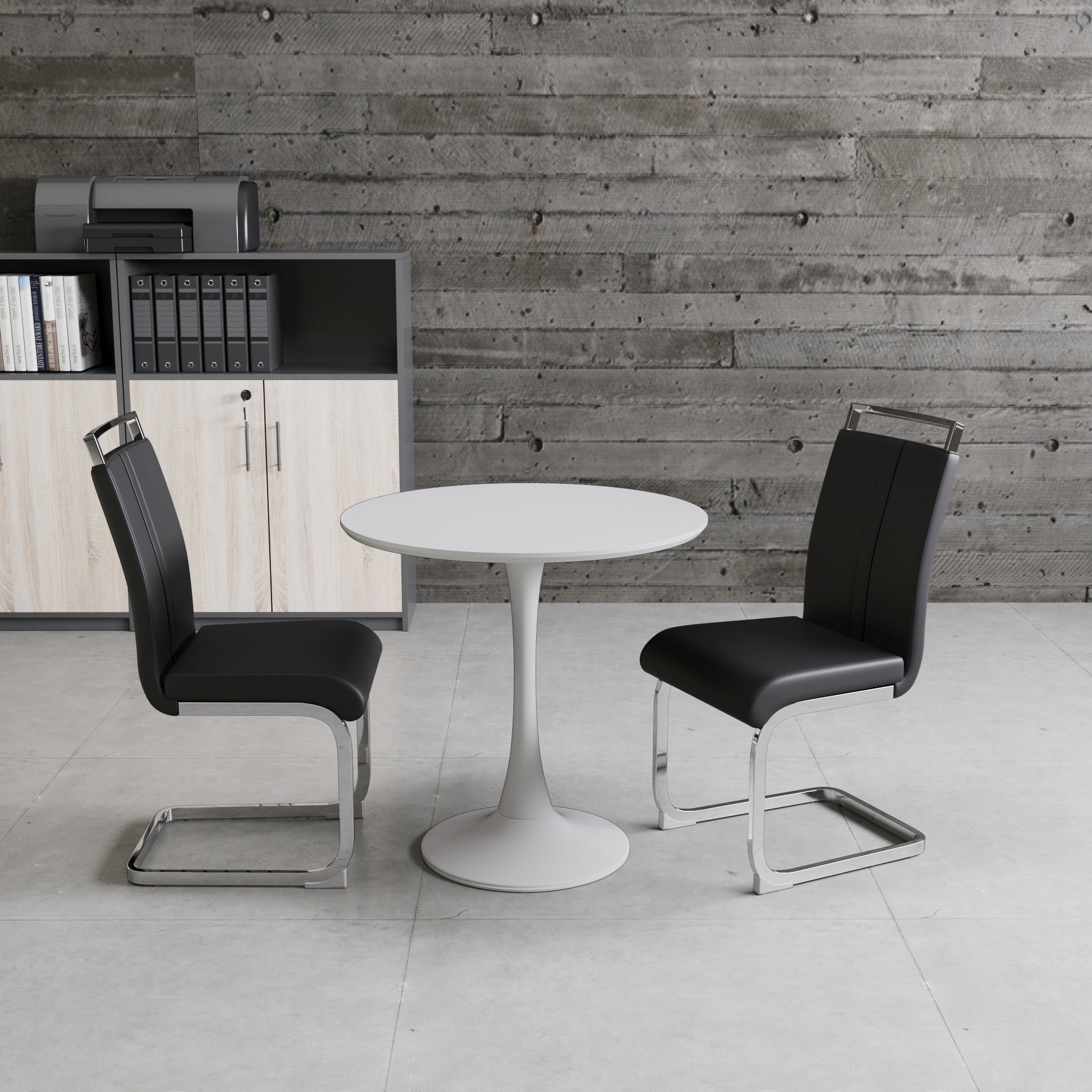 31.5 " White Circular Dining Table, Tulip Dining Table, Kitchen Dining Table For 2 4 People, Mdf Tabletop And Base, And 2 Black Pu Plating Silver Metal Leg Dining Chair Set 2 White Mdf