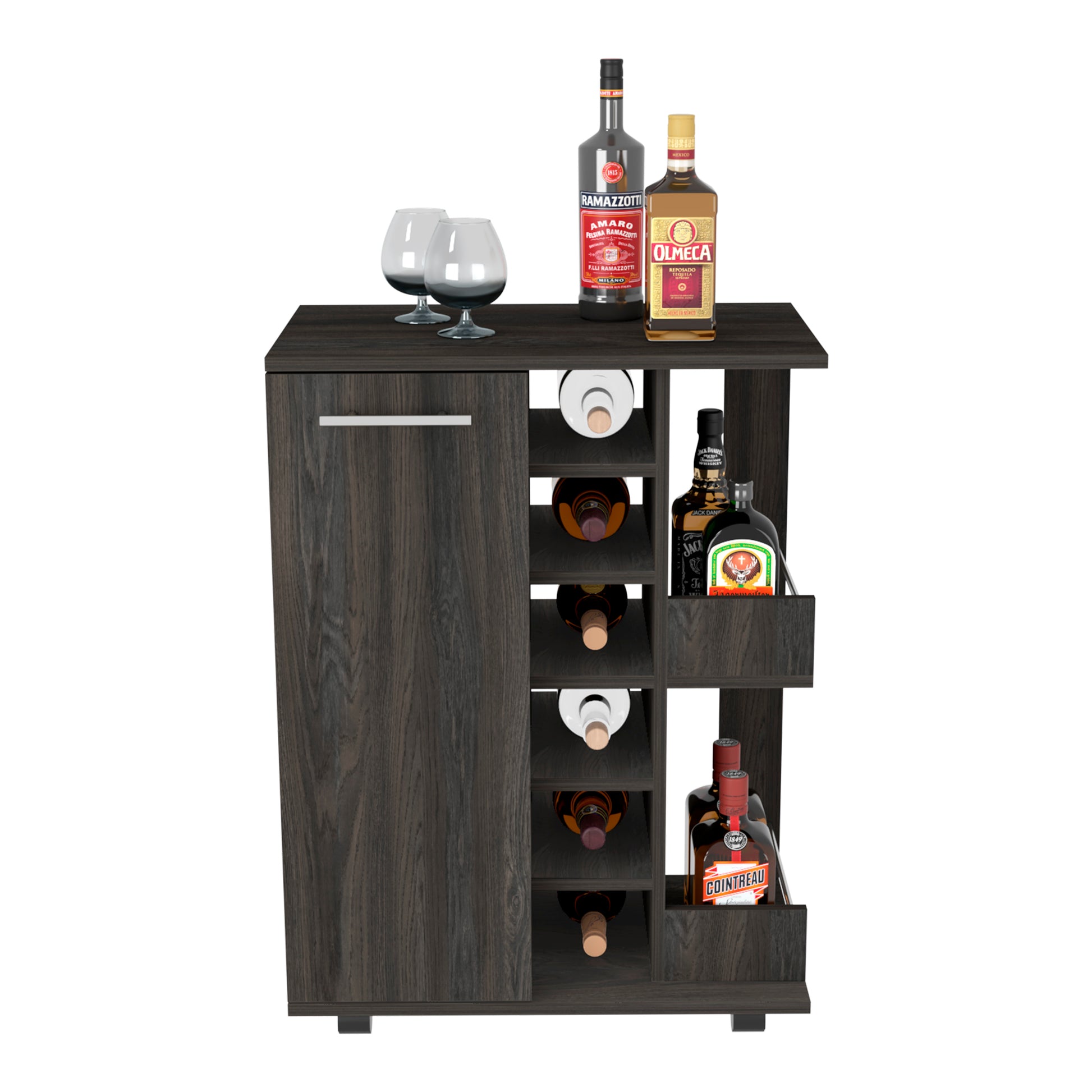 32" H Carbon Espresso Bar Coffee Cart, Cabinet Storage, With 4 Wheels, 1 Divided Storage With 1 Shelf, 1 Folding Door, A Central Vertical Division For 6 Bottles And 2 Side Shelves With Aluminum Front Brown Particle Board Particle Board
