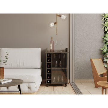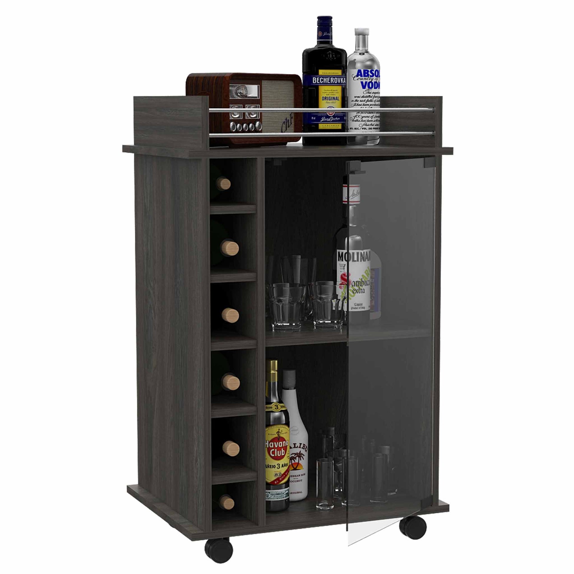 32" H Carbon Espresso Bar Coffee Cart, Kitchen Or Living Room Cabinet Storage With With 4 Wheels, With 6 Bottle Racks, A Central Shelf Covered By 1 Glass Door, 1 Support Surface With Aluminum Front.