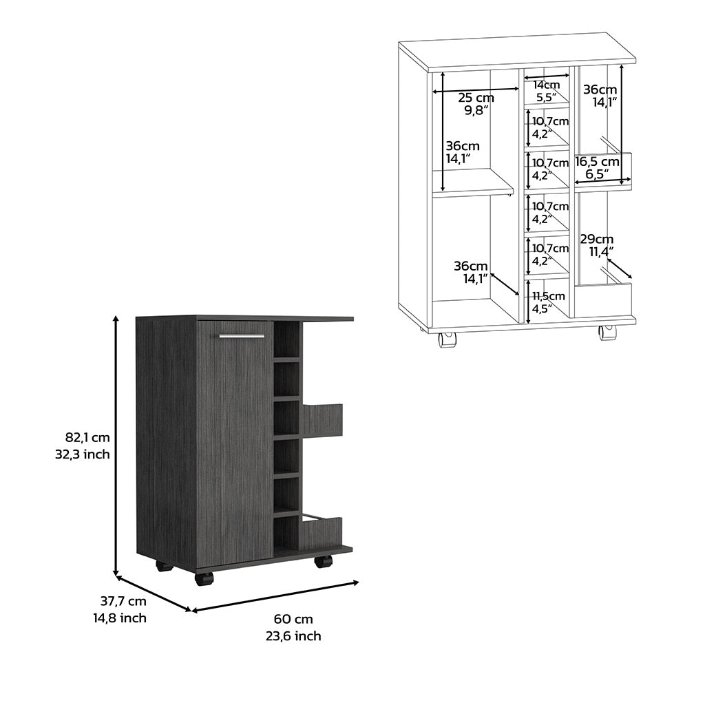 32" H Smokey Oak Bar Coffee Cart, Cabinet Storage, With 4 Wheels, 1 Divided Storage With 1 Shelf, 1 Folding Door, A Central Vertical Division For 6 Bottles And 2 Side Shelves With Aluminum Front