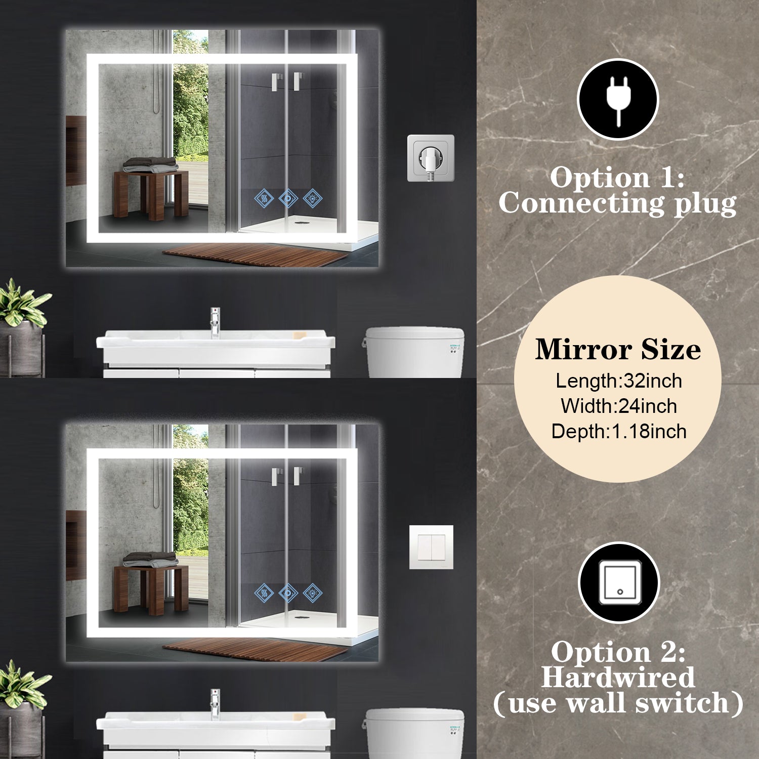 32X24Inch Glossy Brushed Silver 3000 6000K Led Bathroom Mirror With Lights,Anti Fog Dimmable Lighted Wall Mounted Vanity Mirror Master Bath Modern Makeup Only Mirrors, Not Cabinets Horizontal&Vertical Silver Classic,Modern Aluminium Alloy
