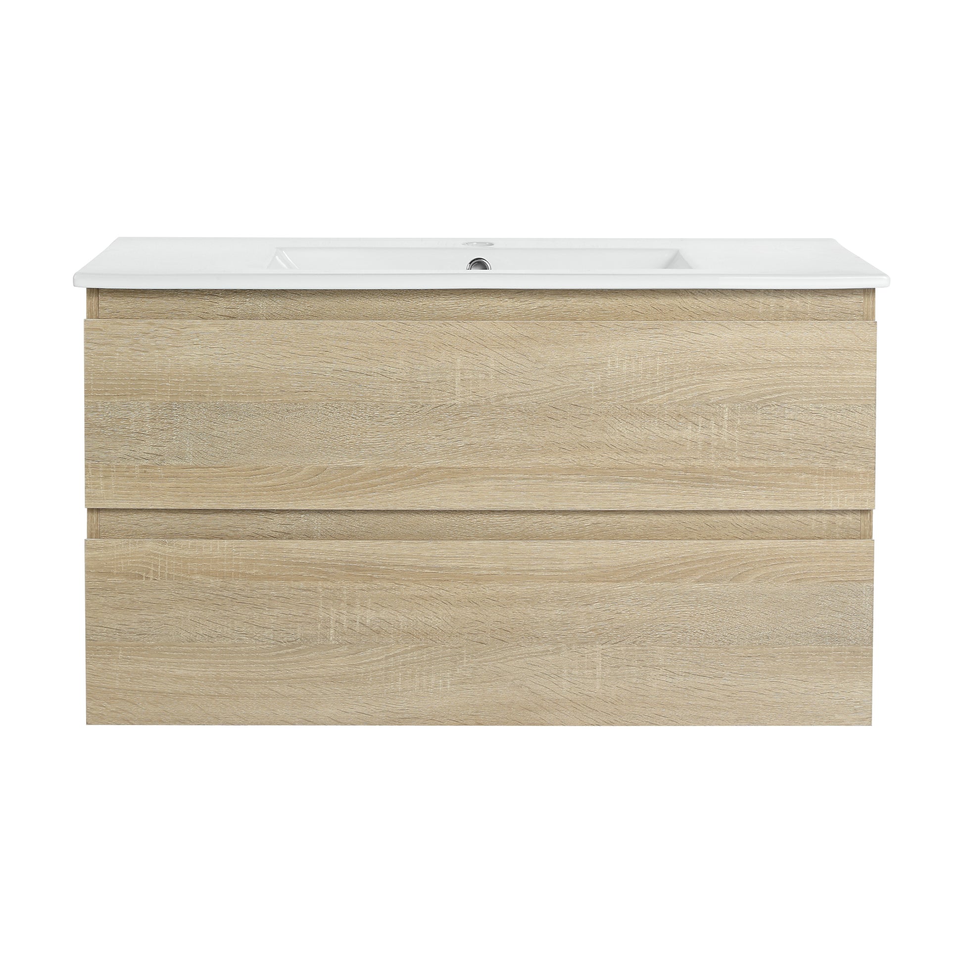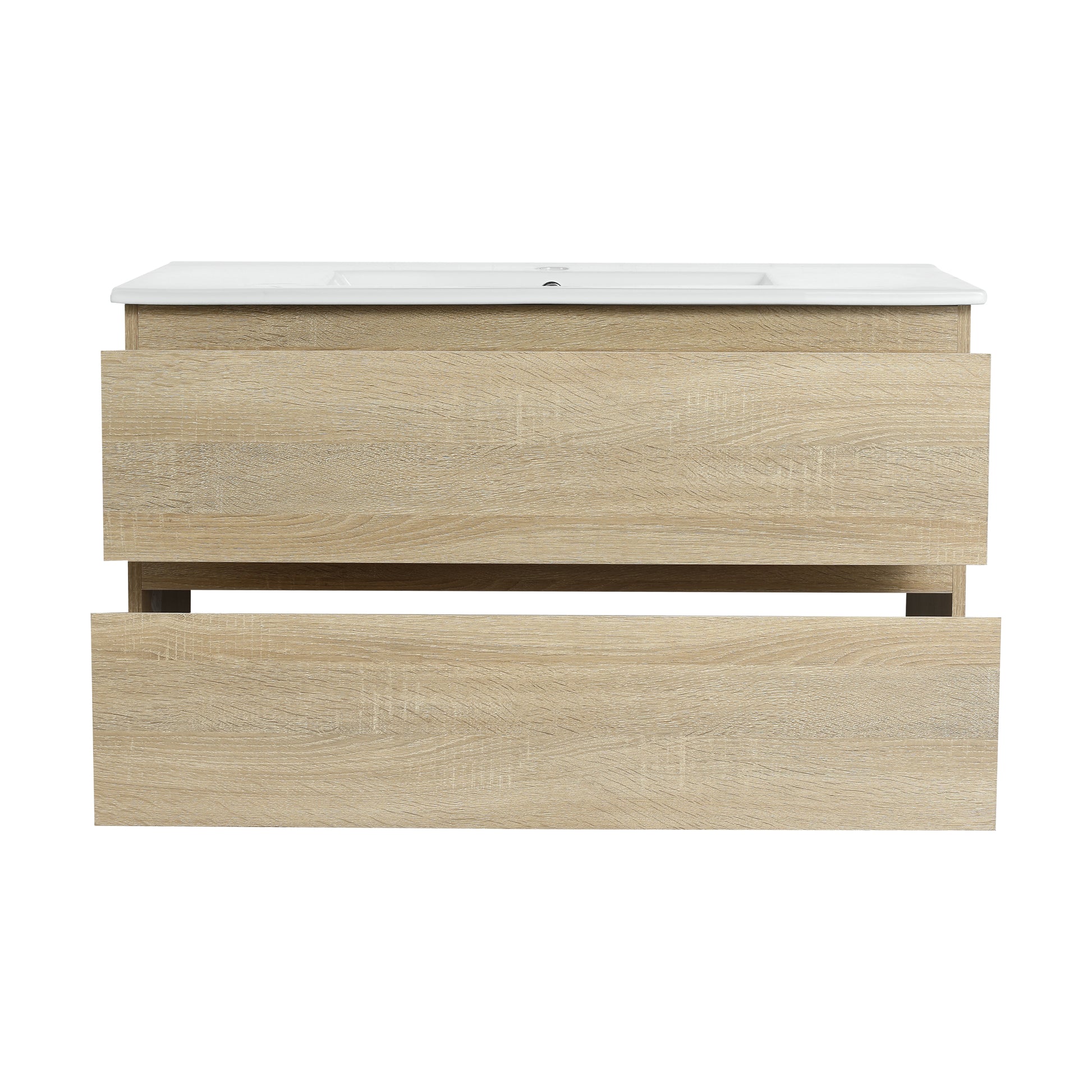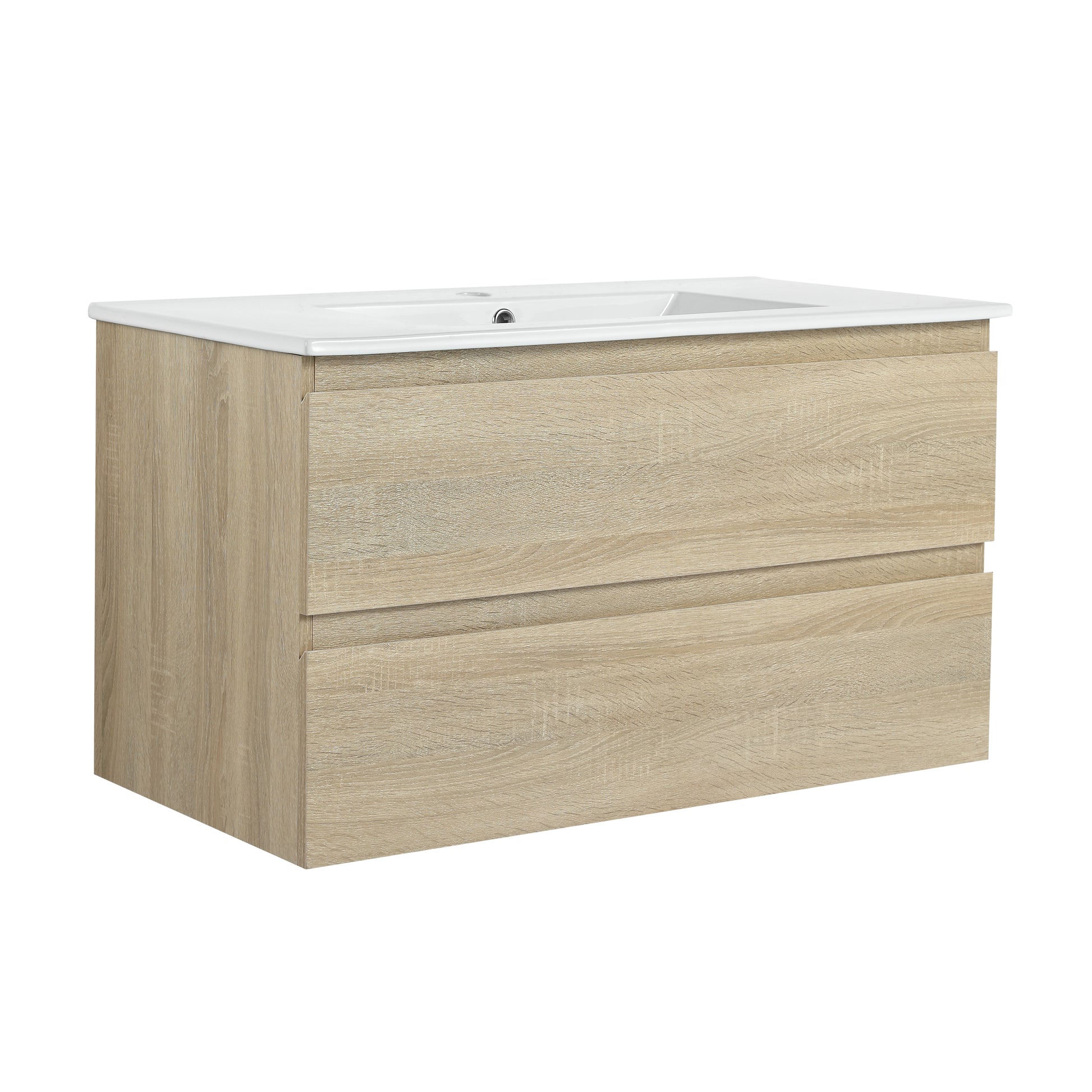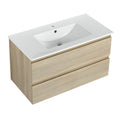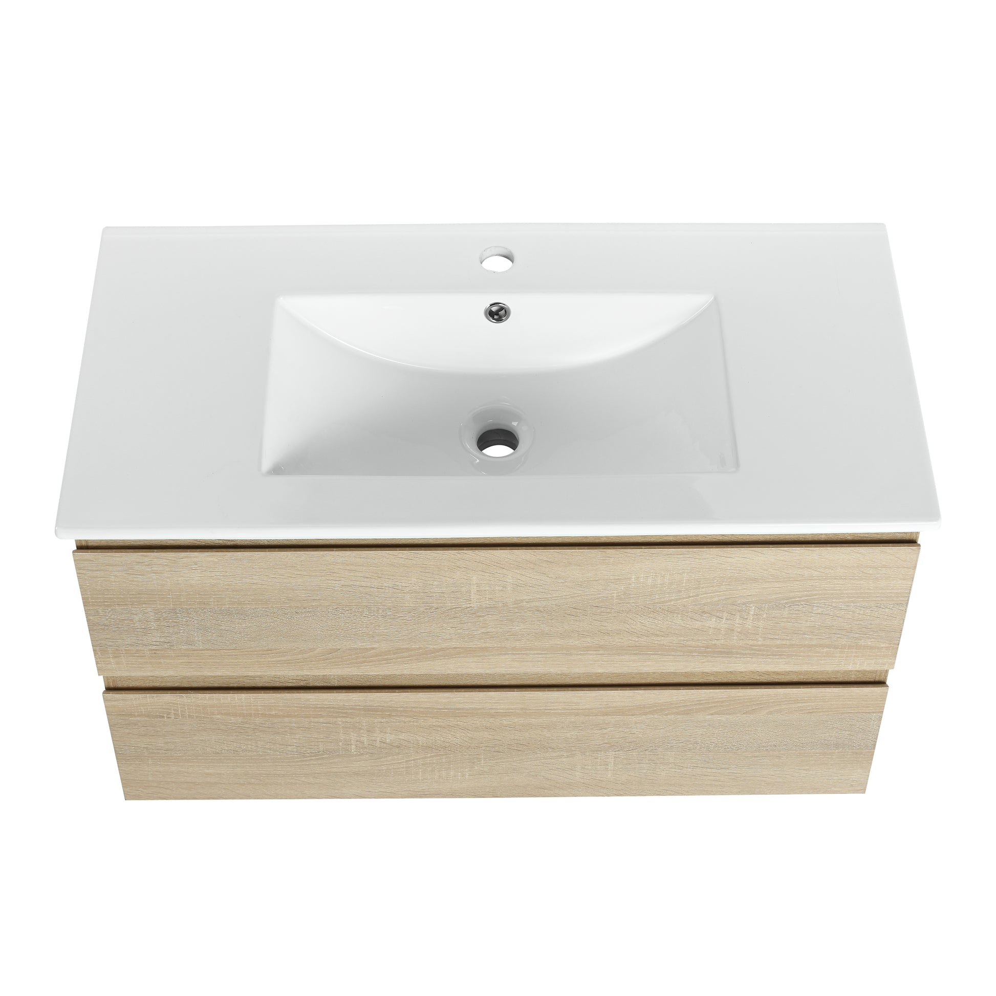 36" Wall Mounted Bathroom Vanity With Ceramic Sink, 2 Soft Close Drawers, Kd Package 2 Light Oak Bathroom Wall Mounted Modern Plywood