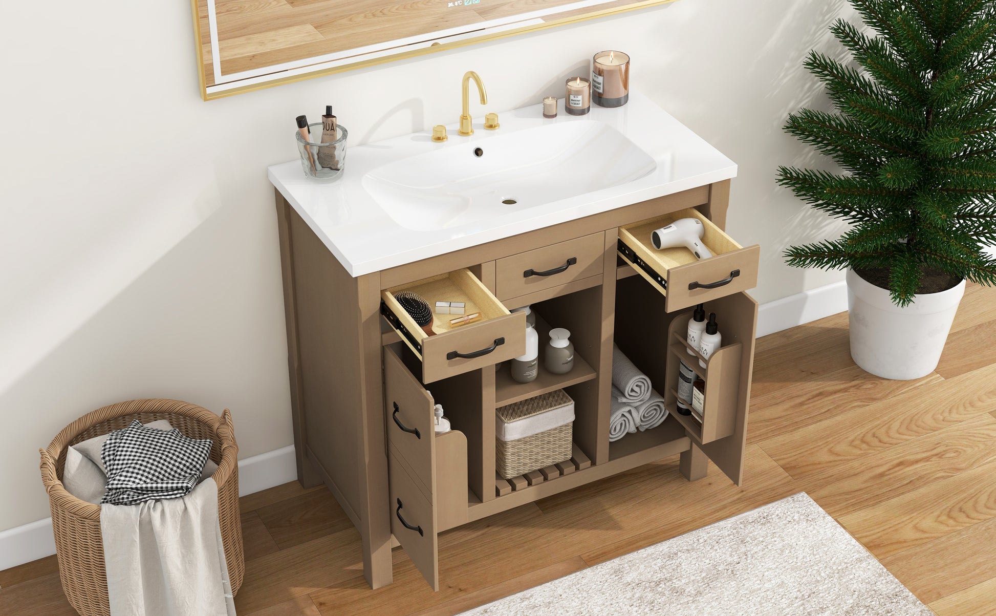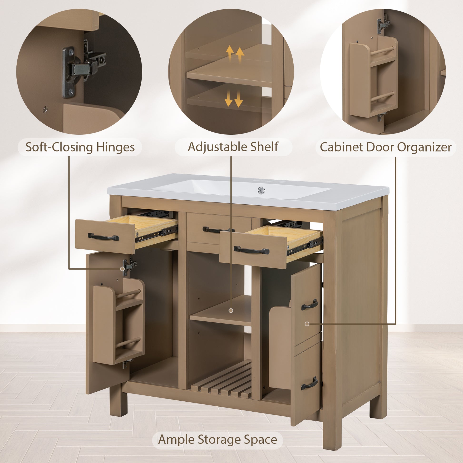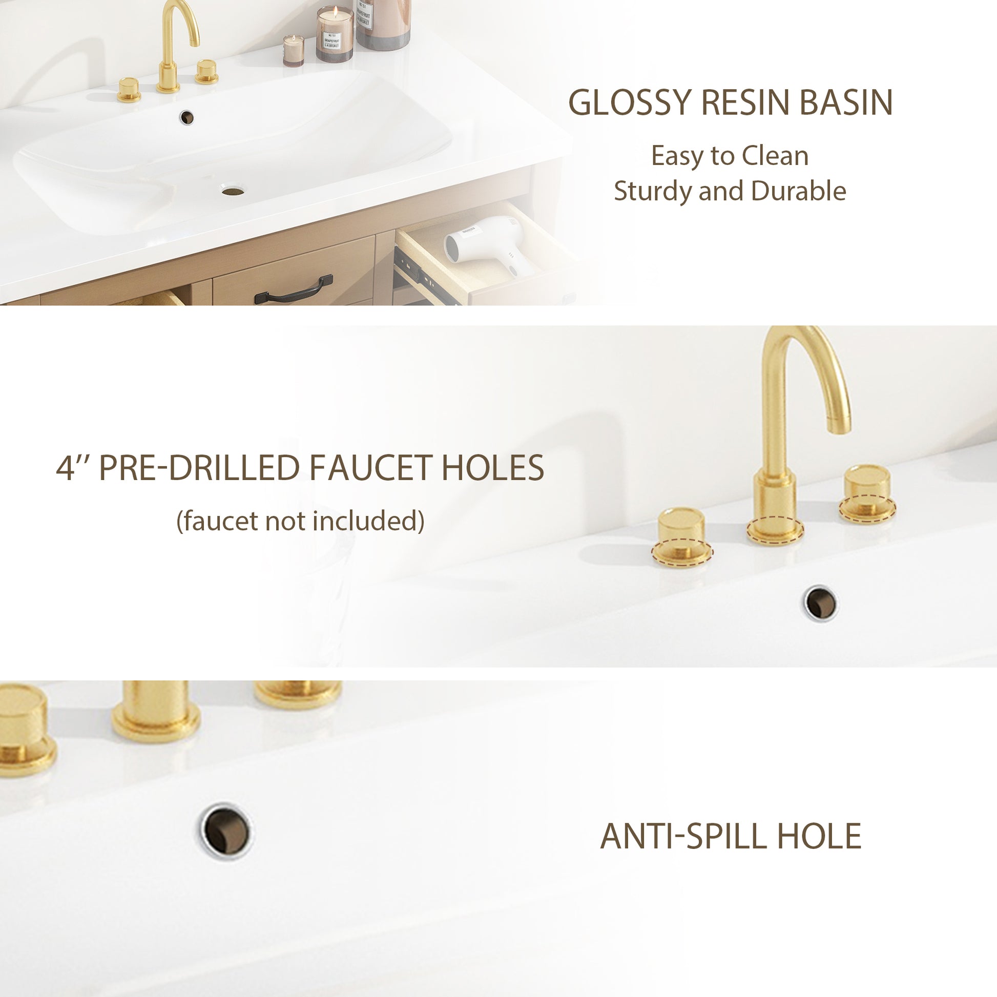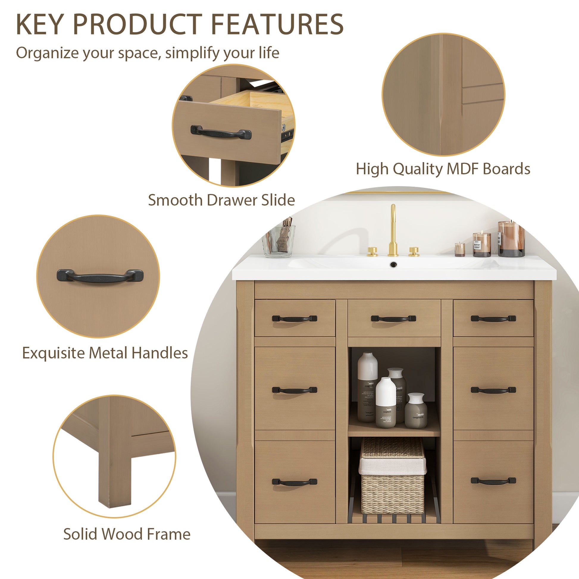 | Material | Cabinet:MDF Board & Solid Wood/ Sink: Resin |