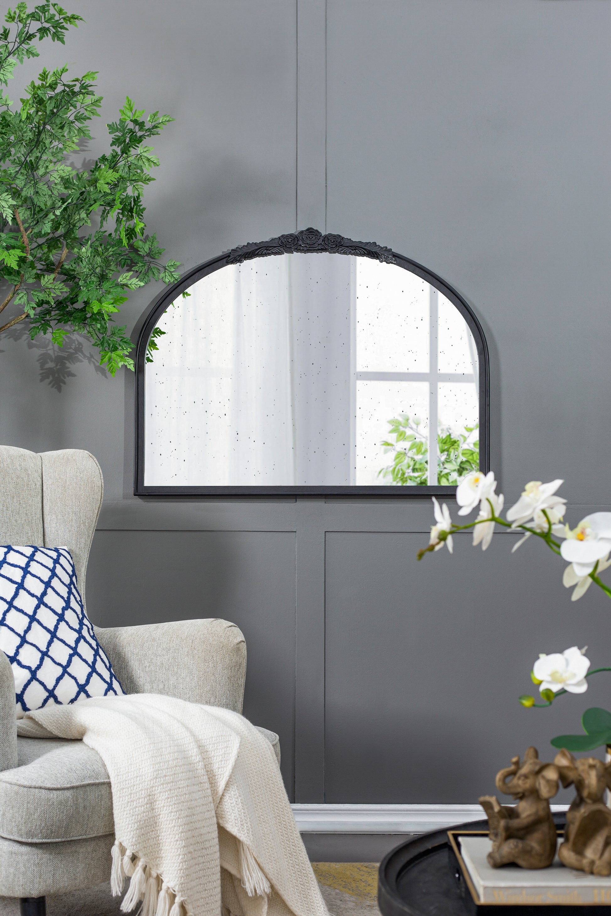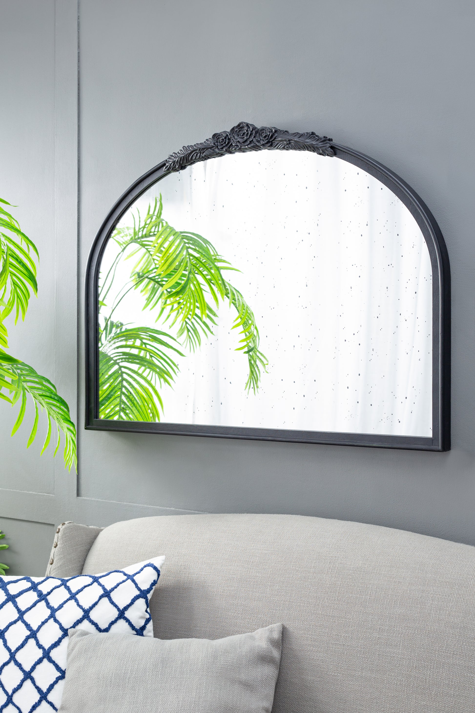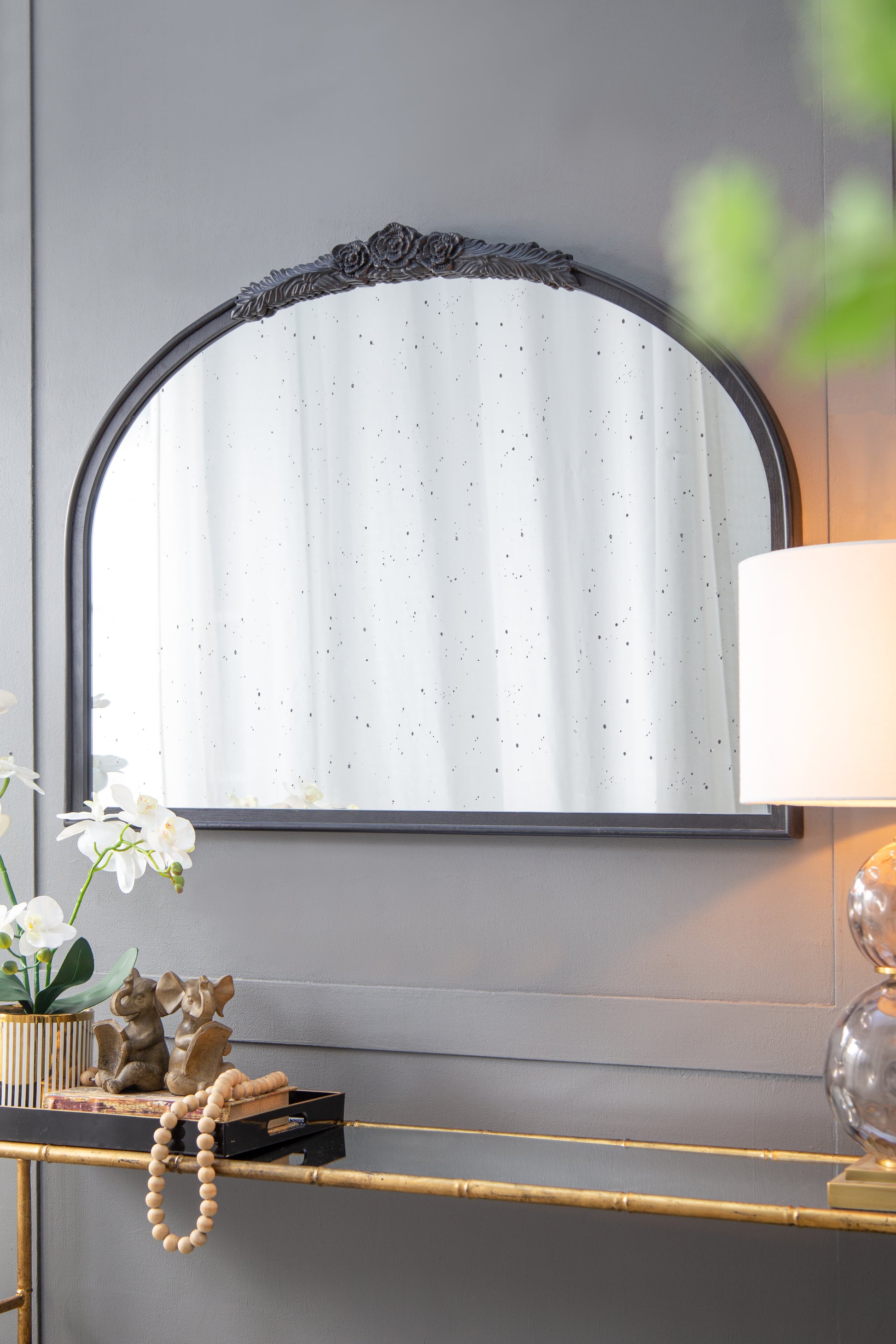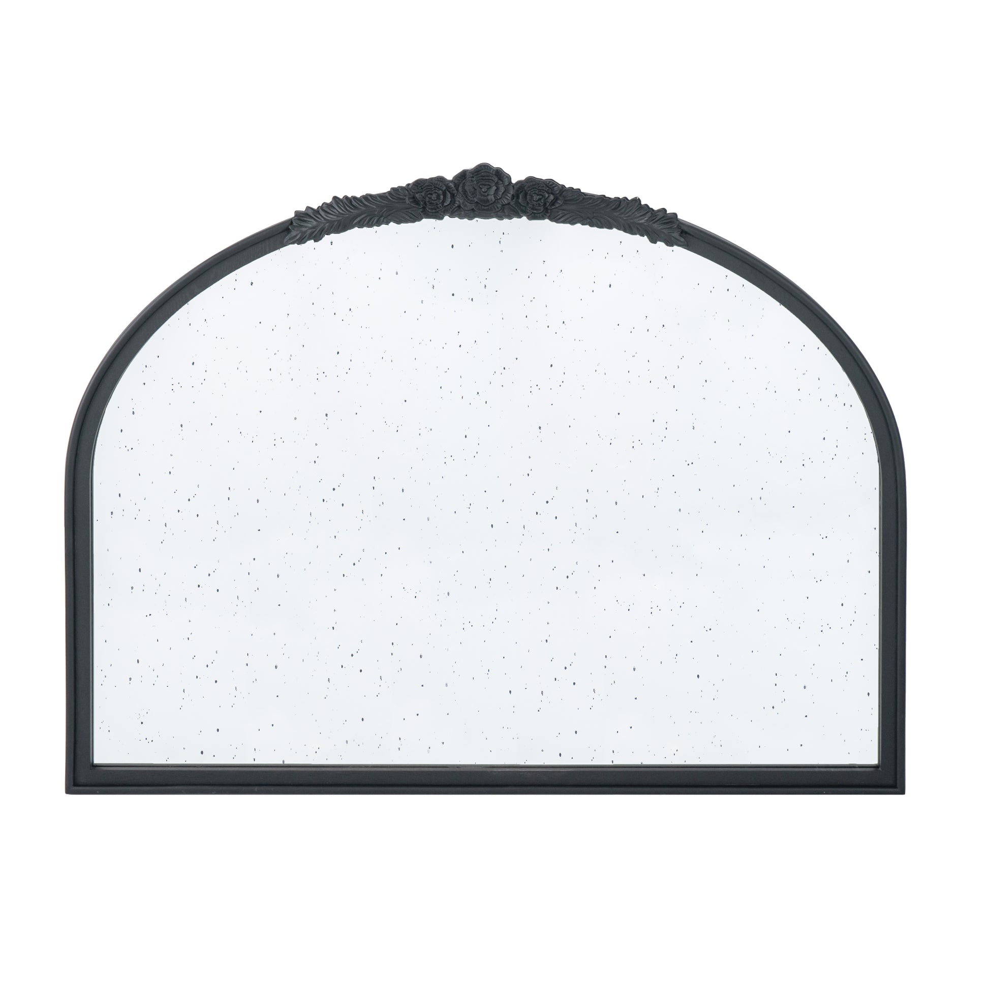 40" X 30" Hand Carved Rose Antique Mirror Frame, Wood Arch Mirror Wall Decor For Living Room, Bathroom, Entryway Black Black Mdf Glass