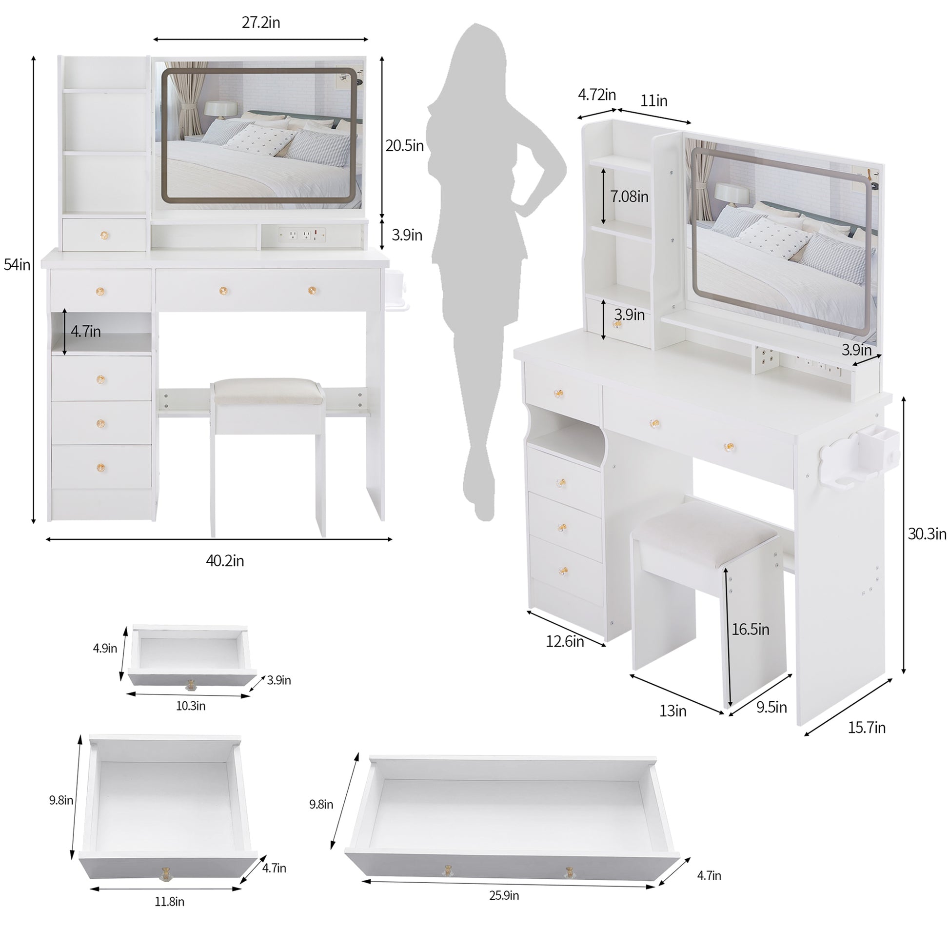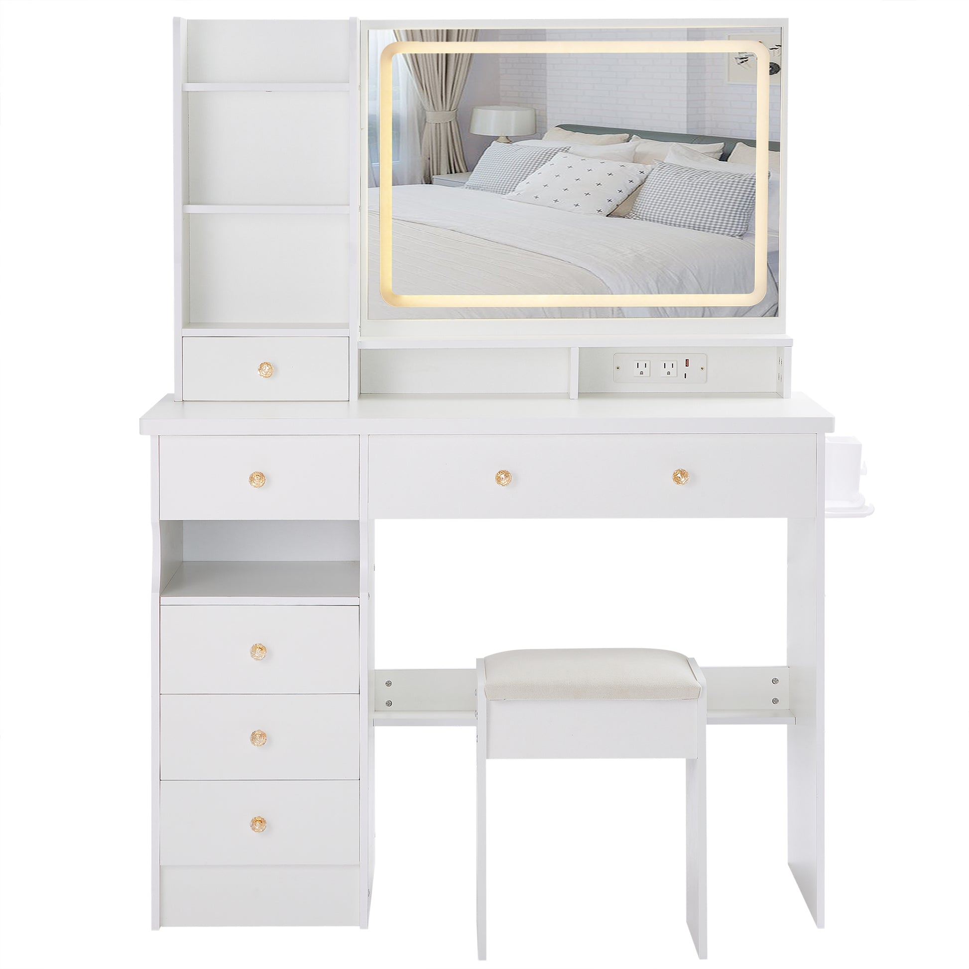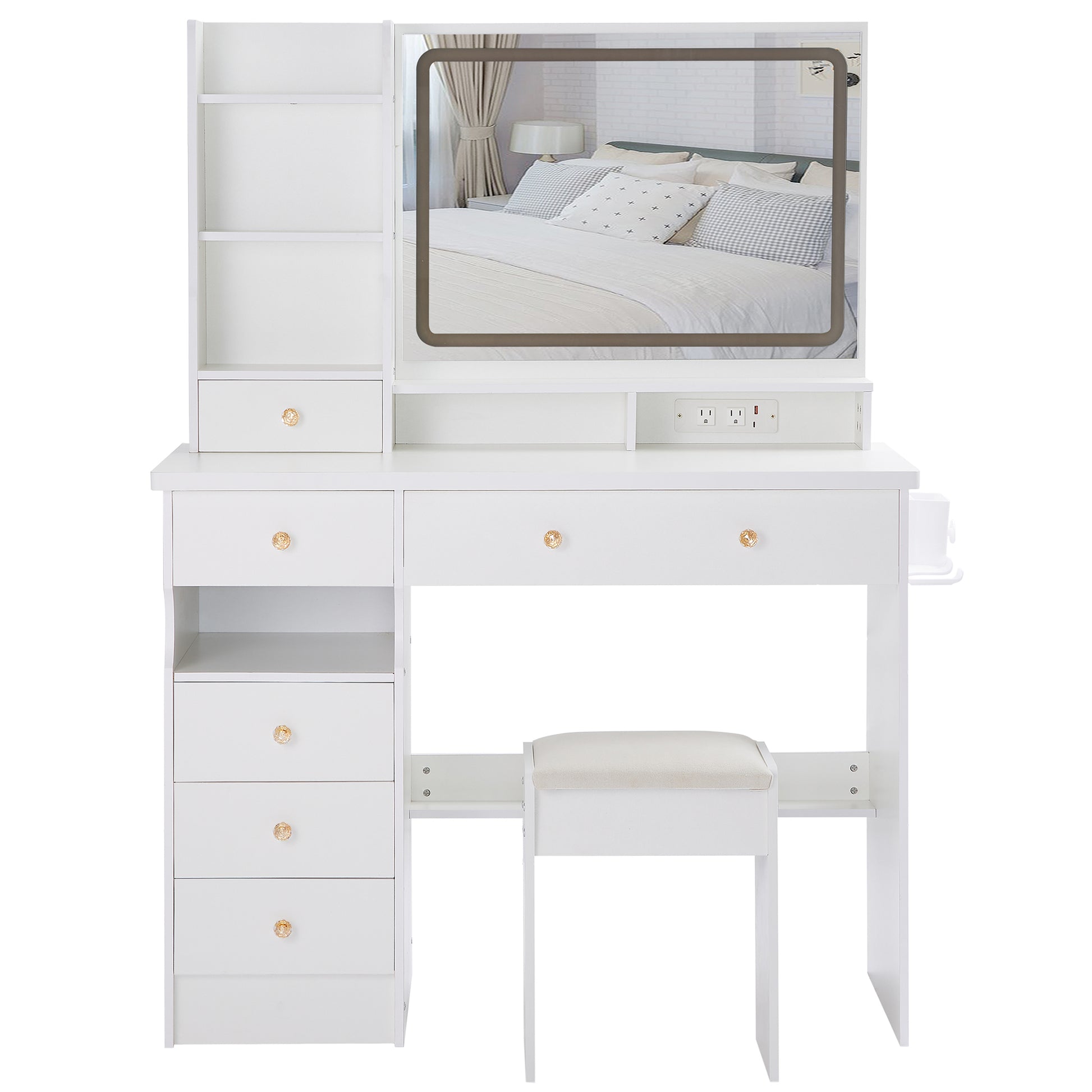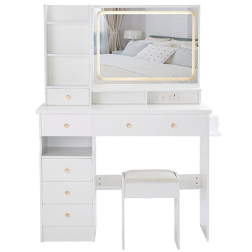 41" Large Size Left Drawer Desktop Vanity Table Cushioned Stool Dresser Set, 2 Ac 2 Usb Power Station, Hair Dryer Stand, Extra Large Touch Control Led Mirror, 3 Color Switch, Epa, Gcc, Ul