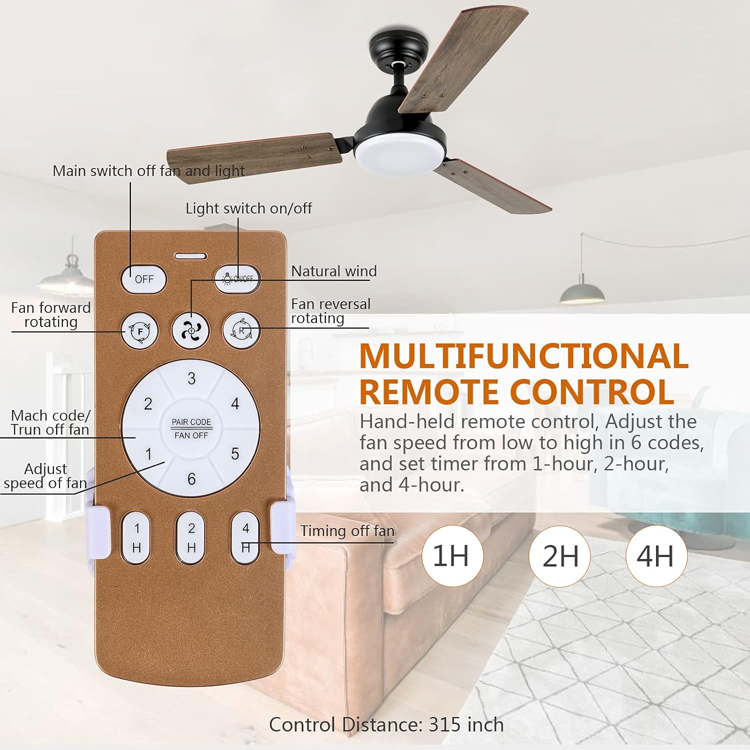 44 Inch Ceiling Fan With Led Light And Remote Control, 6 Speed Modes, 2 Rotating Modes, Timer Antique Brown Wood
