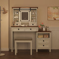 46.5'' Farmhouse Makeup Vanity Desk With Adjustible Led Lighted Mirror And Charging Station For Bedroom, Rustic Dressing Vanity Table With Side Cabinet And Cushioned Stool For Women Natural Wood Drawer 5 Drawers & Above Bedroom Antique Particle Board Mdf