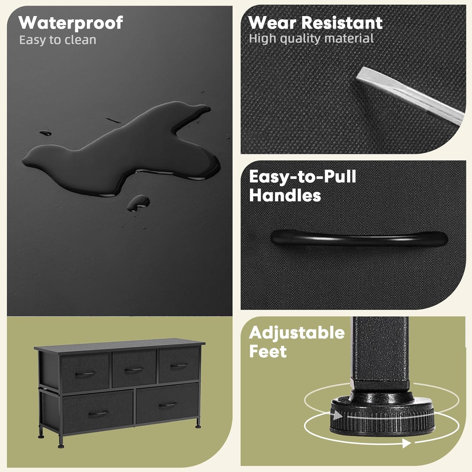 5 Drawers Dresser For Bedroom, Kidsroom Furniture, Wide Chest Of Drawers, Storage Organizer Units With Fabric Bins For Closet, Entryway, Metal Frame, Waterproof Wood Top, Adjustable Feet Black Wood