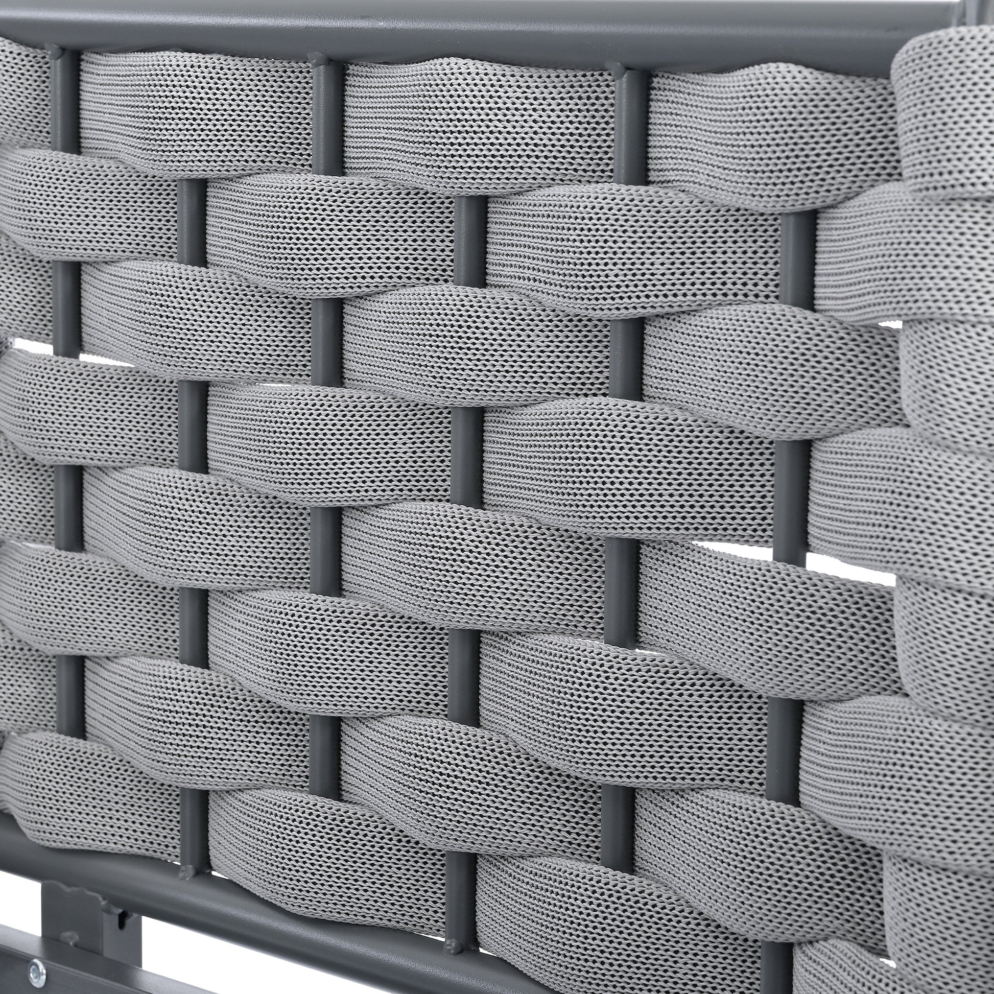 | Highlights | Metal Frame // Woven Rope // For 7 Persons // Free Combination // 3 Loveseats // 1 Corner Sofa // Curved Backrests&Armrests // Cross Legs Glass Table // 8 Pillows // 4 Cushions // Water-Resistant // All-Weather // Removable&Washable Covers // 2 Colors Available |