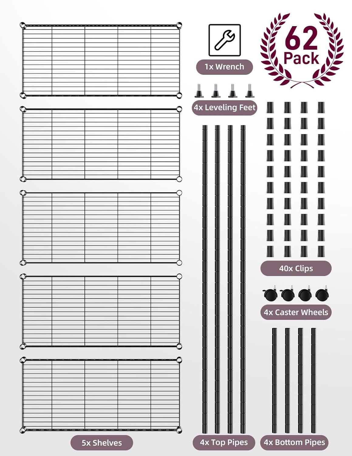 5 Tier Heavy Duty Storage Shelving Unit, 1250 Lbs Loading Capacity, 29.92" W X 13.98" D X 61.02" H, Black Black Steel
