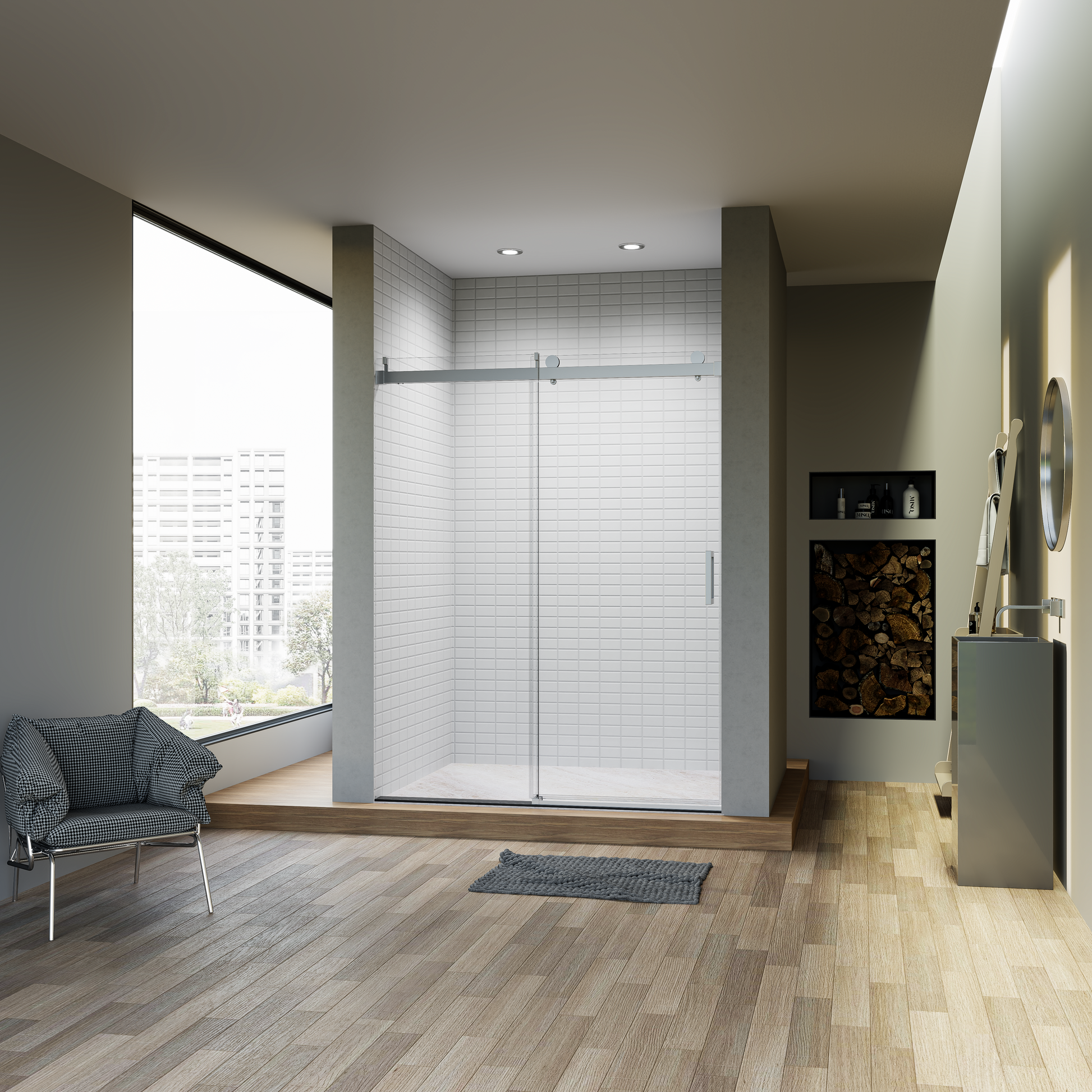 56 60" W * 76" H Frameless Single Sliding Soft Close Shower Doors With Buffer, Bathroom Sliding Shower Door, 3 8" 10Mm Thick Sgcc Tempered Glass Door, Reversible Installation, Chrome Finish Chrome Glass Metal