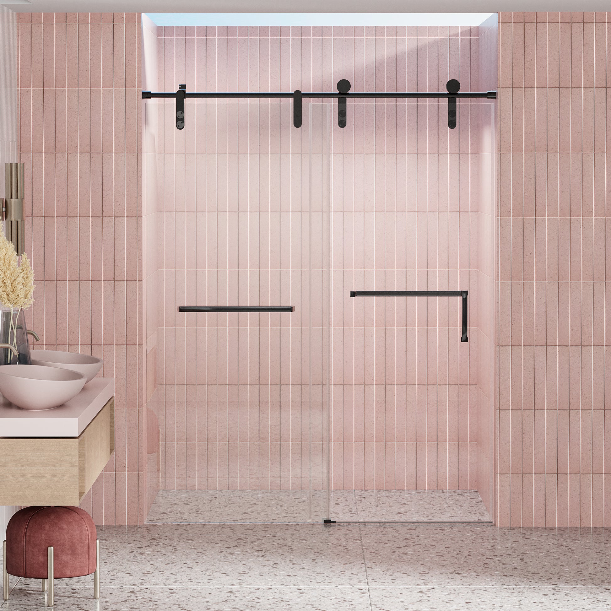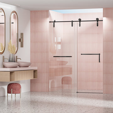 56" 60" W X 76" H Frameless Shower Door, Single Sliding Shower Door, 5 16" 8Mm Clear Tempered Glass Shower Door Explosion Proof Film, Stainless Steel Hardware, Matte Black 24D210 60Mb Combo 1 Matte Black Glass