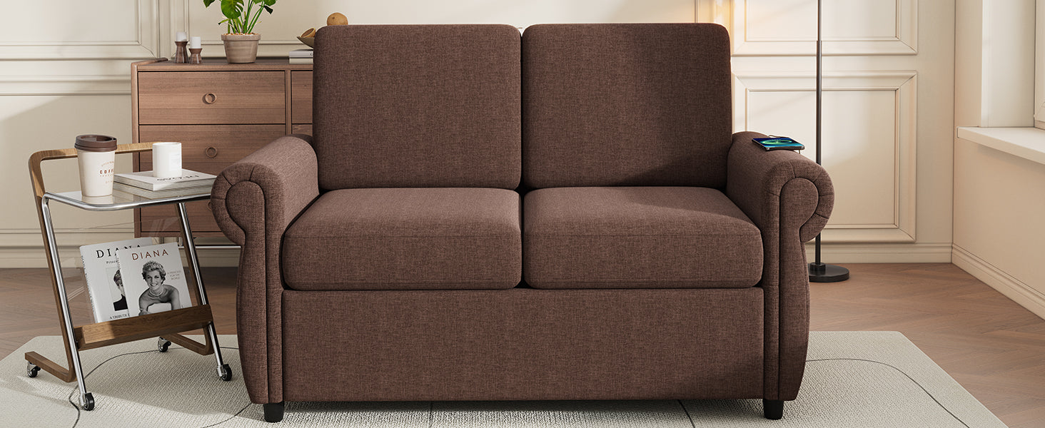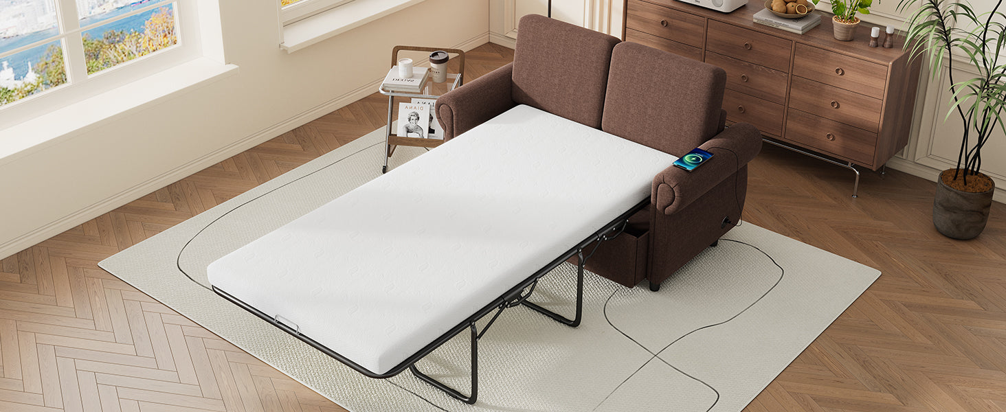 57.9" Orisfur Pull Out Sofa Bed Loveseat Sleeper With Twin Size Memory Mattress With Two Usb Ports For Living Room Spaces Old Sku:Wf305474Aad , Brown Brown Foam Linen