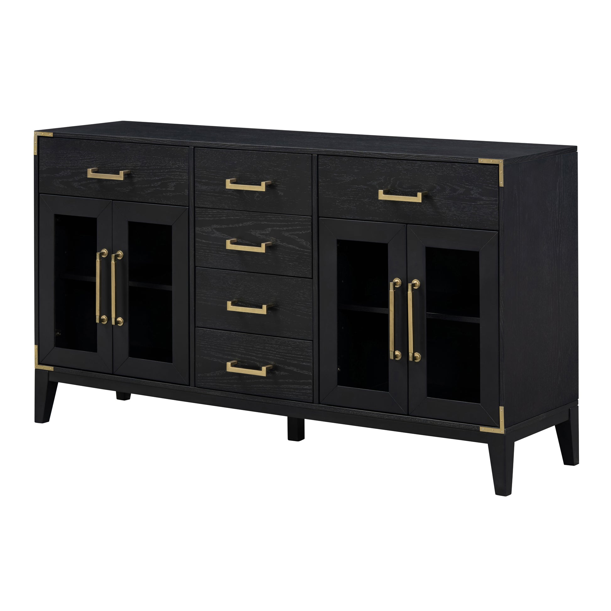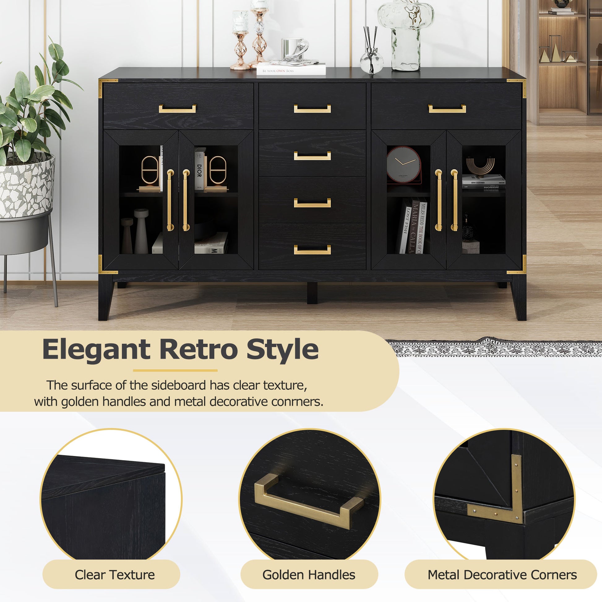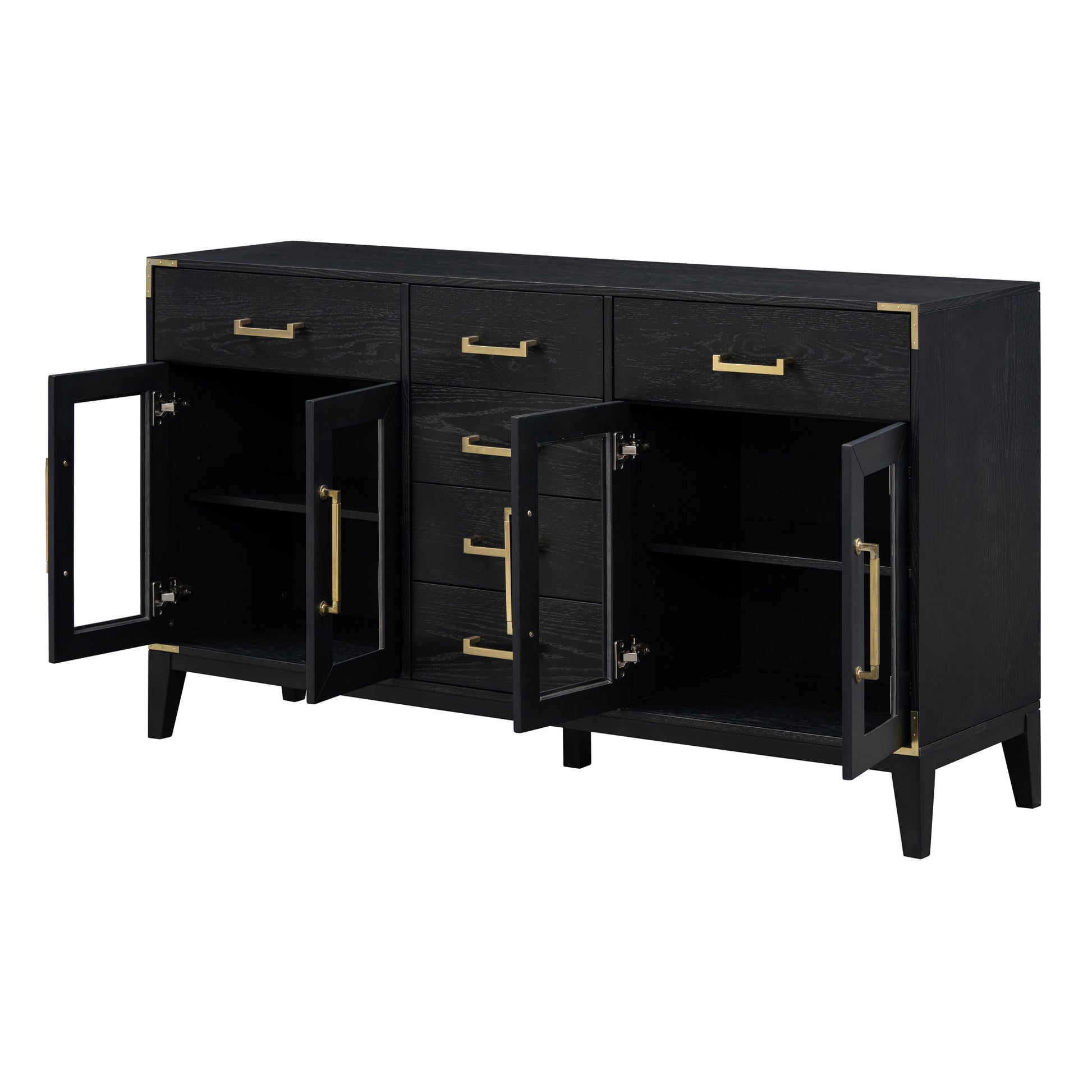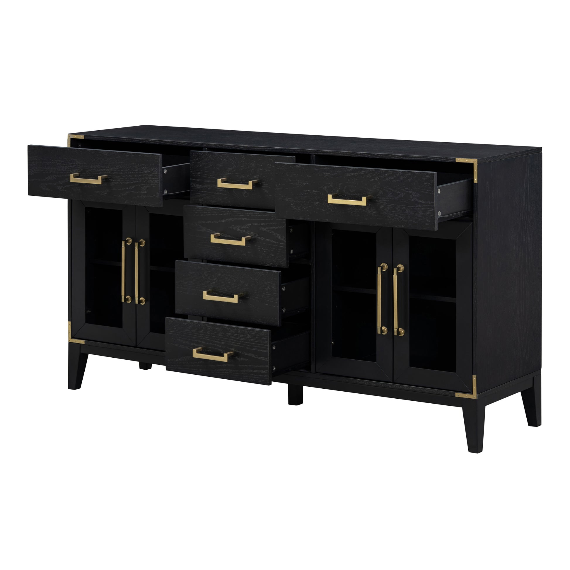 6 Drawer And 2 Cabinet Retro Sideboard With Extra Large Storage Space, With Gold Handles And Solid Wood Legs, For Kitchen And Living Room Black Black Solid Wood Mdf